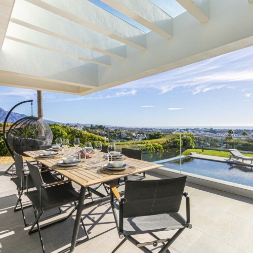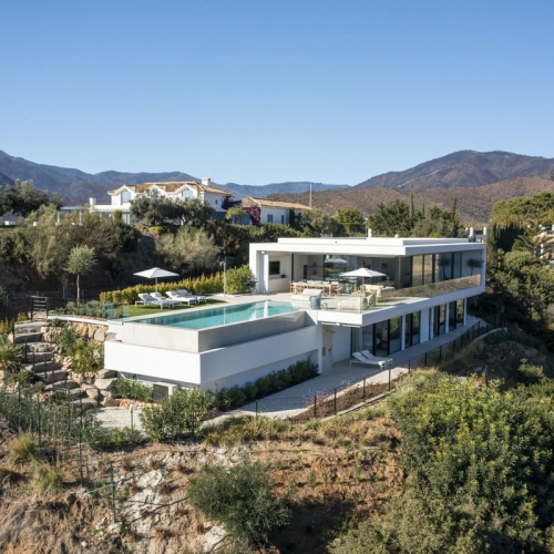 Situated on a gated community just a short walk from the beautiful village of Benahavis and all its famous restaurants, and just seven kilometres inland from the glamourous coastal hotspots of Puerto Banus and Marbella lies this contemporary south facing villa with absolutely stunning views out over the Mediterranean. This is a very spacious property with five large en-suite bedrooms distributed over three floors. The living & dining areas are open plan with lots of windows giving it a bright and airy feel throughout the day. Off the living room is a covered terrace which looks out to the heated pool and gardens, both maintained by the community and enjoy those amazing views out over the Mediterranean and La Concha mountain. The dining area is separated by the central fireplace and leads through to the large modern kitchen and breakfast area. The enormous lower level is currently used as a games room with bar, cinema and gym and enjoys natural light and views over the mountains. The standard of finish is high with underfloor heating in the bathrooms and good quality doors, windows and marble floors. The villa has private parking for two cars and plenty of storage rooms. The development is gated and has 24h security guards. This villa would make a fantastic low maintenance permanent residence or a perfect lock up and leave holiday home, which also has fantastic rental potential.