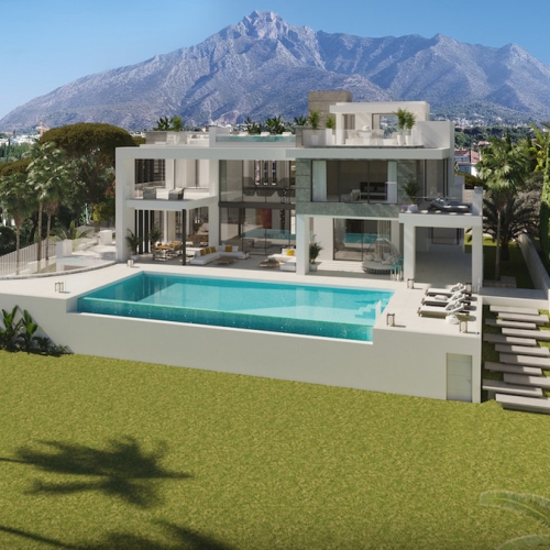 This project is a unique luxury south facing villas, which has an unbeatable location of the most prestigious area of the Golden Mile,gated community in Marbella.The development are projected by modern architecture with the idea to enjoy the views of the Mediterranean Sea and Sierra Blanca from any space of the house.The outside territory is created in the same style as the house and is its harmonious continuation. The picturesque plot of 1.850 m² has a landscaping garden , a modern swimming pool, BBQ, an outdoor parking for 3 cars.Built with high quality materials, villa has façade finished with large porcelain blocks siding with careful attention to details, including unusual architectural features and quality equipment and technology, marble and oak flooring (in the bedrooms) electric heating in whole house, an elegant lighting solution, electric shutters, innovative solutions from Schüco's Windows systems