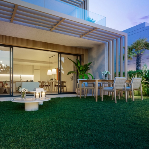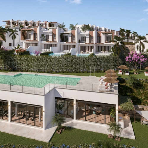 This development is a unique development of exclusive three and four-bedroom town homes boasting spectacular sea views, contemporary architectural style and the latest in-home technology. These luxury properties offer well-distributed interior spaces where living area, dining area and fully fitted kitchen with breakfast bar blend into a living space that maximizes views from over-sized triple aspect doors and windows. Connection between outside and inside space is seamless with generous covered and uncovered terraces – the perfect place to relax and enjoy the views overlooking the golf course or the south-western coastline onto the Mediterranean Sea. Each of the residences are finished to a very high standard befitting a property of this caliber with porcelain flooring and neutral tones and textures throughout allowing the owner to personalize the space to create the perfect living environment. Spacious bedrooms benefit from fitted wardrobes with the master suite boasting a walk-in closet and beautiful en suite. Outside manicured gardens envelope a private pool in some properties – a place to cool down after a game of tennis or a day on the golf course.