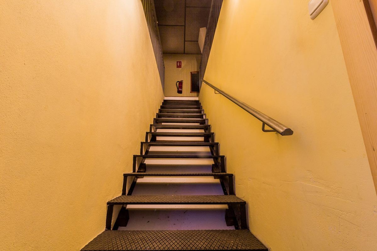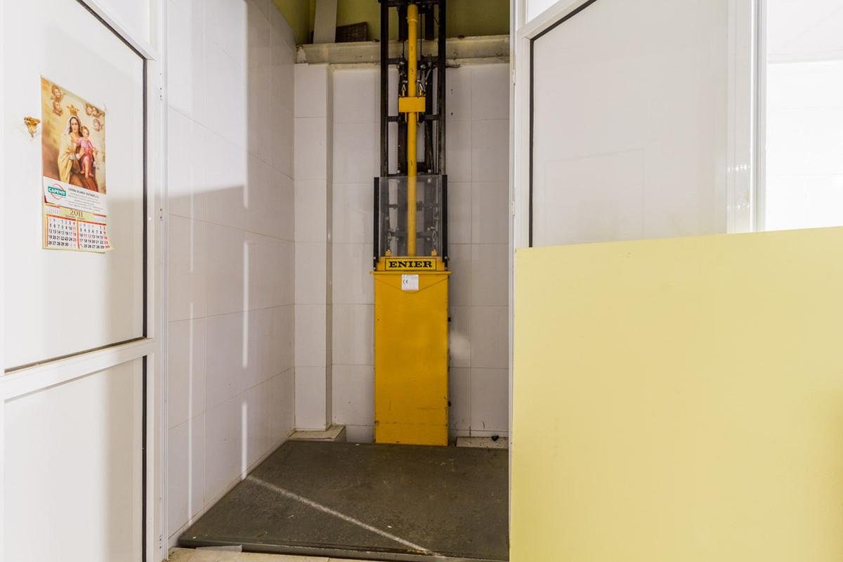 On the ground floor there is a large open area with plenty of space to store all kinds of equipment. On the far end there is a room that was initially built as a kitchen, and has a small lift to transport items to the upper floor.
