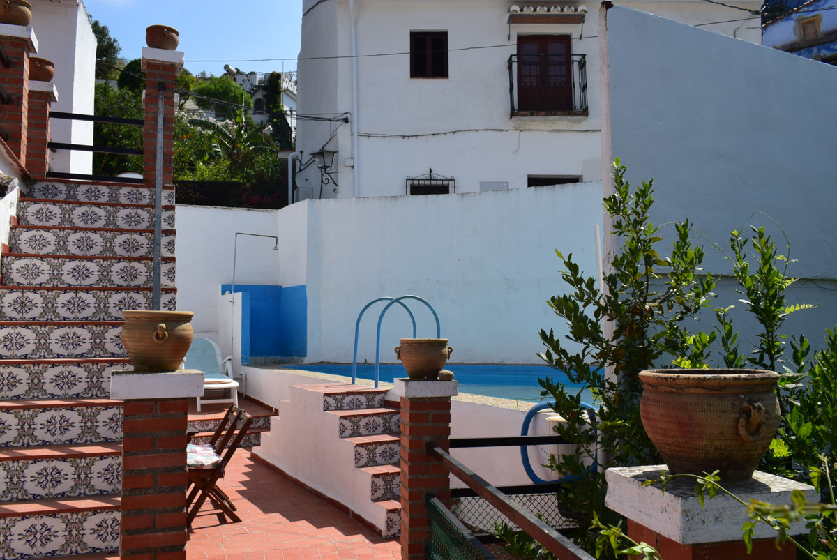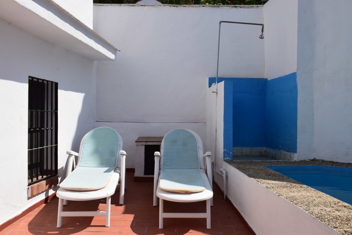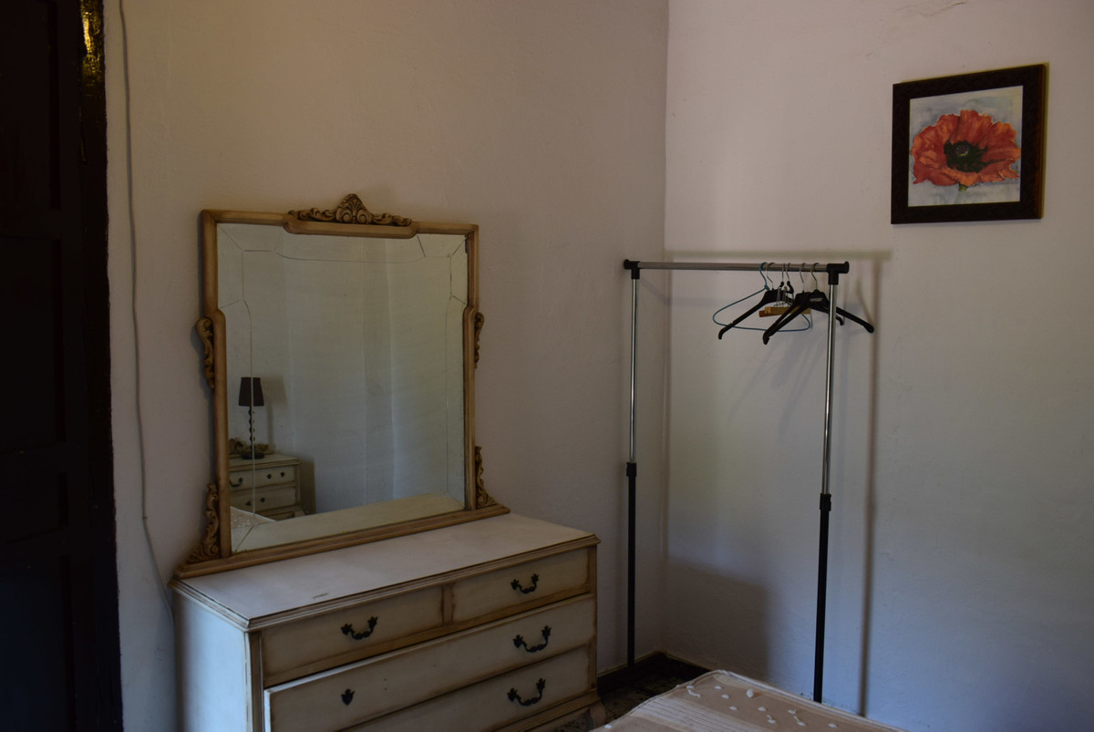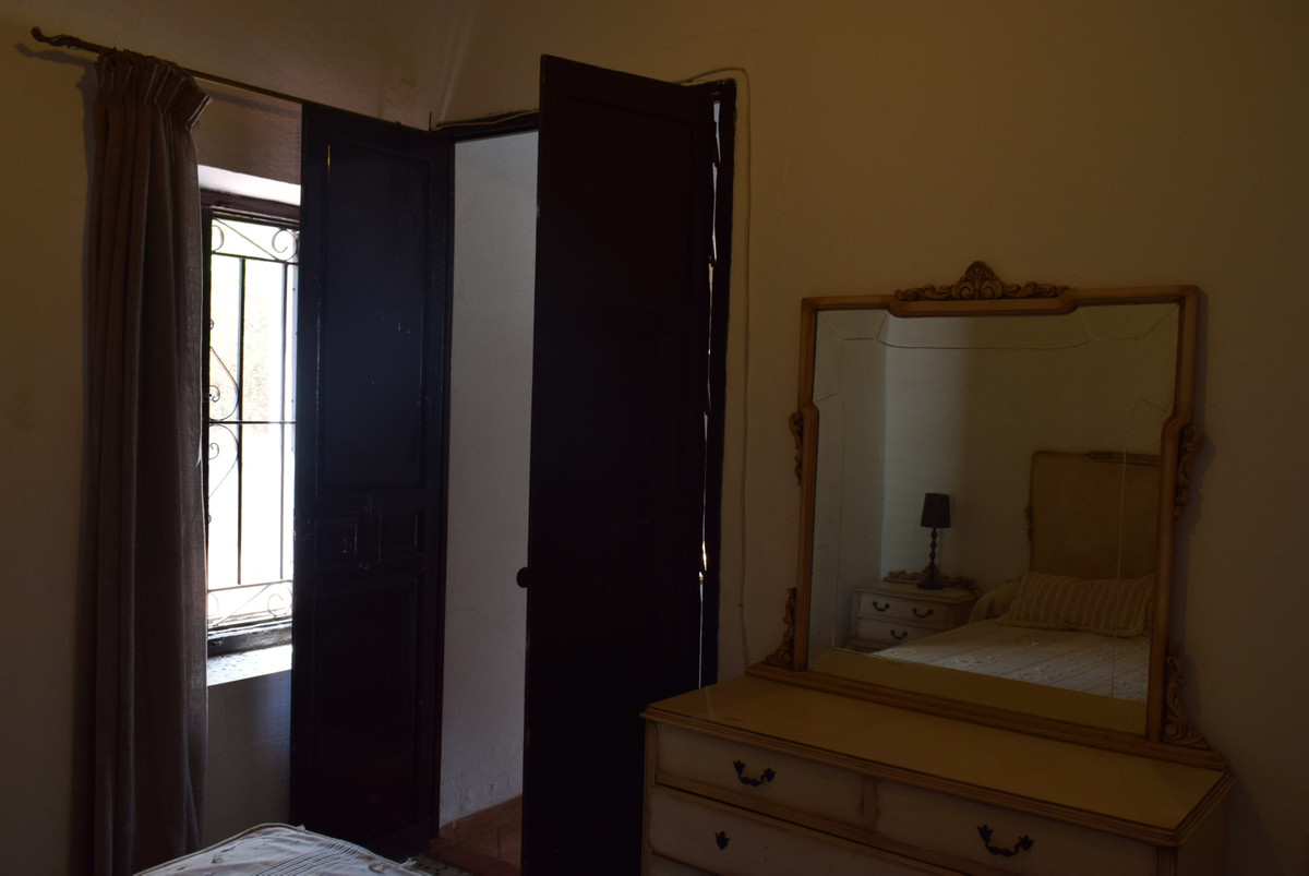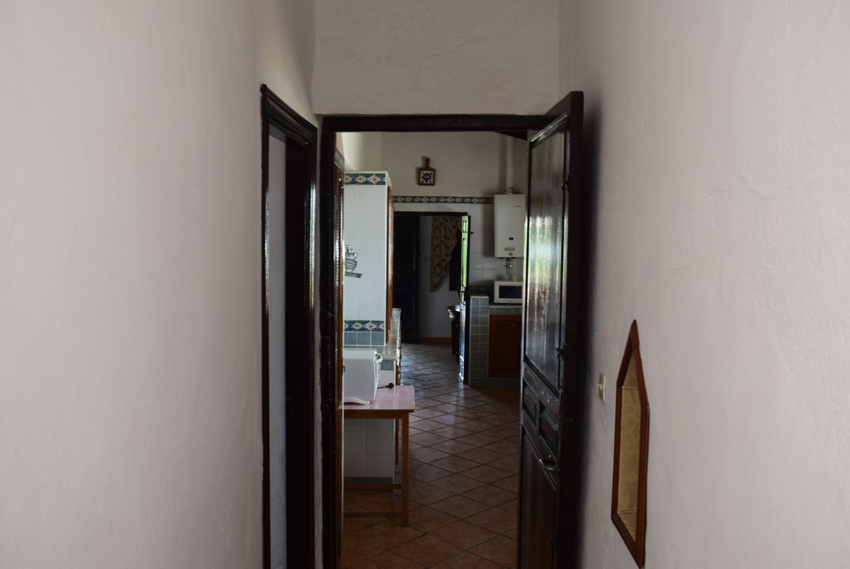 From the kitchen you enter in another corridor at the back, where you find another spacious bedroom, also with the original doors. The corridor gives access to the swimming pool in a private corner of the property.