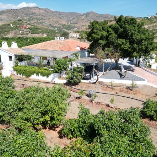 8,000 m2 irrigated farm with mango production. The villa has 160 m2 with a 60 m2 solarium, 4 bedrooms all with two windows or balconies (2 on the ground floor and another 2 bedrooms on the upper floor), 2 full bathrooms with window, large living room with fireplace and very large kitchen with all the appliances plus another fireplace and with direct access to the plot where we find an 80 m2 porch and another bathroom plus a storage room, parking area for 5 cars and the private pool with spectacular views of the valley of Velez Malaga to the coast of Torre del Mar, you can even see the sea. Without a doubt, the farm is located in an idyllic area where you can enjoy the countryside and tranquility. Access to the farm is by a private concrete road of 1 km, from Vélez Málaga it takes us 15 minutes to reach the farm. There is also another 1,000m2 plot with a 400 m3 water tank, there is also a reserve cistern under the pool and the entire farm has automatic irrigation for the Mangos. It is sold with all the furniture and all the constructions are registered and legal, IBI is paid for the villa € 562.