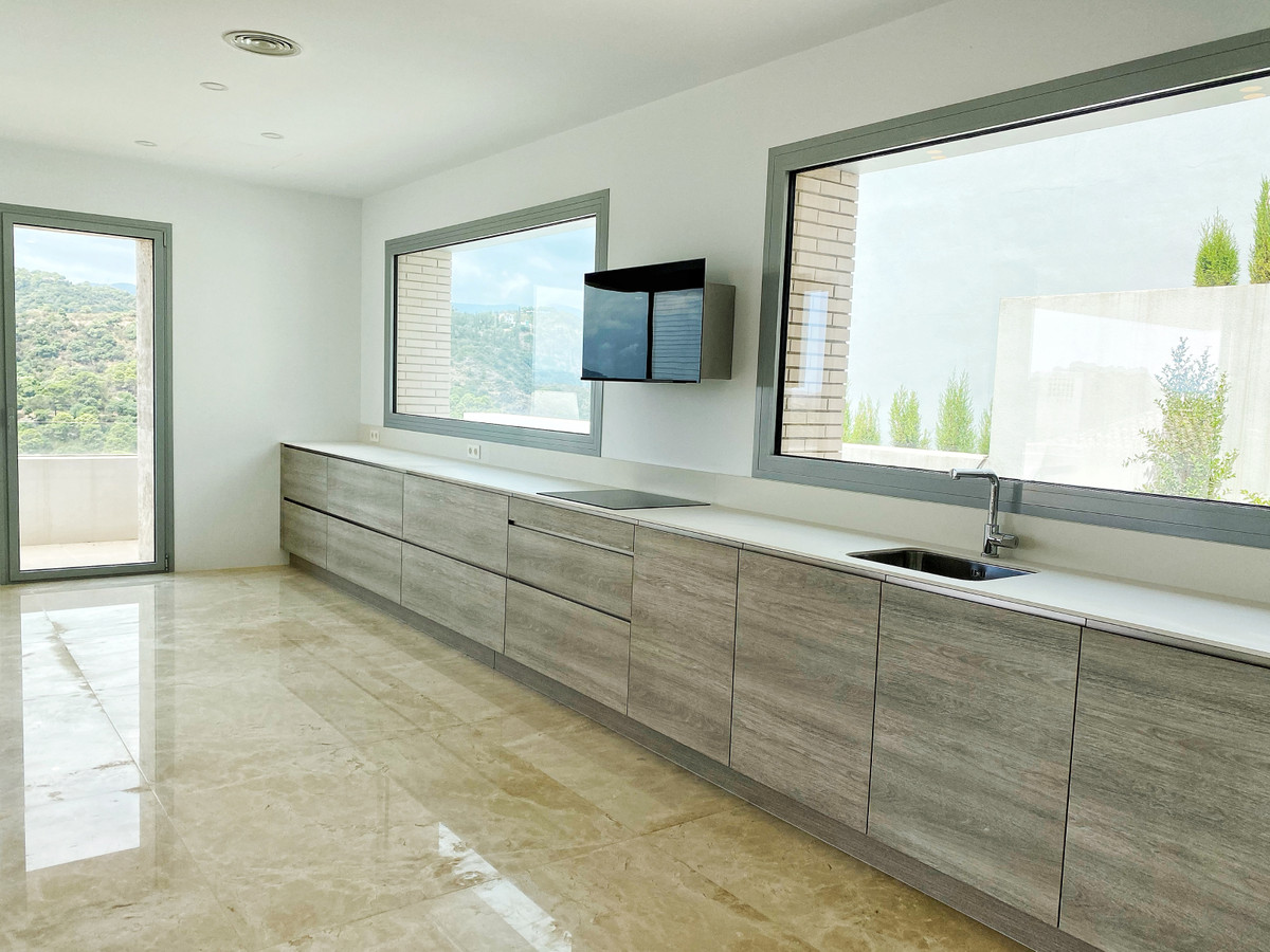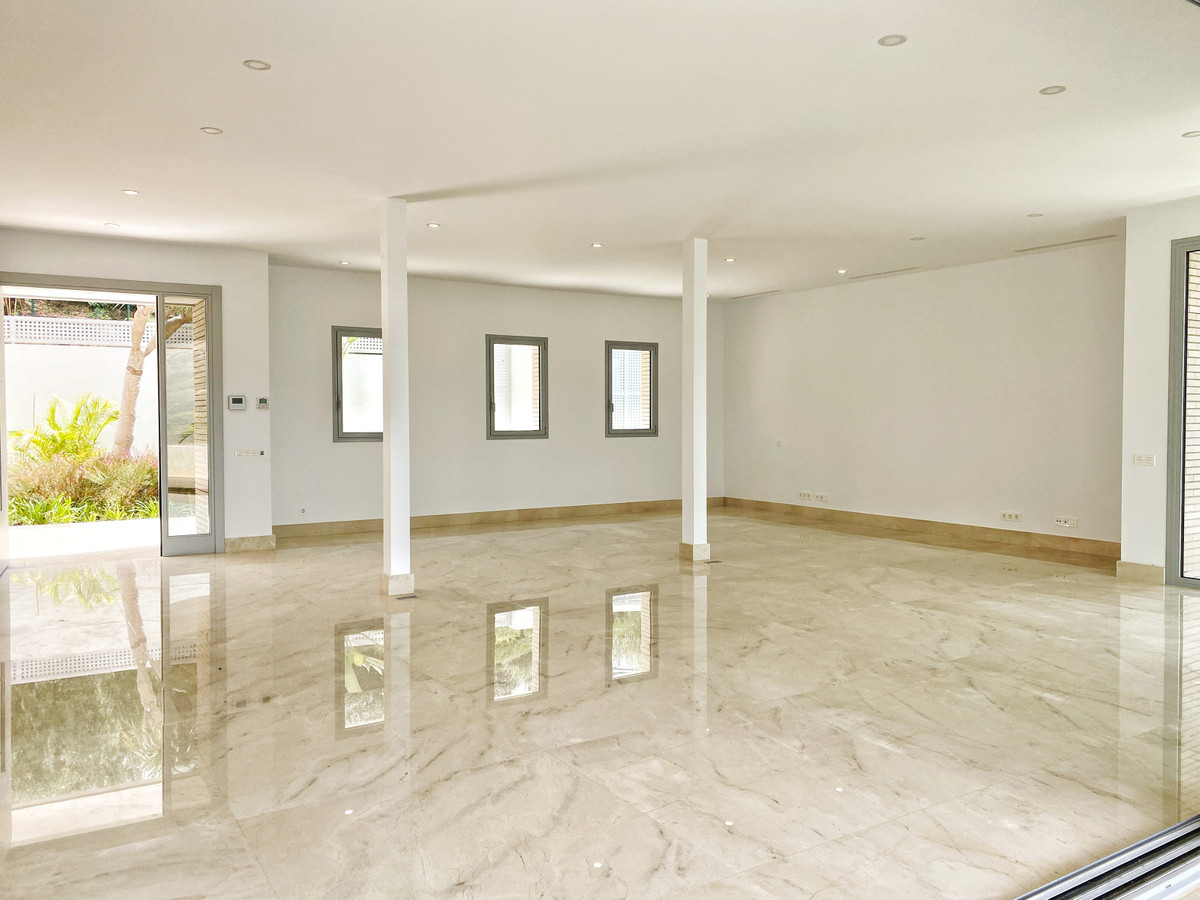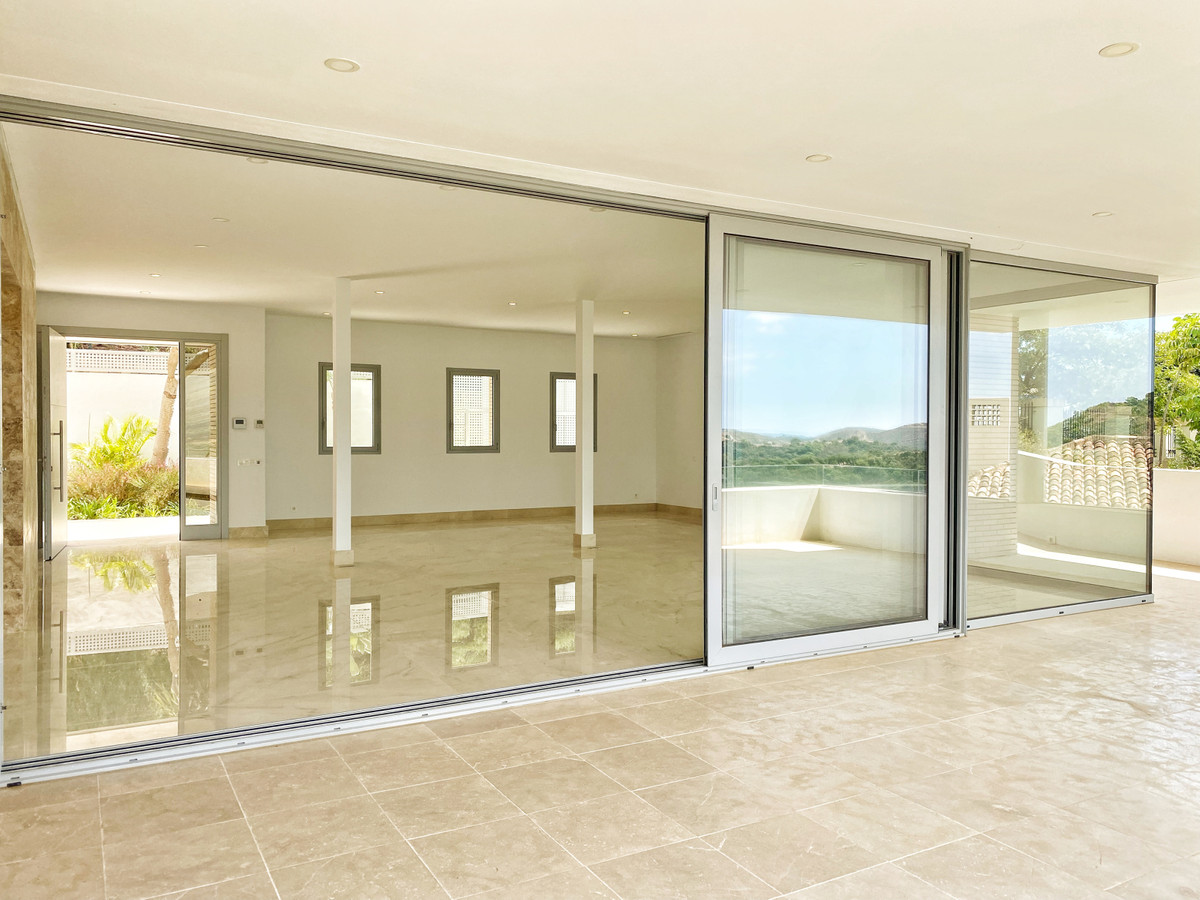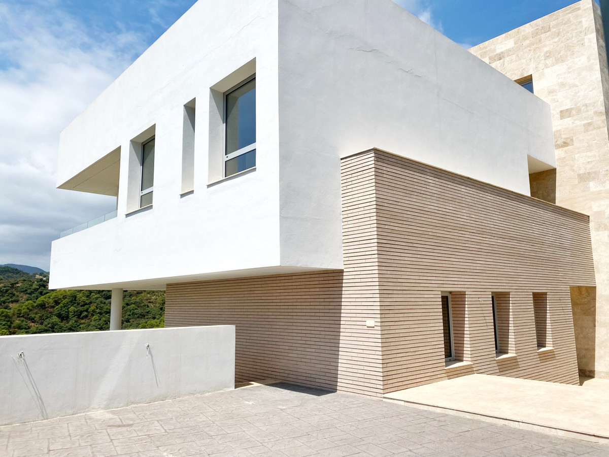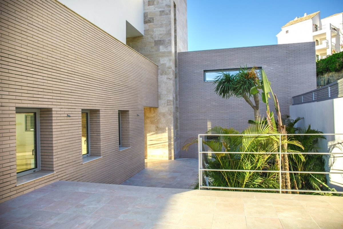 Newly built contemporary villa, finished on two floors plus basement, plus roof top, accessible by stairs and elevator. It is located in a natural environment, surrounded by golf and mountain, providing nice open views to those, panoramic sea view from the solarium and good sea view from some areas of the house. It is prepared to install amenities such as gym, spa area, cinema room and a wine room. It is a very spacious property, built with top quality materials, such as natural stone and Travertino marble floors. A very nice area with 24h security and a club house that offers an 18 holes golf course designed by Severiano Ballesteros, a tennis club, a bowling alley, restaurants, shops and a gym.