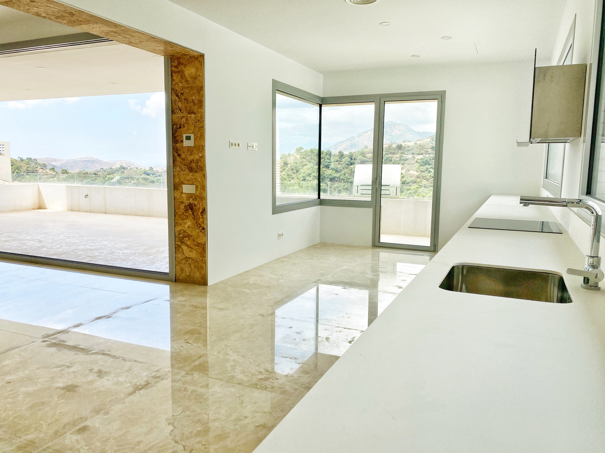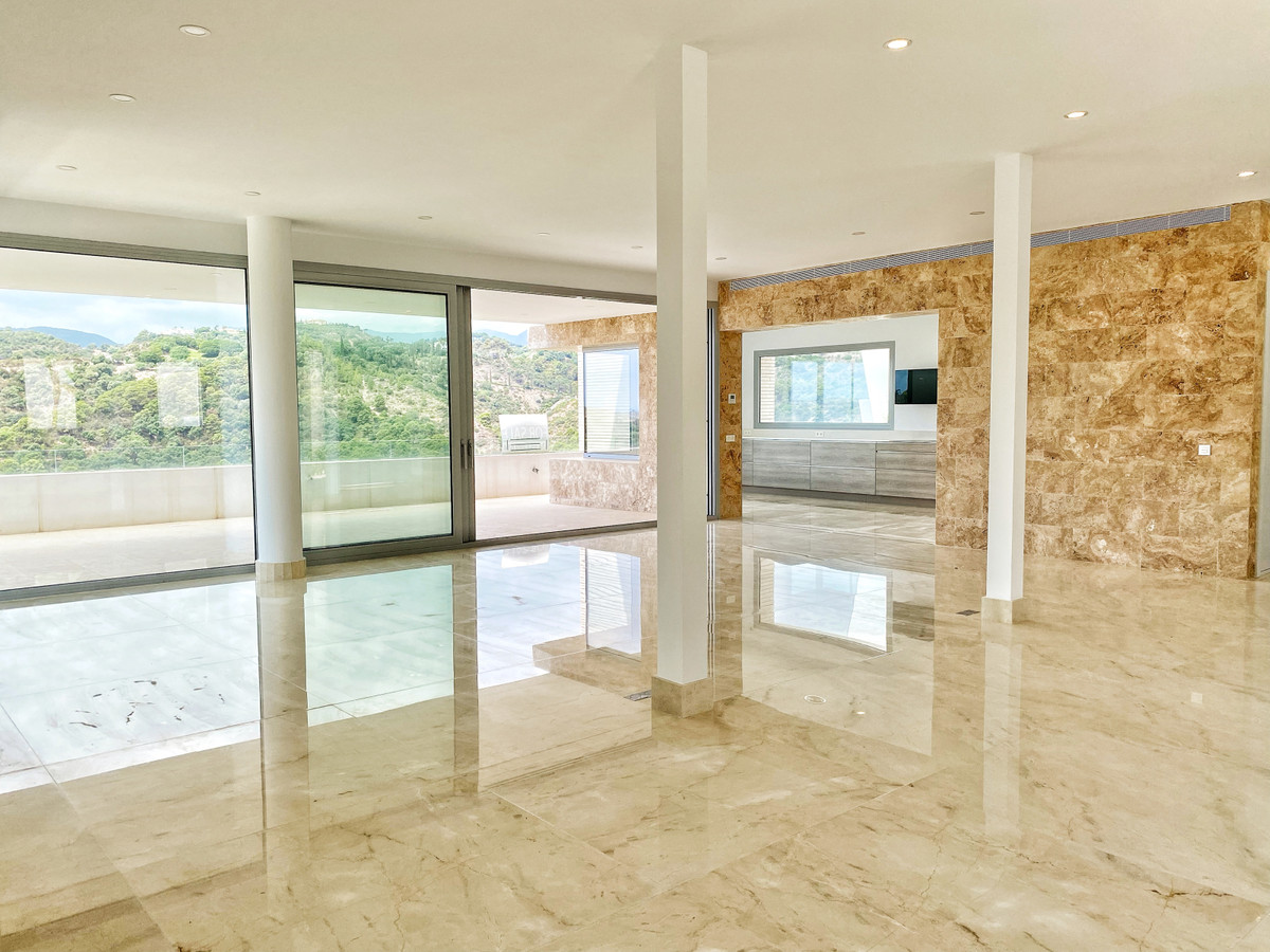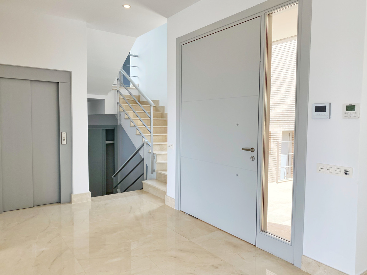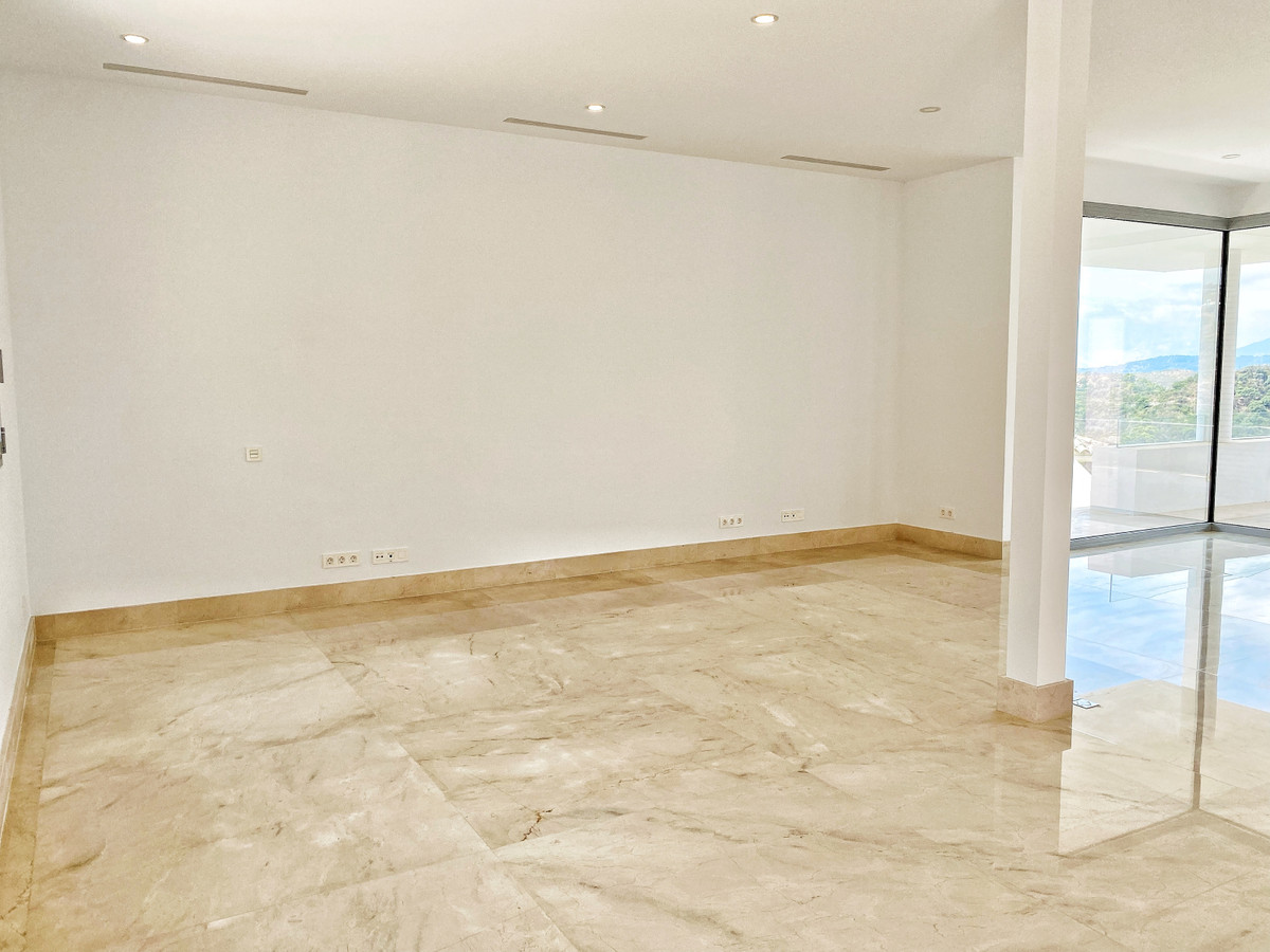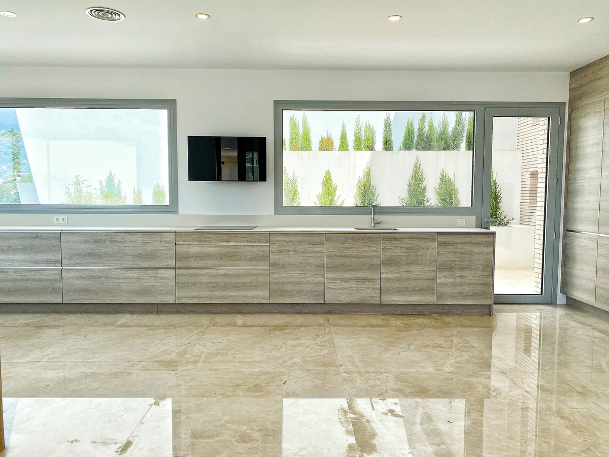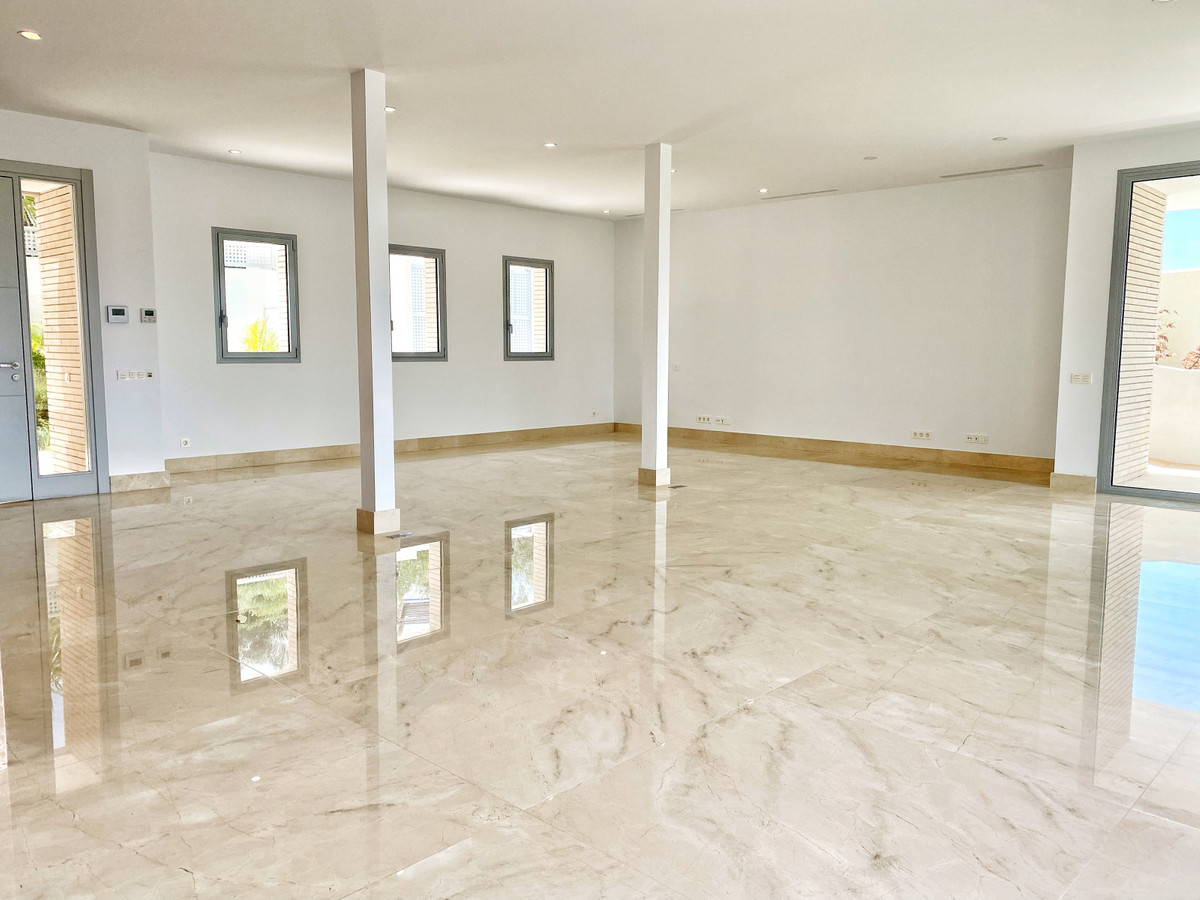 Newly built contemporary villa, finished on two floors plus basement, plus roof top, accessible by stairs and elevator. It is located in a natural environment, surrounded by golf and mountain, providing nice open views to those, panoramic sea view from the solarium and good sea view from some areas of the house. It is prepared to install amenities such as gym, spa area, cinema room and a wine room. It is a very spacious property, built with top quality materials, such as natural stone and Travertino marble floors. A very nice area with 24h security and a club house that offers an 18 holes golf course designed by Severiano Ballesteros, a tennis club, a bowling alley, restaurants, shops and a gym.