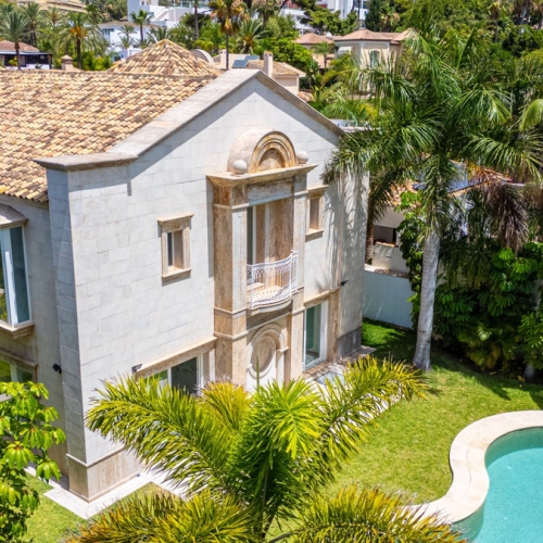 Mediterranean style villa with 567 m2 built on a beautiful plot of 1,400 m2 in the residential area of Nagüeles, on the Golden Mile of Marbella.