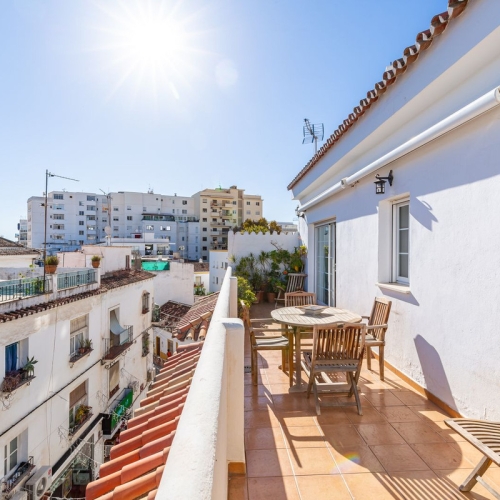 Very large penthouse in the center of Marbella. Sought after location with all services and amenities at door step and just a stroll to the beach. This ample and full of light top floor apartment includes four ample bedrooms with sufficient cupboard space; two large terraces with open views to the mountain and open to the South. Closed gated complex. A must view. Great for a large family.