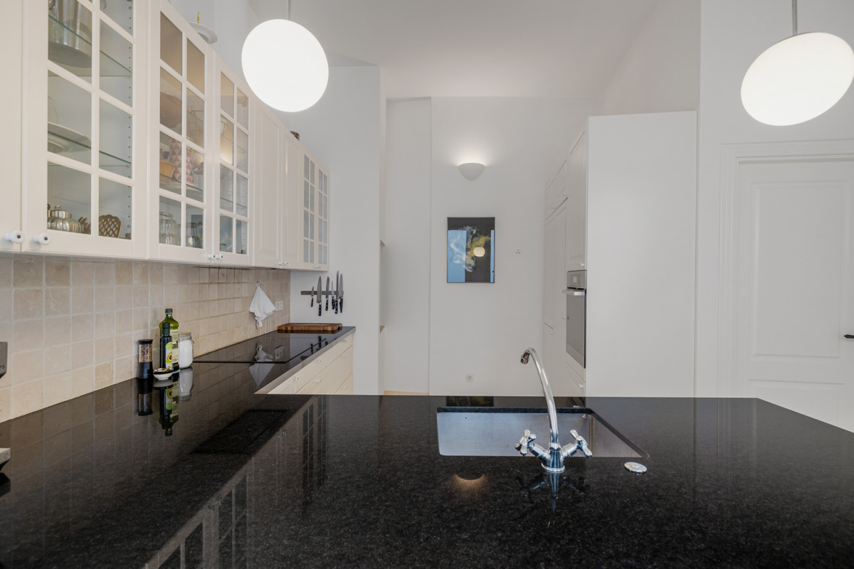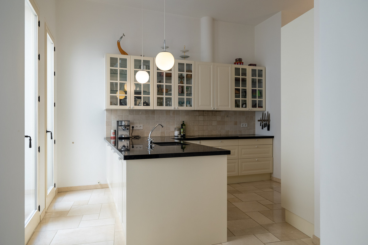 On the first floor you will find the livingroom with a fireplace, dining area and high-end kitchen with all appliances. High windows and skylight gives the space a warm natural light for your cooking time and dining events.