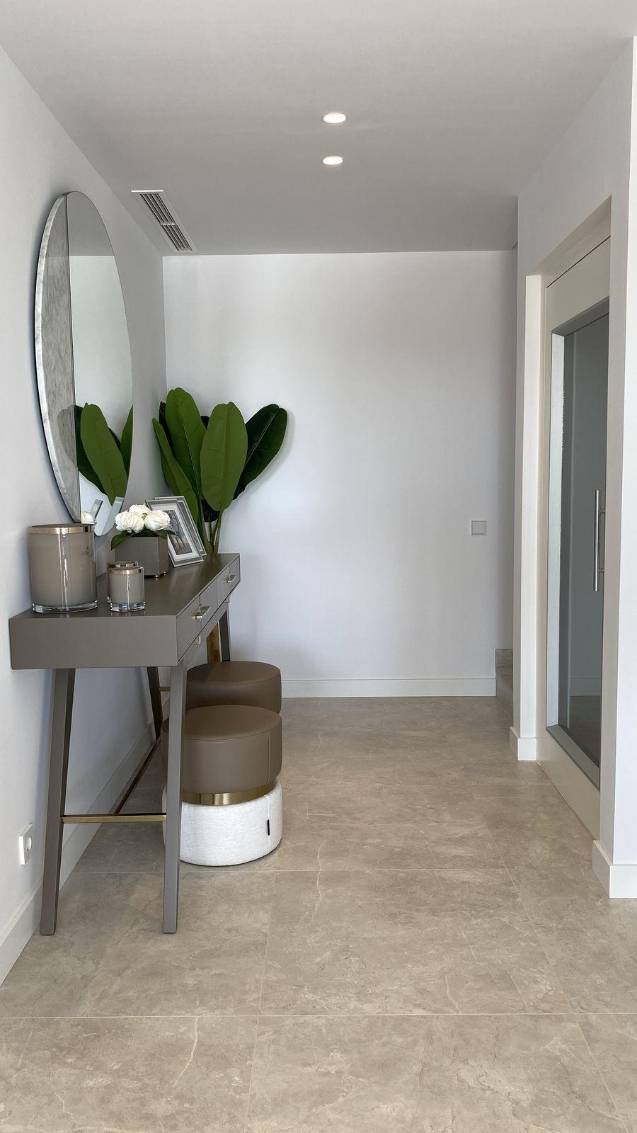You enter the Villa on the 1st floor where you find 3 bedrooms each facing South/west with stunning views to Golf, Sea and mountains. The Master bedroom is a great size with wonderful en-suite bathroom with Walk-in shower modern bathtub, double sink, toilet and bidet. Ample fitted wardrobes throughout the property and underfloor heating individually controlled.