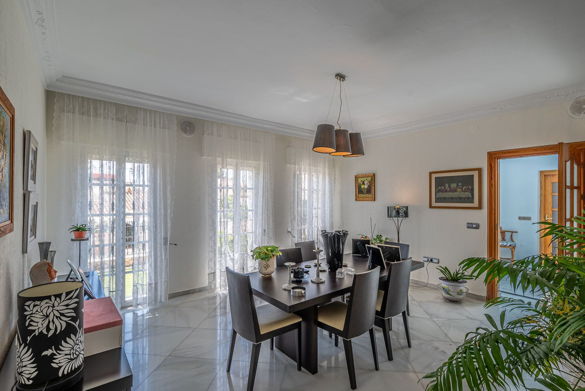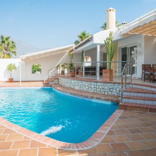 Magnificent Villa for sale with pool and private garden very close to the beach near the Puerto Marina in Benalmádena Costa. It is a villa with personality and its own style. Contemporary architecture on the outside joins with the Andalusian style to enjoy the Malaga climate throughout the year. The villa has 4 bedrooms with bathrooms en suite, two bedrooms with terraces of about 40 m2 each with sea views, dressing room, separate kitchen, dining room, large living room, Andalusian patio, basement with kitchen and guest room, sauna. The house has a private garden with palm trees, a private pool, a rest area with barbecue. Underground parking for two cars and open parking for two more cars. Near the villa there are shops, supermarkets, train station. 15 minutes walking to the beach.