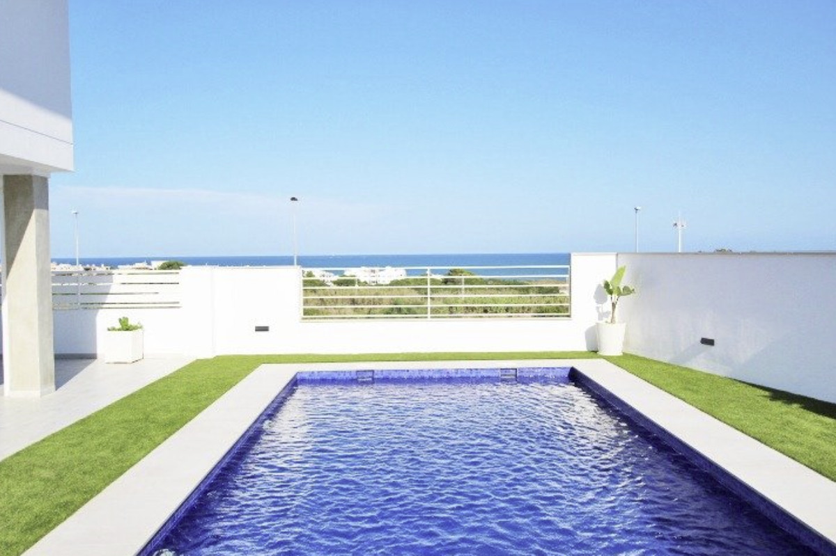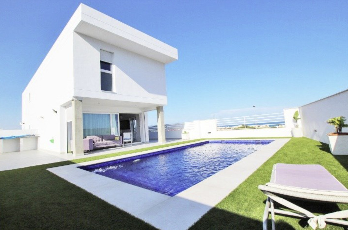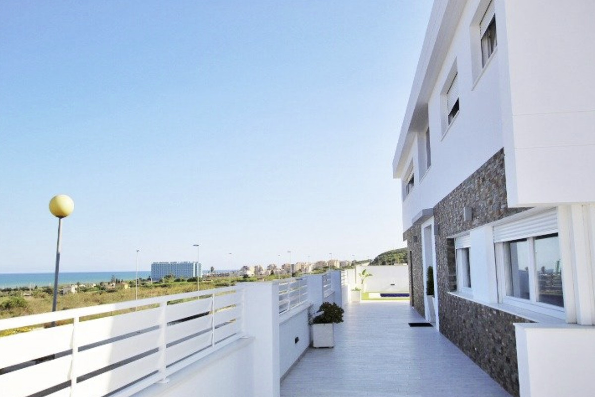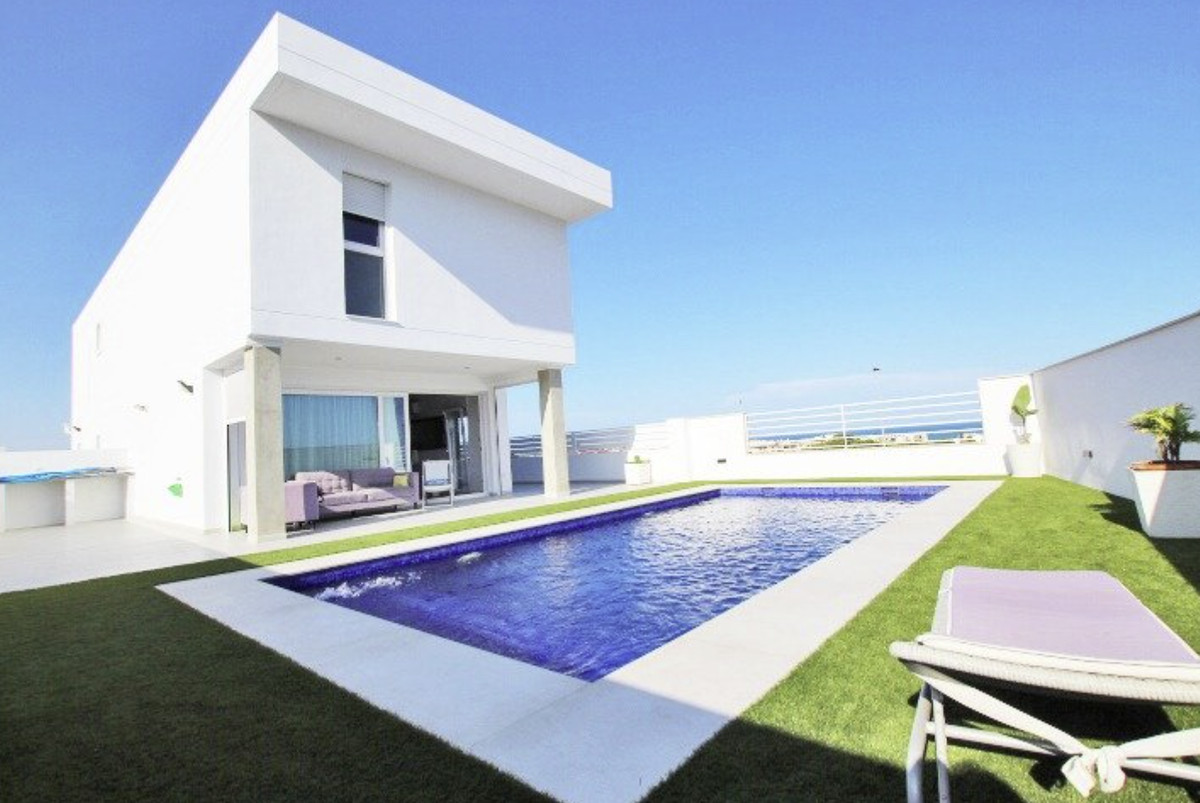 Our real estate agency offers a 380 m2 villa built on a 375 m2 plot with sea views from all rooms in the house. The corridor on the first floor has a view of the sea. The living room is located on the main floor next to the kitchen and a service bathroom. Very spacious house, where you can receive all your guests and even hold celebrations with a large number of friends. The kitchen is an island, with integrated appliances and a large number of built-in cabinets in which all the equipment is integrated. The entire main floor has large windows with sea views. The carpentry that makes up all the windows is made of PVC with a double chamber and 8 mm double glazing, which results in perfect soundproofing inside the house. The interior carpentry are white lacquered wooden doors. The façade is made of monolayer painted in water-repellent white and decorative brick in its lower strip. The first floor has a suite with a large bathroom with bathtub and shower, from this last room there are frontal views of the sea. The master bedroom has a large dressing room on the side. The main bedroom area is separated from the rest of the rooms by a glazed corridor with a viewpoint overlooking the sea, which provides great light to the house. And two large bedrooms, one of them set up as an office to work from home or to relax having a coffee looking at the sea. On the second floor there is an individual bathroom to service the bedrooms. The basement has a gym area, and more than 100 m2 to park cars, it also has two large storage rooms to use as a cellar. The exteriors are with views of the sea and the mountains that surround the fantastic town of Guardamar del Segura. On the porch there are unobstructed views of the sea and the mountains next to the pool. The pool is 4m x 8m in size and is illuminated: it can be illuminated with different shades of colour. A villa to enjoy immediately and only 500 meters from one of the best beaches in the Mediterranean Sea.\n