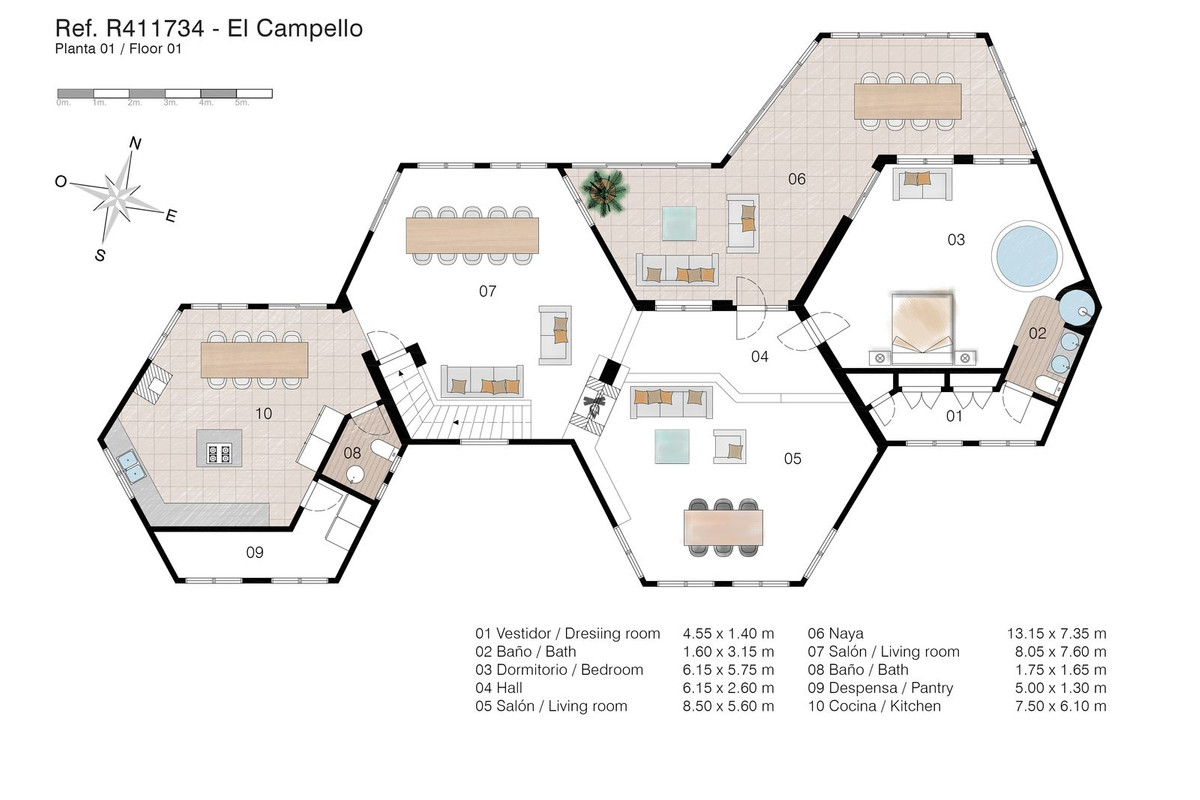 In Virgen de la Merced, Campello North, lies this espectacular hilltop estate with commanding views of the mediterranean and coastline to both the north an to the South. Villa Passiflora is 20km from Alicante to the north, 20 km from Finestrat and just 27 minutes away from Alicante international airport. The villa is just 1 km away from a sandy cove "Cala baeza" and only 9 minutes from El Campello Marina and Playa Carrer la Mar, 15 km to nearest golf course. Villa Passiflora is unique in its wonderful design, its hilltop location and setting, the 2300m2 of flat land with room for a tennis court or another villa and the complete privacy that it offers its owners.