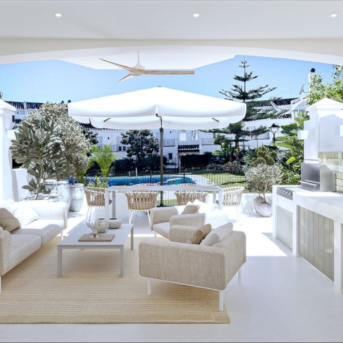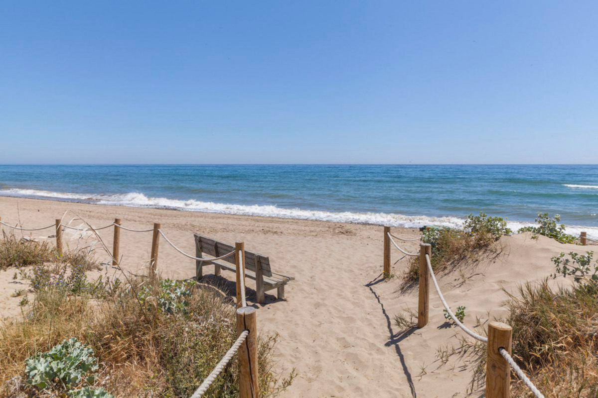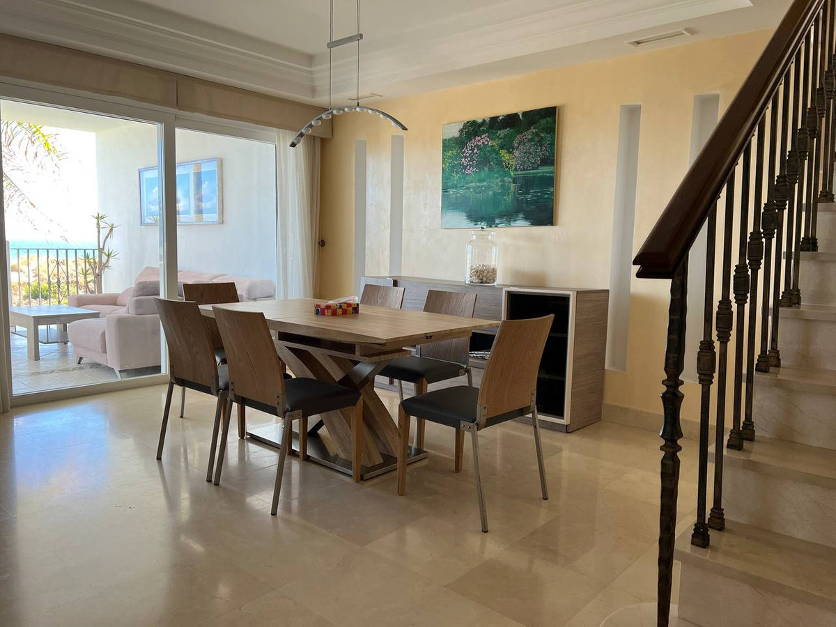 House for sale and for rent in Arenas de Bahia Marbella, Marbella with 4 bedrooms, 5 bathrooms, 4 en suite bathrooms and with orientation south, with communal swimming pool, private garage (2 parking spaces) and communal garden. Regarding property dimensions, it has 329 m² built, 350 m² plot, 229 m² interior and 100 m² terrace. Has the following facilities front line beach, amenities near, transport near, air conditioning, fully furnished, fully fitted kitchen, utility room, fireplace, marble floors, storage room, alarm, solarium, security entrance, dining room, barbeque, security service 24h, telephone, guest toilet, private terrace, kitchen equipped, living room, sea view, mountain view, laundry room, internet - wifi, covered terrace, 24h service, electric blinds, fitted wardrobes, gated community, garden view, pool view, panoramic view, beachside, doorman, underfloor heating (partial), close to sea / beach, close to golf, excellent condition, close to shops, close to town, close to schools, surveillance cameras, individual a/c units, ground floor patio, aerothermics and internet - fibre optic.