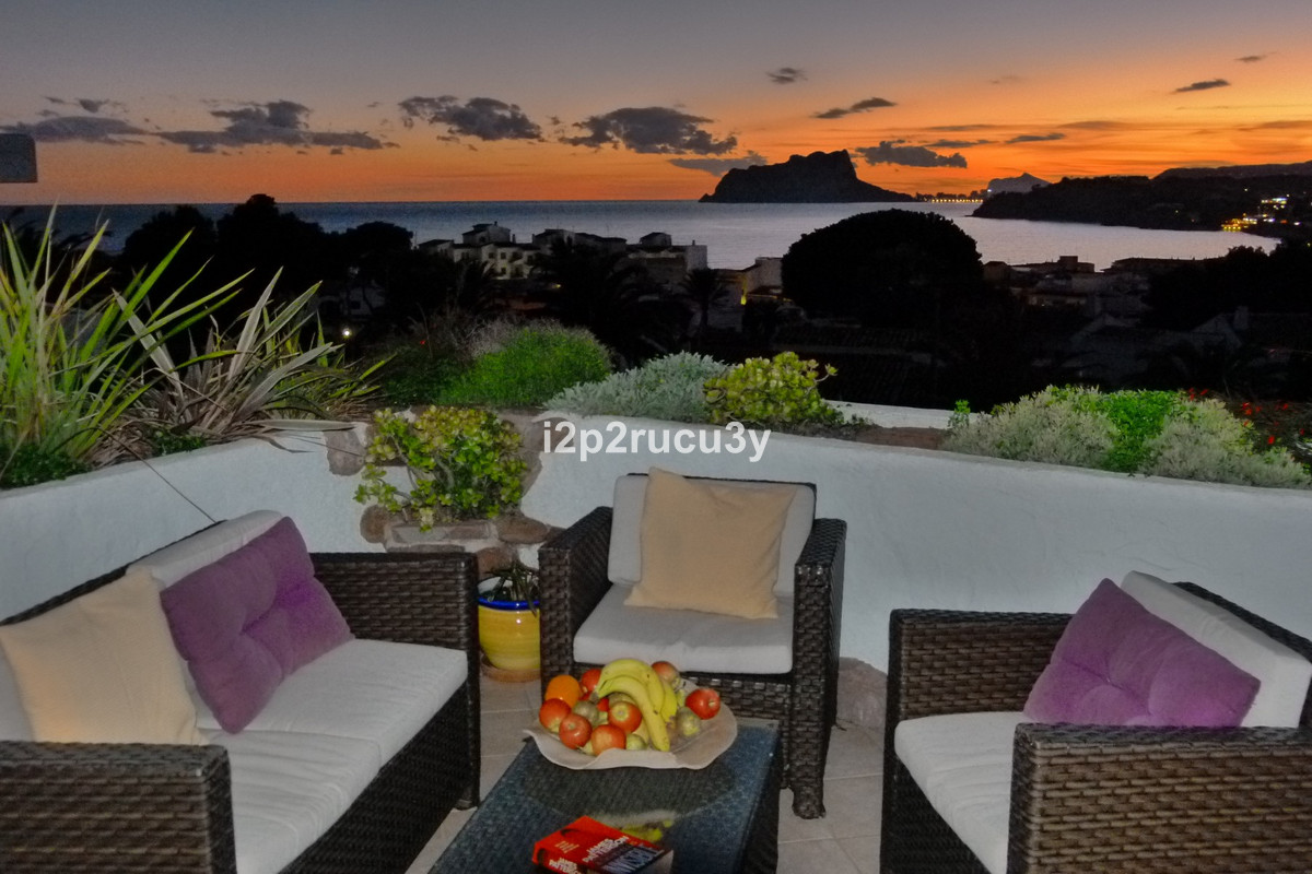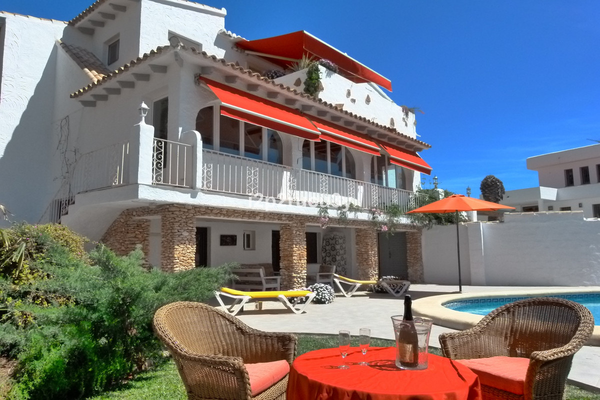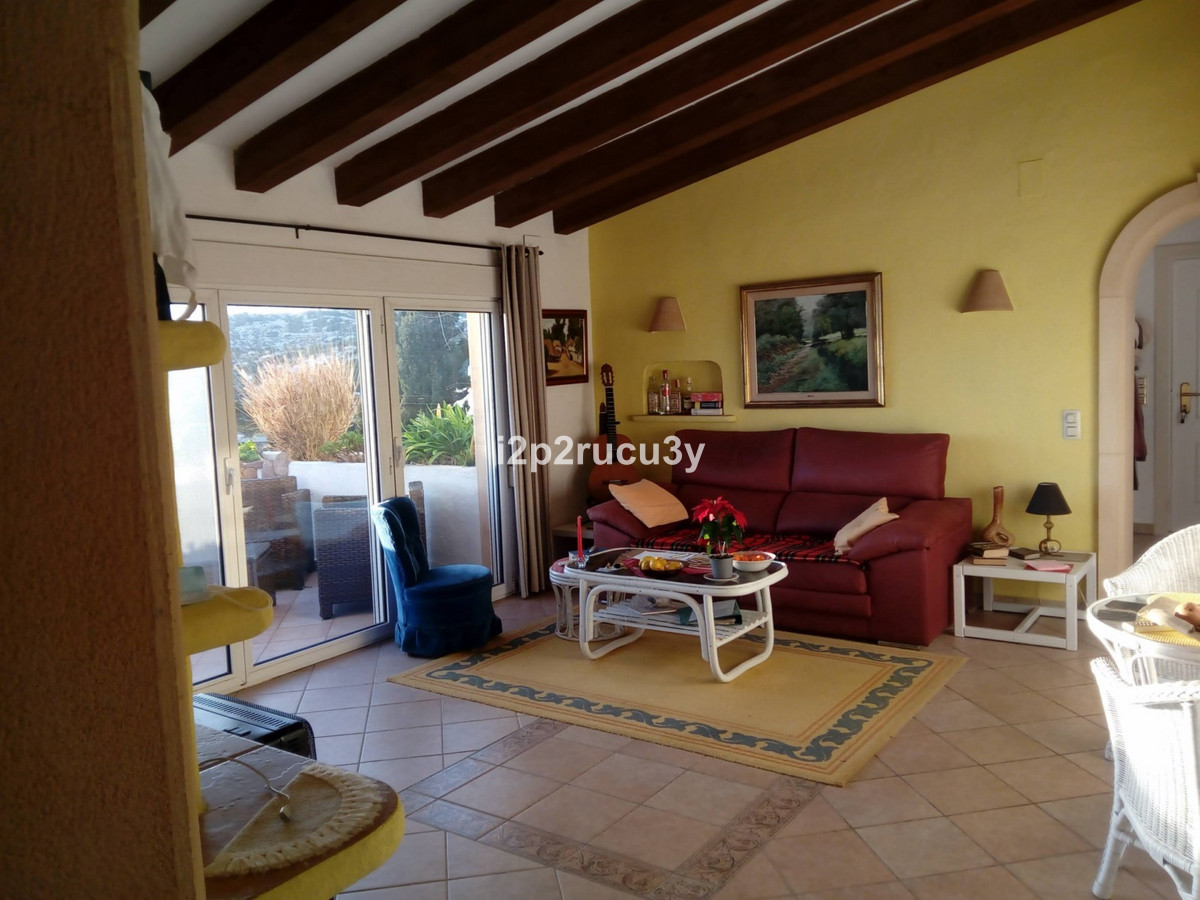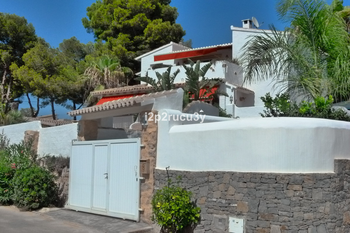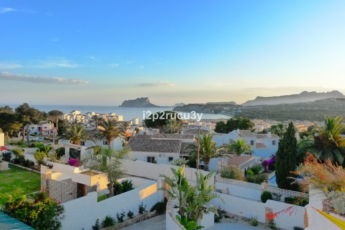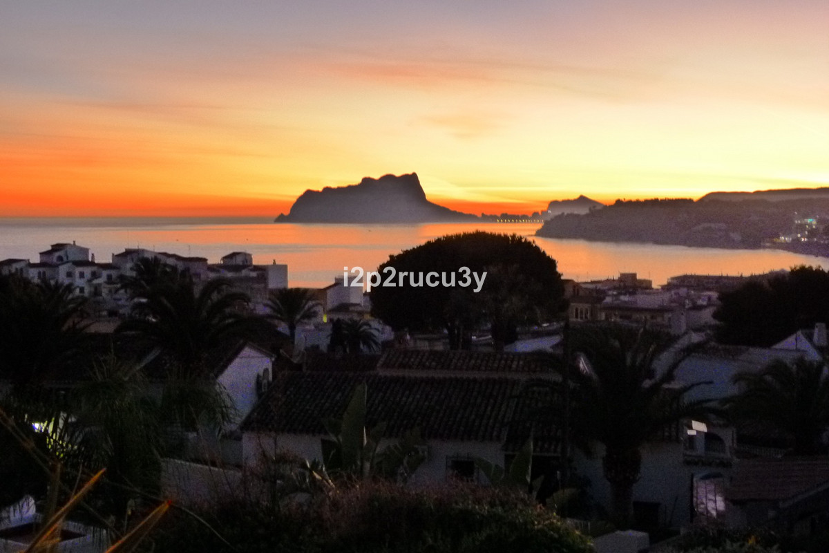 The property has 3 levels.  The lower part has 1 bedroom, 1 bathroom, the pool with garden, terrace and bbq area.  Via a few steps, we have access to the main living floor with a large glazed naya with lovely views over the town and the sea.  There is a spacious living-and dining room, open kitchen, a nice fireplace, 2 bedrooms and 2 bathrooms.  With an interior and exterior staircase you can reach the top floor with a wonderful living room with a terrace and with one of the most spectacular sea and panorama views in Moraira.  In this higher part of the house is also a fully equipped kitchen, 1 bedroom with bathroom and a hobbyroom.