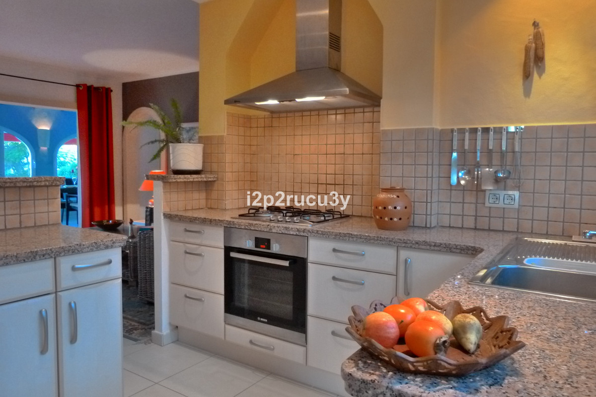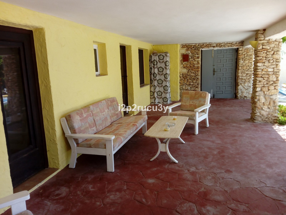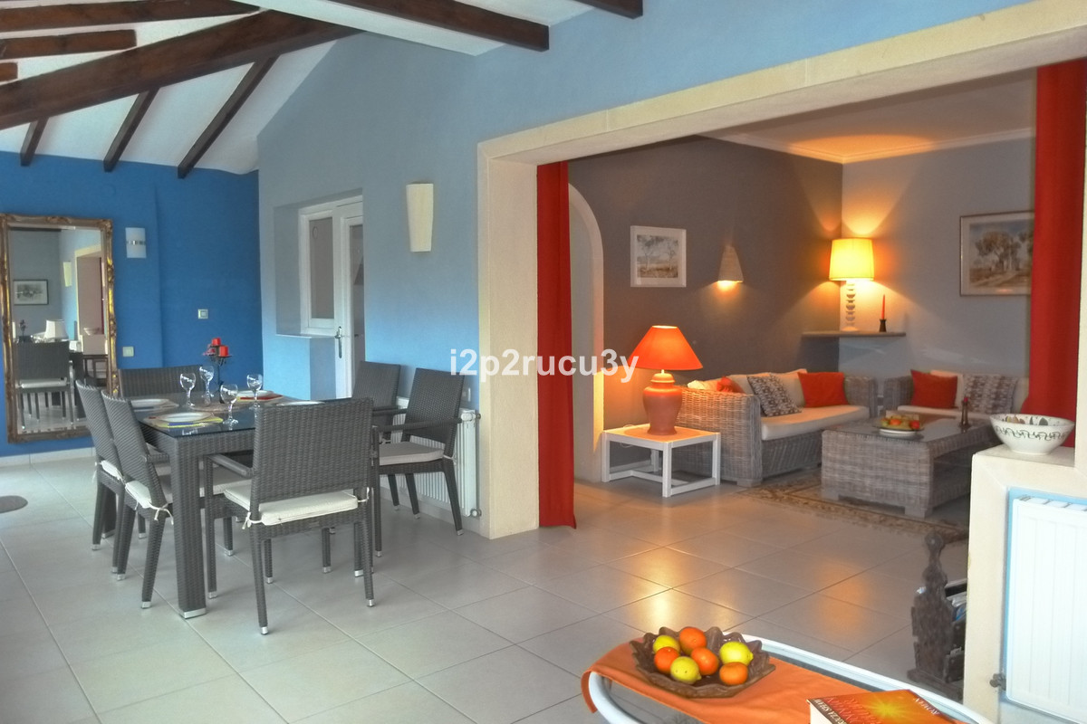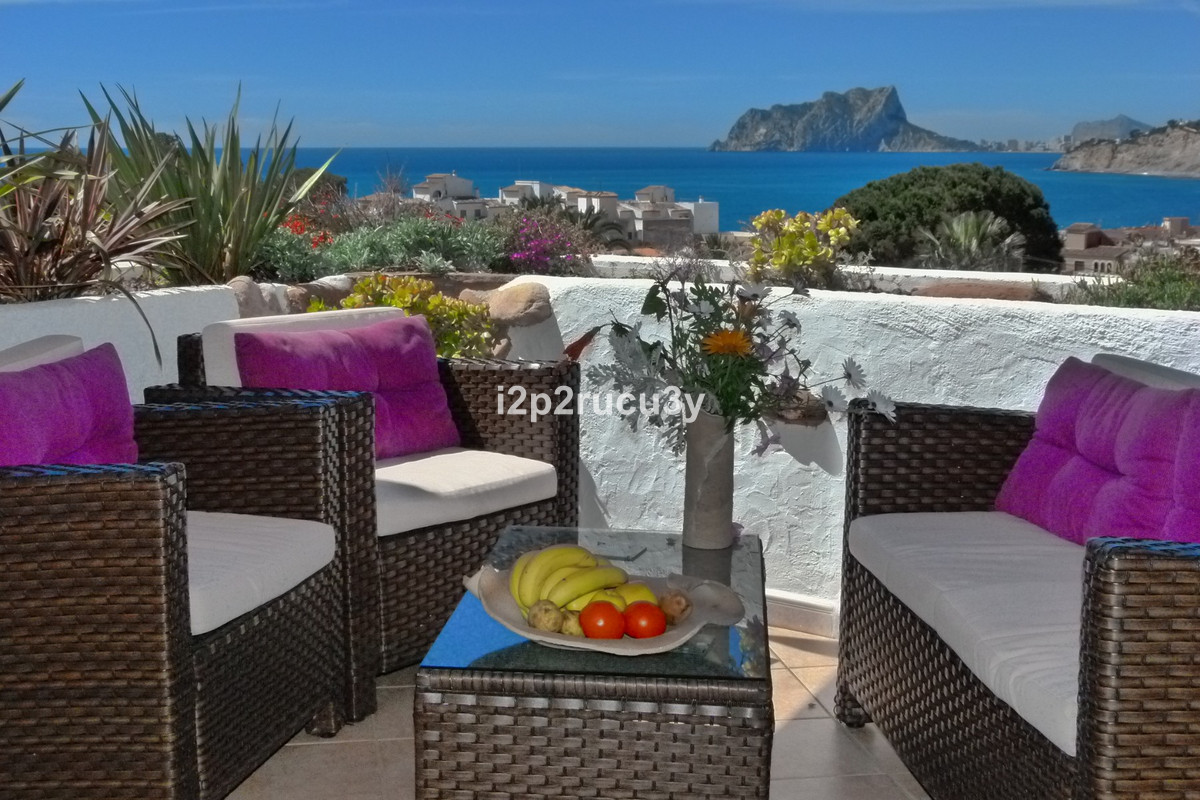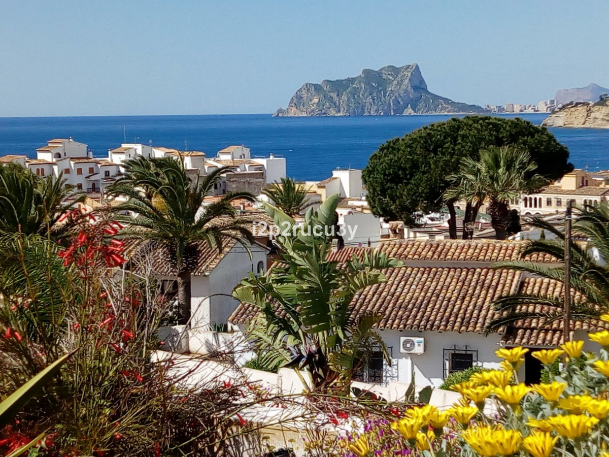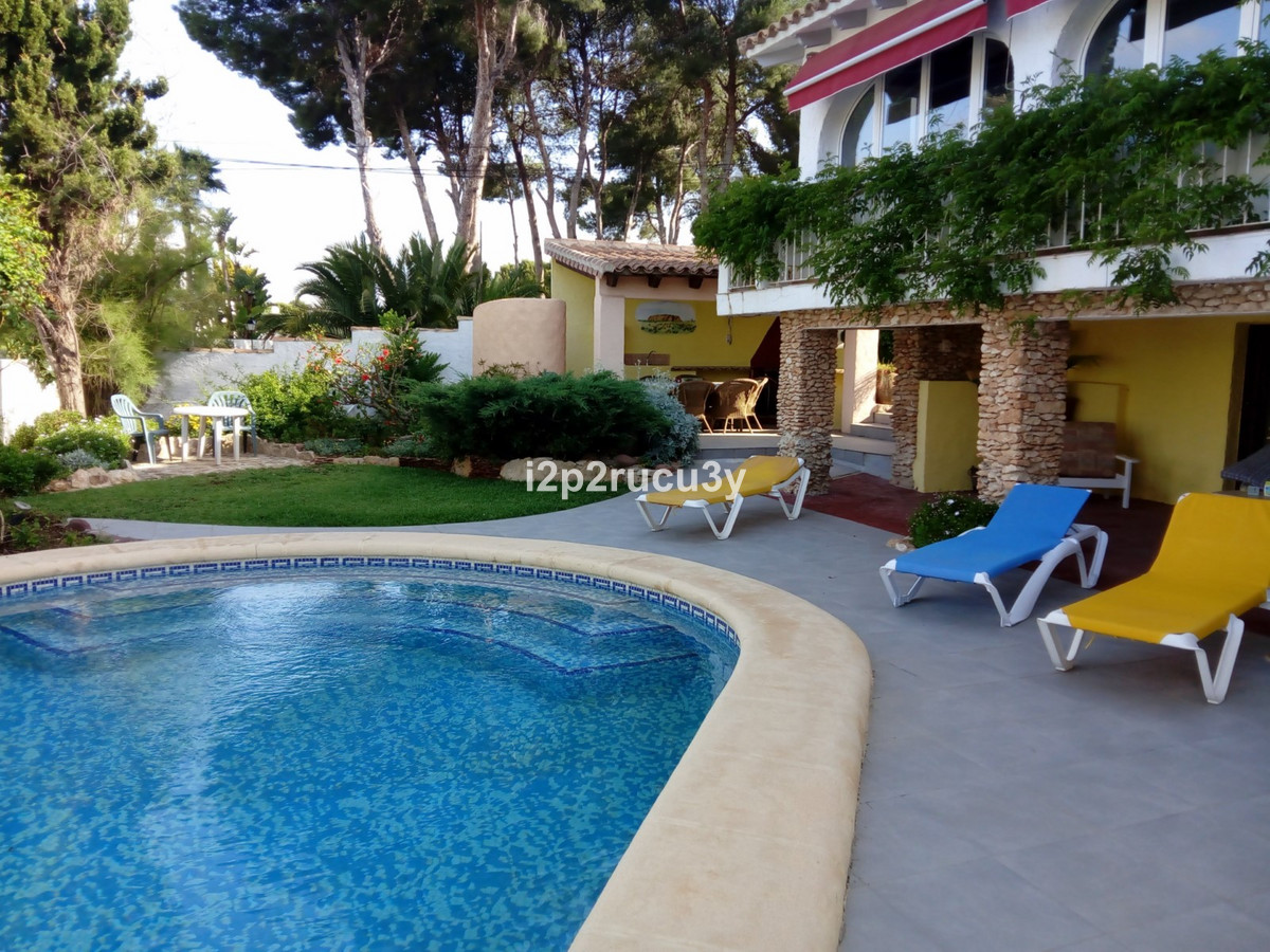 The property has 3 levels.  The lower part has 1 bedroom, 1 bathroom, the pool with garden, terrace and bbq area.  Via a few steps, we have access to the main living floor with a large glazed naya with lovely views over the town and the sea.  There is a spacious living-and dining room, open kitchen, a nice fireplace, 2 bedrooms and 2 bathrooms.  With an interior and exterior staircase you can reach the top floor with a wonderful living room with a terrace and with one of the most spectacular sea and panorama views in Moraira.  In this higher part of the house is also a fully equipped kitchen, 1 bedroom with bathroom and a hobbyroom.