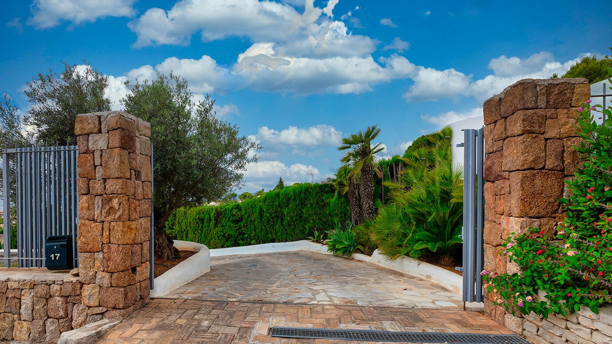 The property is surrounded by a landscape of palm trees, trees and native plants. The garden plays in this property with the unevenness in an intelligent way, configuring this flowery orchard on several terraces. Much of the beauty of the garden comes from the presence of natural stone walls, the great variety of Ciccas and large areas of grass, as well as the spectacular trees and their vegetation creating resting corners framed by the greenery. The house sits on the side of a hill and the pool enjoys the sun until the beautiful sunset that occurs behind the Montgó. The floor of the exterior spaces is, as in the interior, of manual clay, and for greater comfort, it has also been equipped with a very practical and functional "Barbecue/Summer Kitchen". Inside this two-story house, a decoration that provides warmth and comfort has been chosen, including the guest apartment located on the upper floor.\n