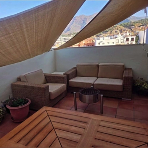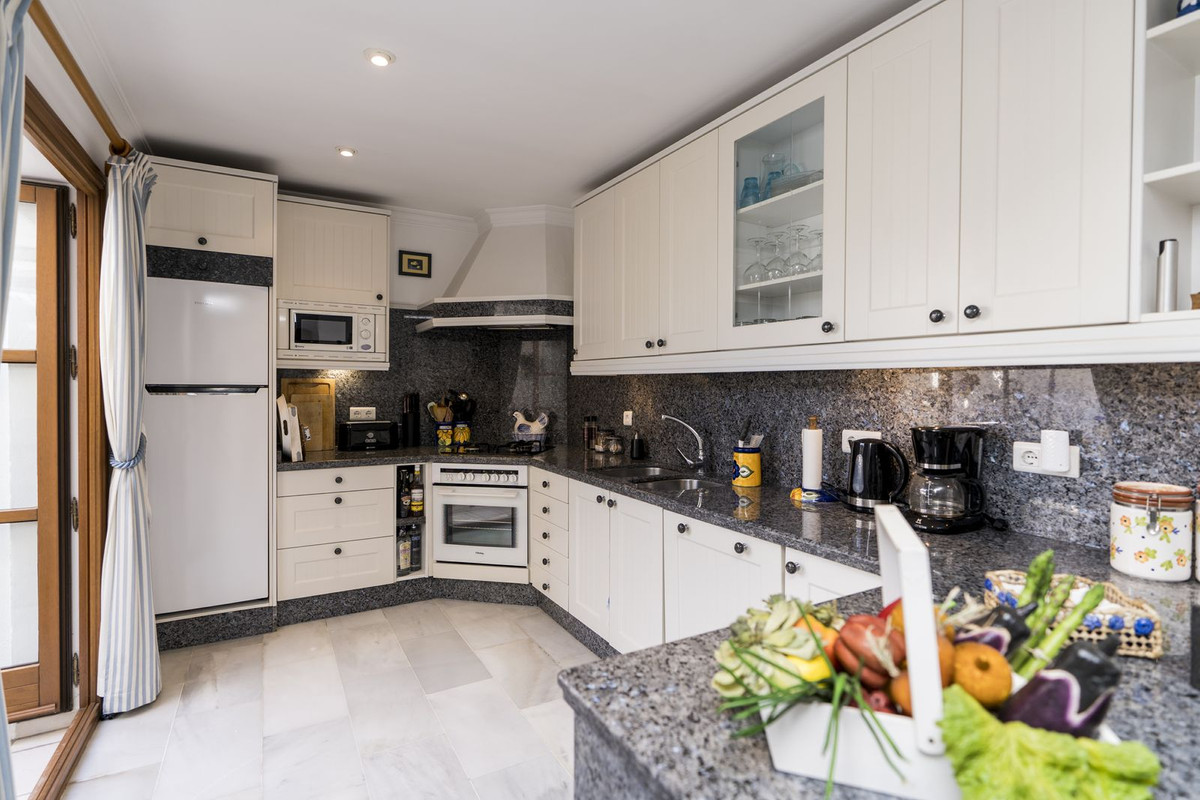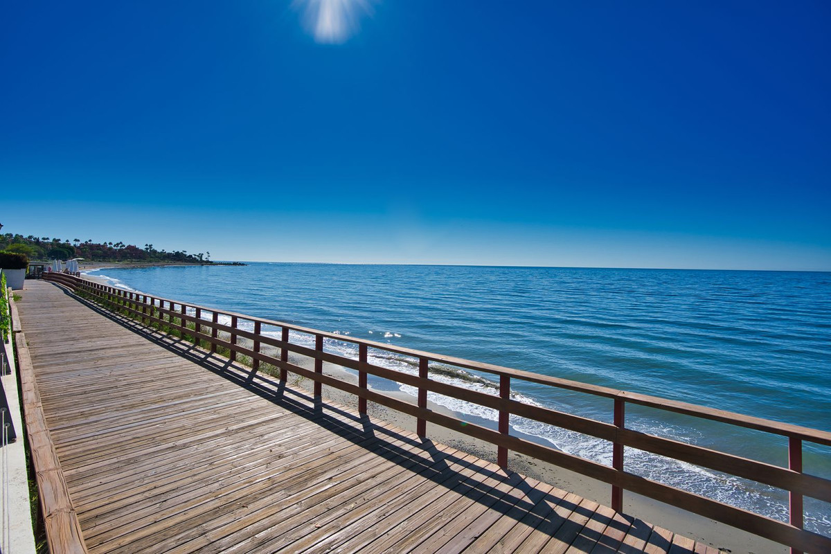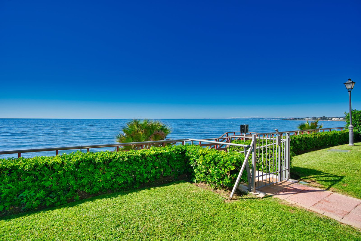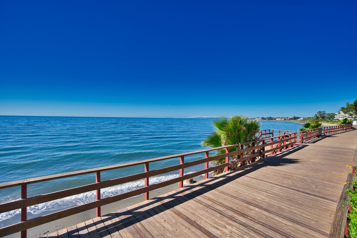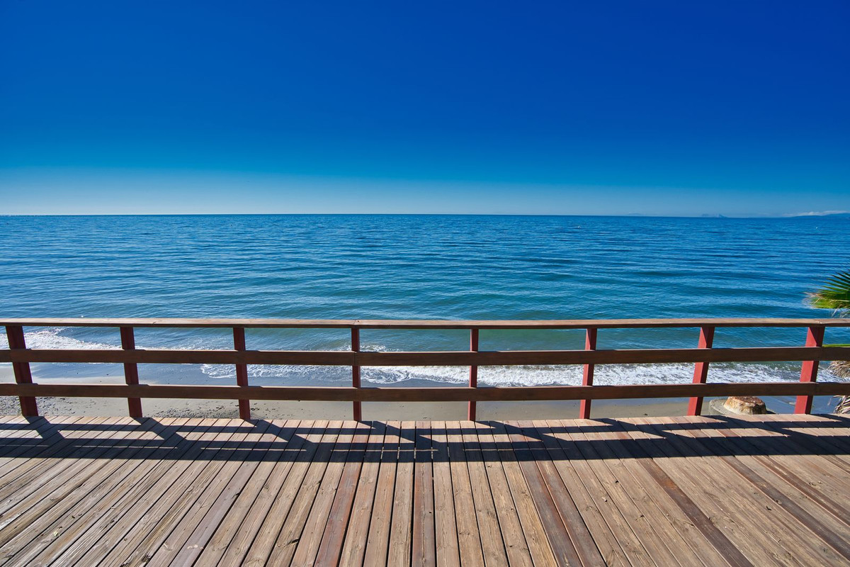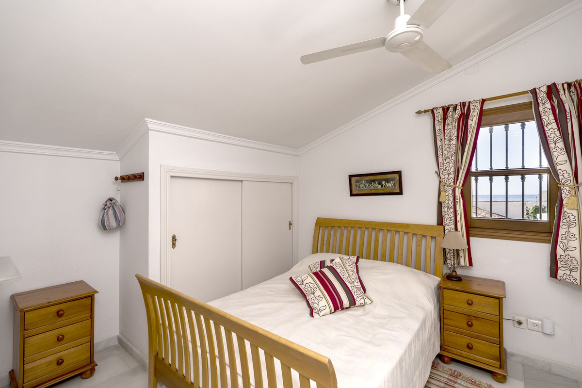 Beachfront complex, Estepona, New Golden Mile. Fully renovated corner semidetached townhouse located in a front line beach complex that resembles a fishing village, full of character and tradition! The location is fantastic, 50 meters from the promenade & the Mediterranean sea and only 5 minutes away from Estepona center and 10 minutes away from Puerto Banus. Set in a peaceful environment where you can hear the waves of the sea. There is a fabulous beach restaurant 50 meters away. The property was completely renovated in 2003, Spanish/Scandinavian Style. The terraces have been very well insulated and new double glazed windows in Brazilian hardwood have been installed. Central gas for gas fire. The house comprises a total of 3 bedrooms, 3 bathrooms (1 bedroom and 1 bathroom on the ground level!), a large fully fitted kitchen, a nice living room and a beautiful patio for entertaining. Four storage rooms. On the first floor you will find 2 double bedrooms with en-suite bathrooms, and a superb roof top terrace with loads of privacy and panoramic views to the sea. Viewing are highly recommended.