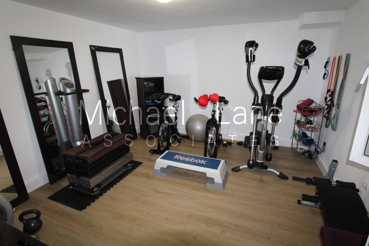 In the basement is the garage with space for two cars, a gym and a large room with a sauna!