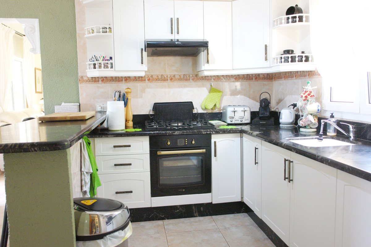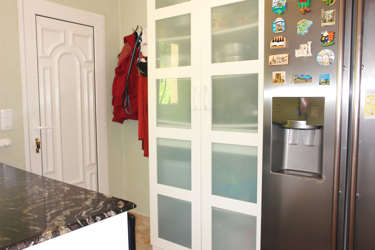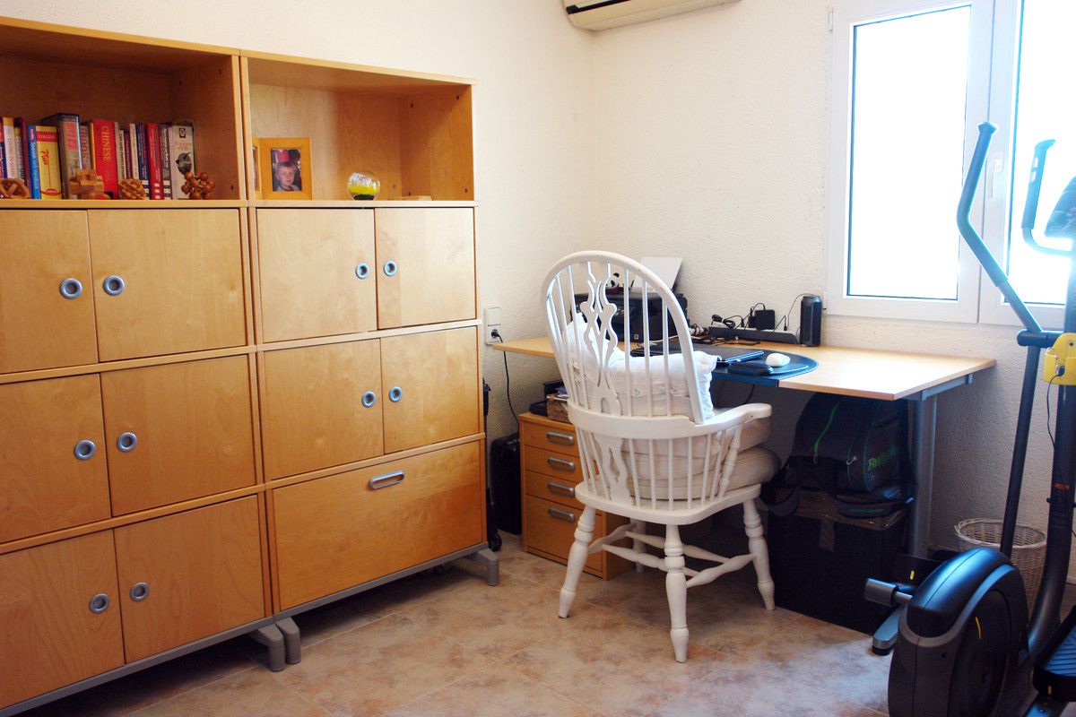Both floors benefits from an individual exterior access and are connected by an interior staircase. The top floor comprises the lounge with access to a lovely covered/uncovered terrace, with steps descending to the pool area, a diner with separate access to that terrace, in which the fully fitted kitchen with a large gas hob integrates. Next to the kitchen is the laundry and pantry leading to the exterior and parking area in front. There´s another diner, and a bedroom, presently used as office, with en-suite bathroom.