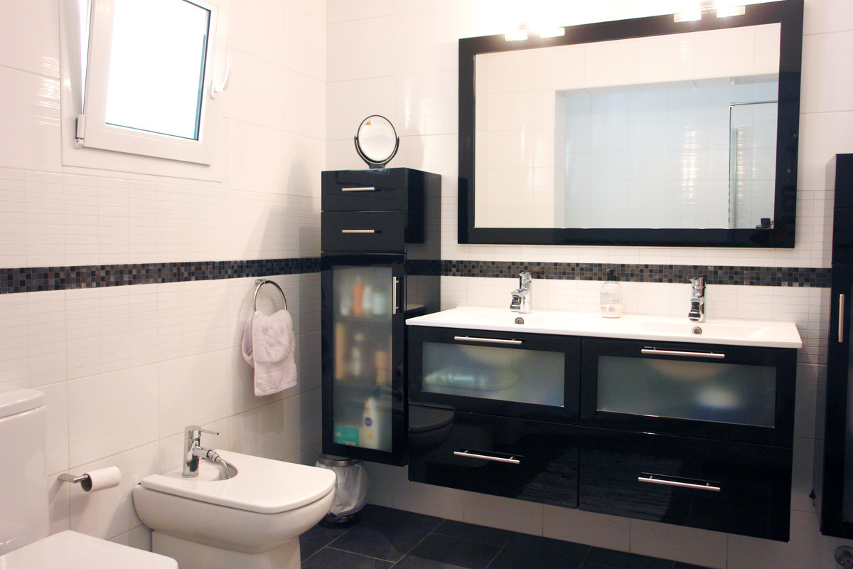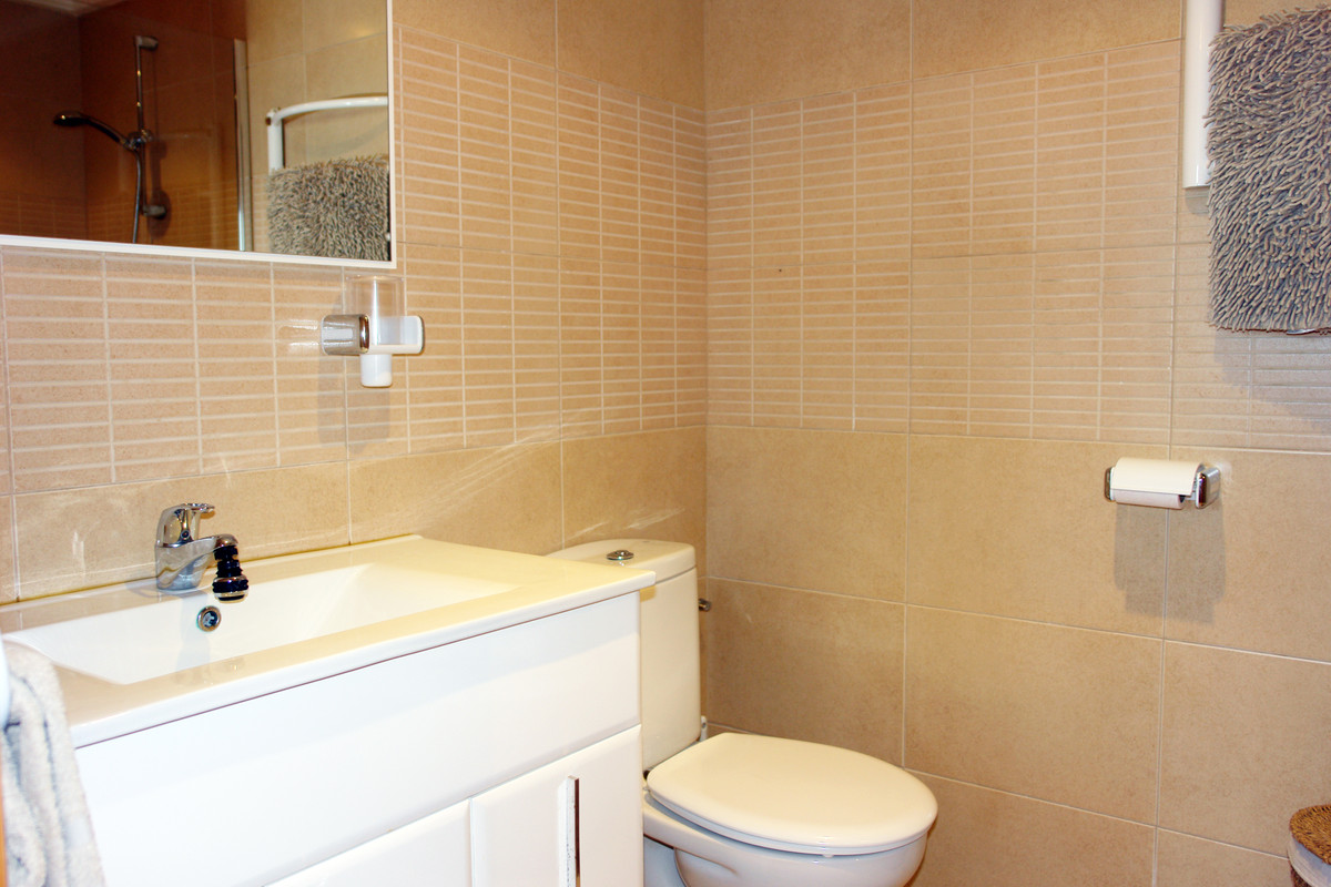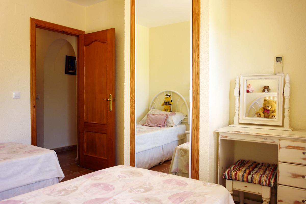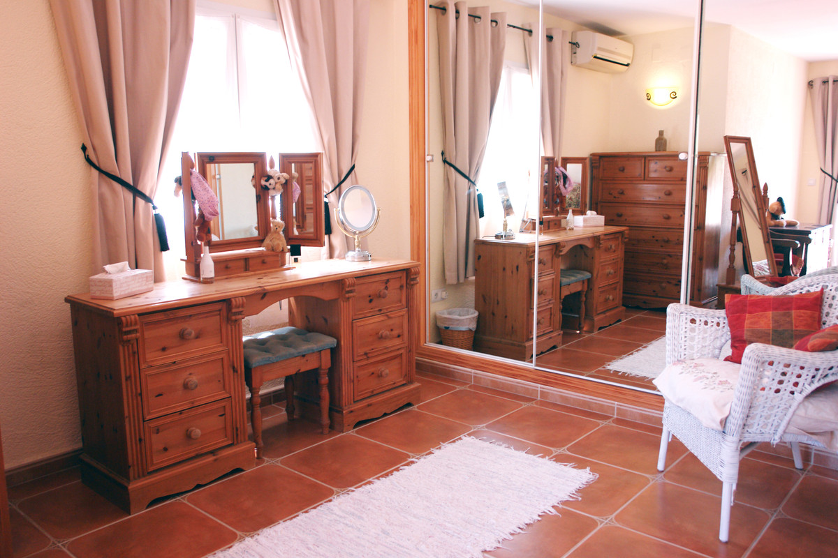 Downstairs is the generously sized master bedroom with large mirrored wardrobes and access to the terrace in front. The master bedroom´s large ensuite bathroom features a corner bathtub, a walk-in shower unit and a twin sink unit. There are three further bedrooms, one with access to the terrace, and one with en-suite bathroom. A separate shower bathroom serves this floor.