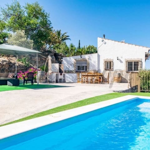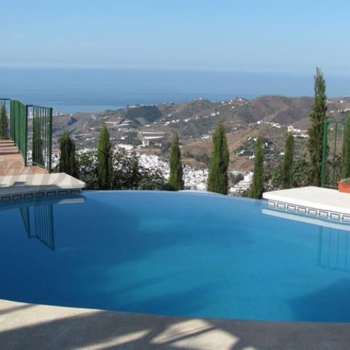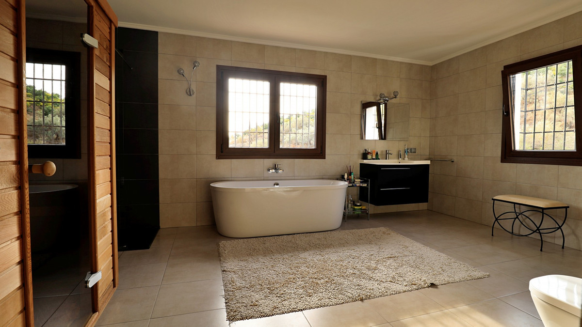 Are you looking for an oasis in harmony with nature? A place of peace and relaxation, where time runs a little slower? Yes?! Then we would like to show you this fantastic villa, in the mountains of Torrox. It offers an imposing, grand main house, a separate, small guest house and a pool, as well as 5,569 m2 of land, which is predominantly flat and thus offers countless possibilities. The layout of the property makes it possible to use the main house as two independent living units, with separate entrances. This fabulous property is perfect as a multi-family home, B&B or as an investment opportunity for a yoga center, event location, dance school or meditation temple.... An almost completely paved driveway leads you to a concrete parking area, which is partially covered. On this level is the charming guest cottage with its own covered terrace. It is equipped with a cozy, open living/dining area with a bed, a kitchen and a bathroom. The fireplace provides comfortable warmth in the cooler months. A driveway, as well as stairs, lead to the lower level. Another heavy wooden door with an iron horse door knocker grants entry into the spacious, imposing living area with fireplace, of the first part of the house. To the right is a guest toilet. Next to this is a room which is currently used as an office/library. It can also be heated to a comfortable temperature in the cooler seasons with the fireplace. We have adjacent a small, glazed room from which you can enjoy the view of the surrounding countryside. The large terrace at the front of the house offers breathtaking views of the famous white village of Frigiliana and the Sierra de Tejada in the background. Thanks to the hillside location, the hollow space under this terrace can still be closed and create more living space, if needed. From the living room, also with access to the terrace, one enters the spacious open kitchen with dining area. The interplay of traditional and modern has been perfectly achieved here. A glass patio door leads to the beautiful u-shaped and typical Andalusian courtyard with a fountain. On the second floor of the house there are three bedrooms and two bathrooms. The master bedroom has a large, modern bathroom with its own sauna, as well as a bathtub and shower. From two of the bedrooms there is access to an enchanted u-shaped balcony with views down into the Andalusian courtyard. Its wooden beams and plantings make it feel like you've stepped into another era. A corridor leads from this balcony to the second part of the house. On the second floor there is a bedroom with another fireplace, called the Sunroom because of its wall color. A staircase leads down to a huge open space with a large flat skylight that lets in natural light. The space can be used for a wide variety of possibilities. As a dance studio, atelier, or conference room. A feel-good temperature can also be created here with a great fireplace. On this level we also have a large heavy wooden door, the separate entrance to this part of the house. Right next to the entrance area there is a fully equipped bathroom. Through an open arch you enter a living area with a small, charming kitchen. Through almost floor-to-ceiling windows, you look out onto an idyllic pond and out into the countryside. There is another bathroom and two bedrooms, both with access to the outdoor area. The outdoor area includes a pool, many terraces with seating, a small vegetable garden and some olive trees. The bodega, or wine cellar, adds the finishing touches to the mansion and guarantees the right temperature for your wine. We are pleased to be able to present this dream property to you soon, either personally or via virtual viewing. Because this world, it is unique - just like our Axarquía. In Andalusia. On the Costa del Sol. Here, on the sunny side of life...