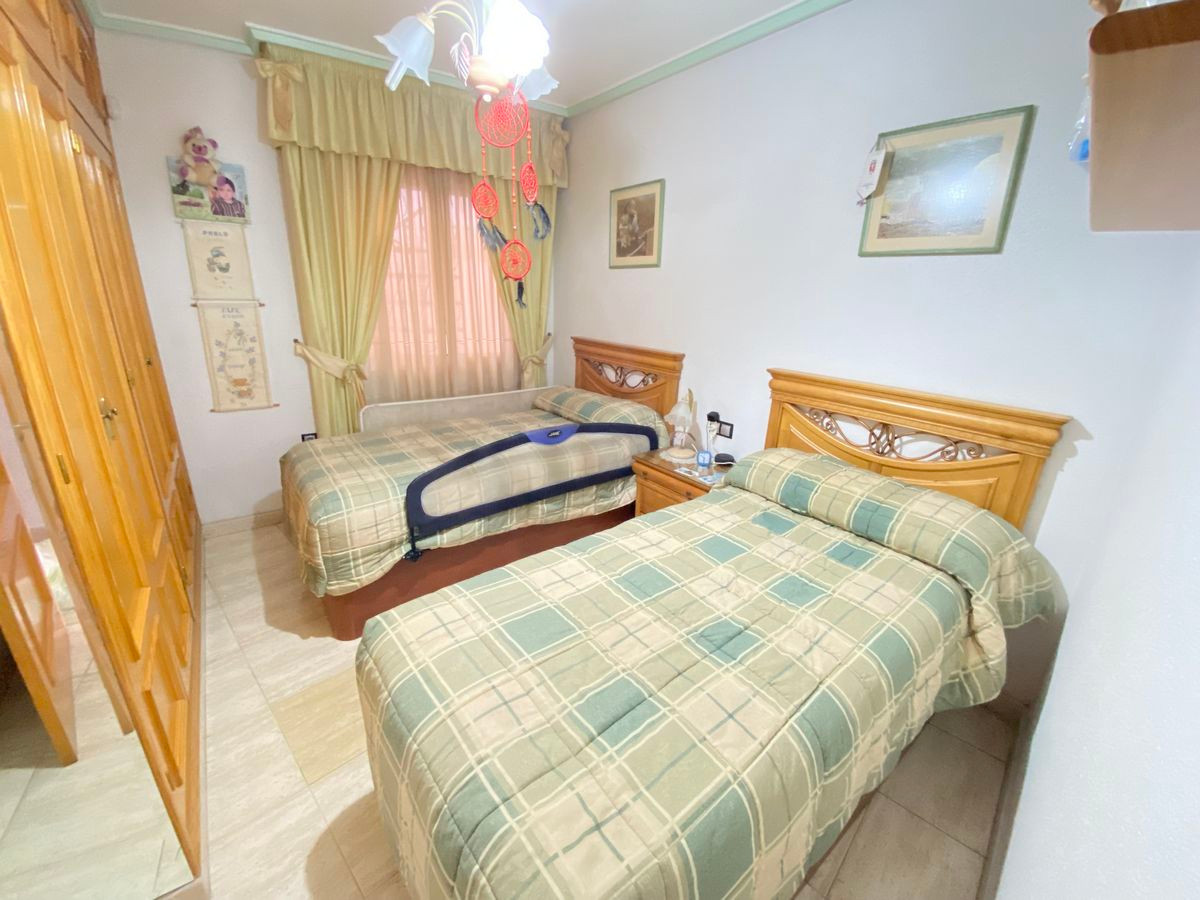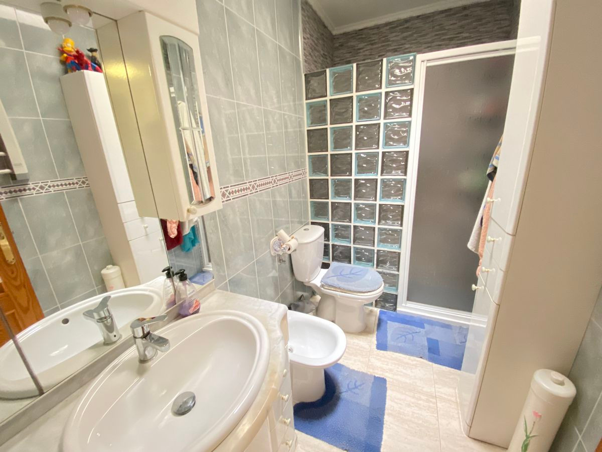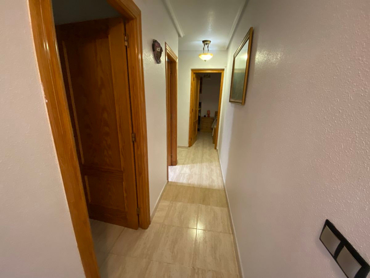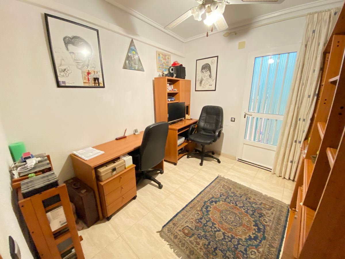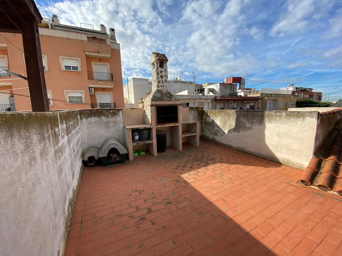 Spacious three bedroom townhouse all on one level in the great location of Los Palacios, Formentera del Segura on the Costa Blanca South. As you enter the property you have a large spacious living come dining area with log fire, the hallway with pellet burner leads to three double bedrooms, plus a study which could be used as a bedroom.  Separate kitchen, family bathroom and en-suite off the master bedroom, this property has a build size of 115 m2. From the study you have internal access to the underground private storage room and private garage of 63 m2 with own toilet. You have internal spiral stairs from rear courtyard up to the private solarium with brick barbeque area and room for sunbathing.