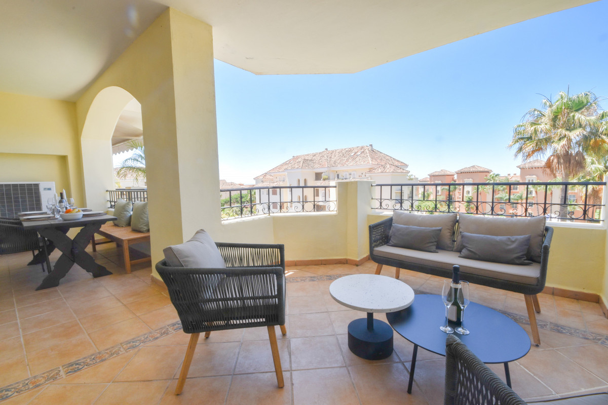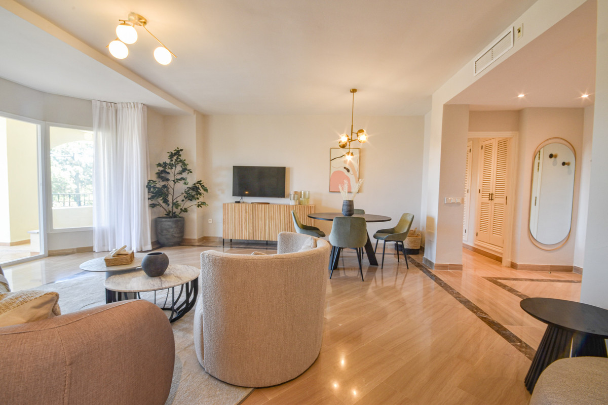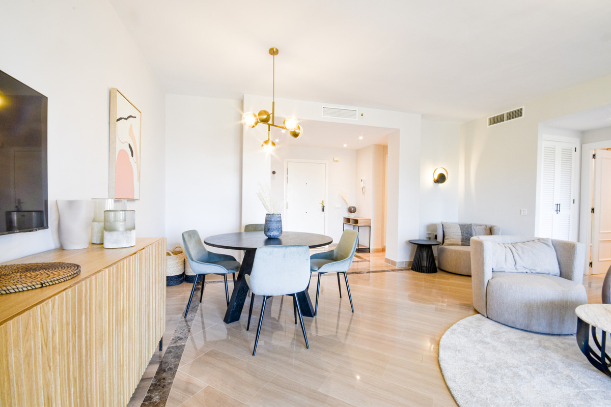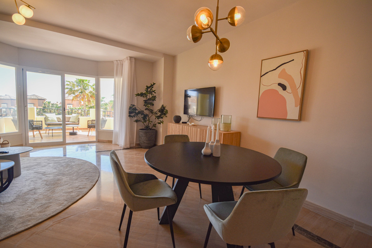 The living-dining room is equipped with a sofa, an armchair and a TV. The dining room has been provided with a table with capacity for 4 people. The terrace has two visibly divided rooms, the first room is a chill out with a sofa, two armchairs and a coffee table and the second room is the outdoor dining area with a table with space for 8 people.