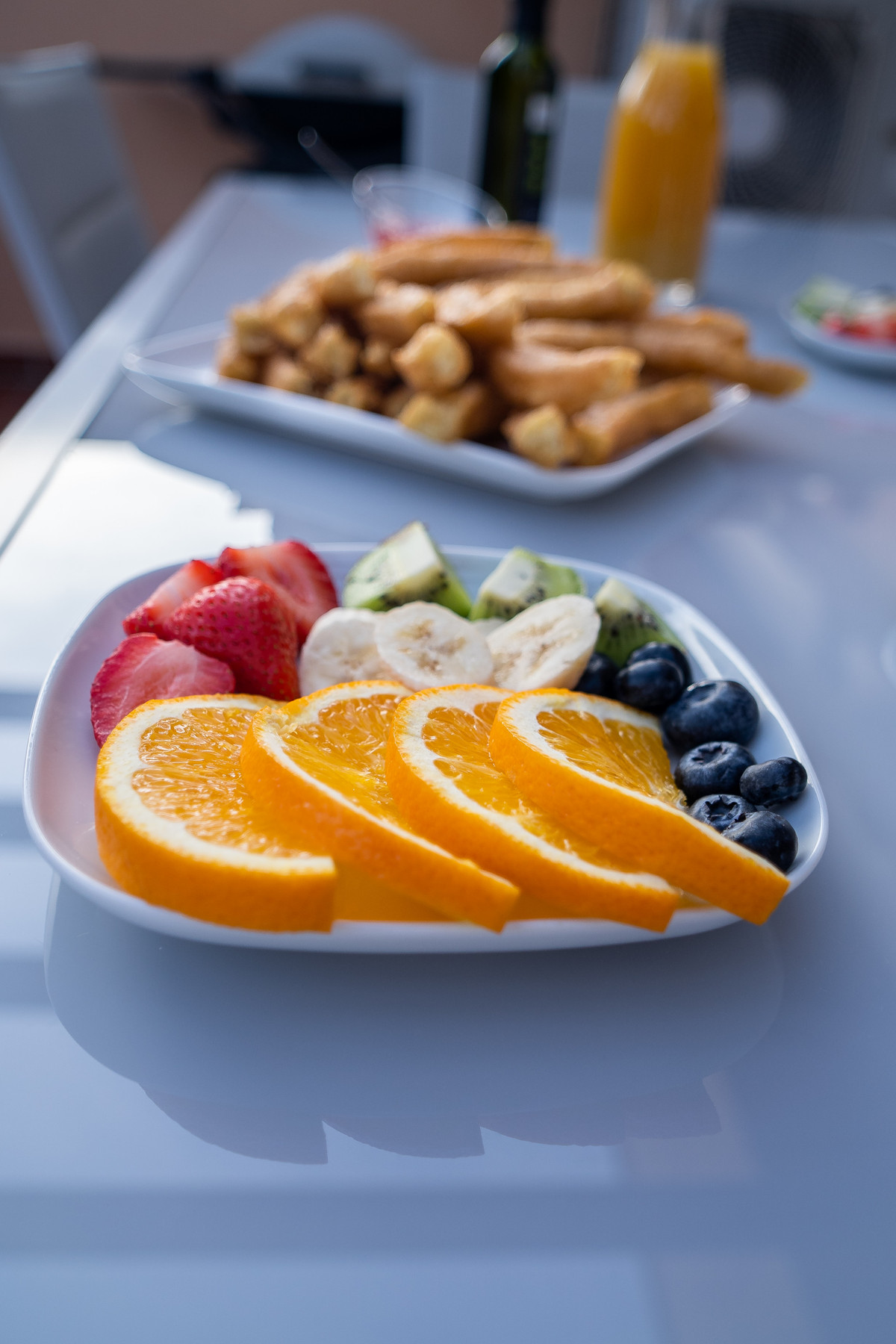 The 110 m2 apartment is made up of a living-dining room decorated with a chaise longue sofa, a coffee table, a smart TV and a table with chairs for six people.