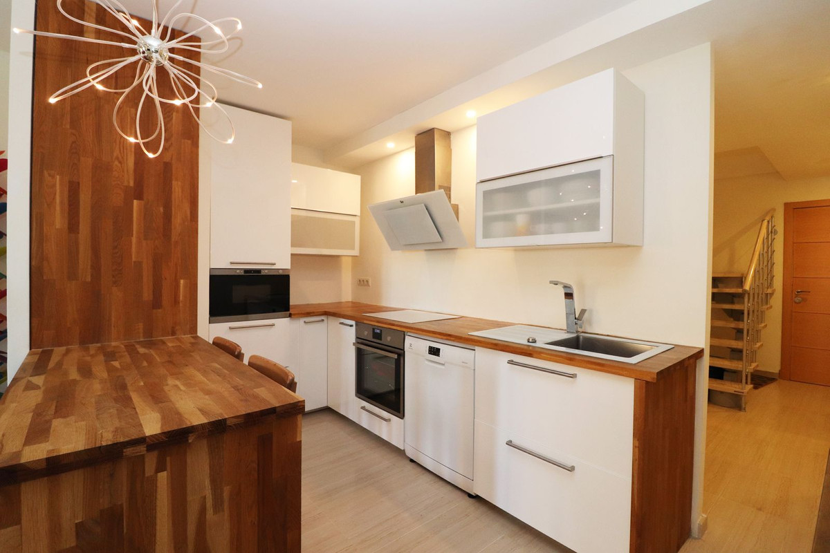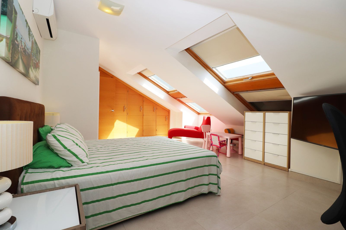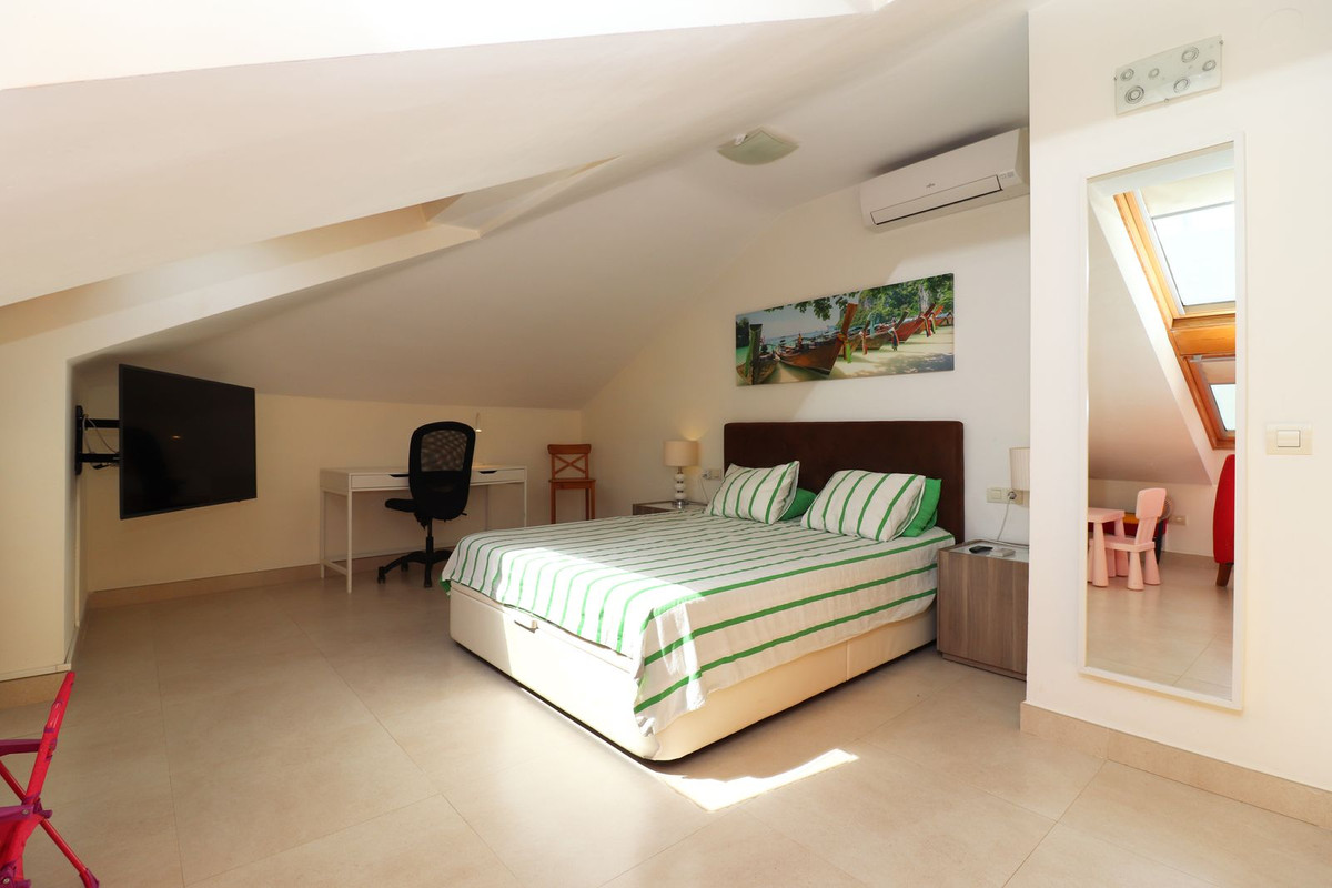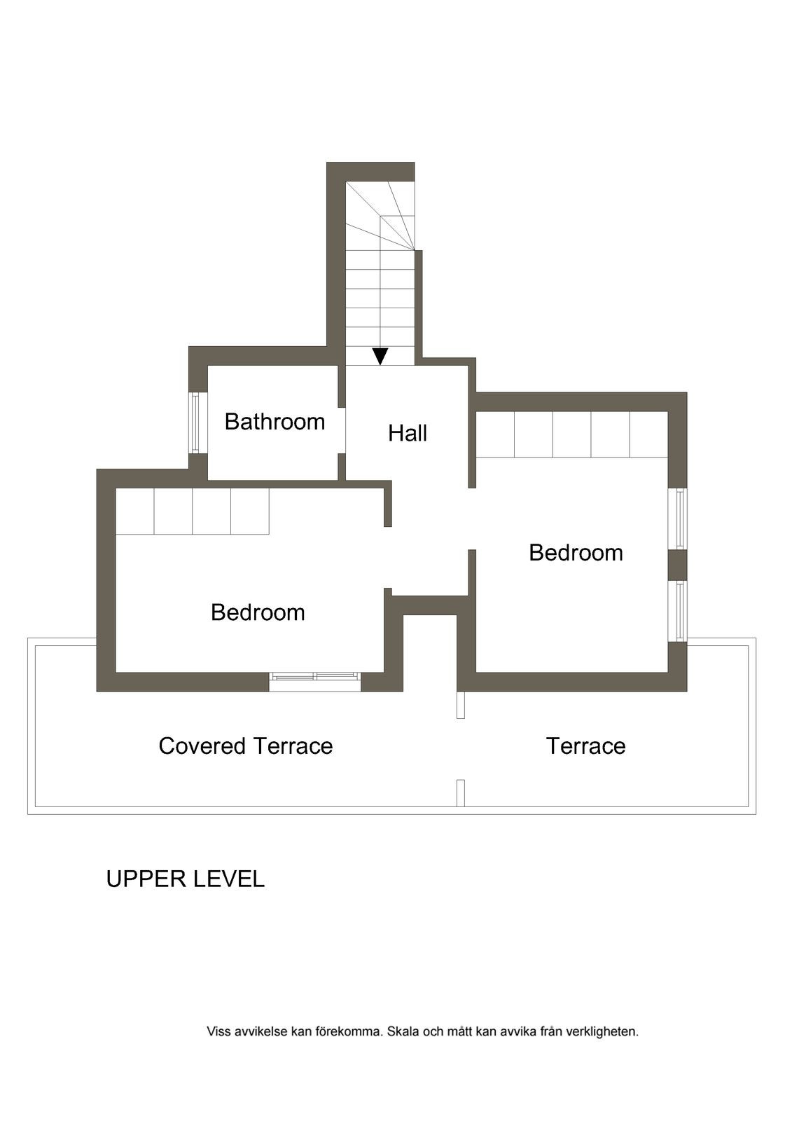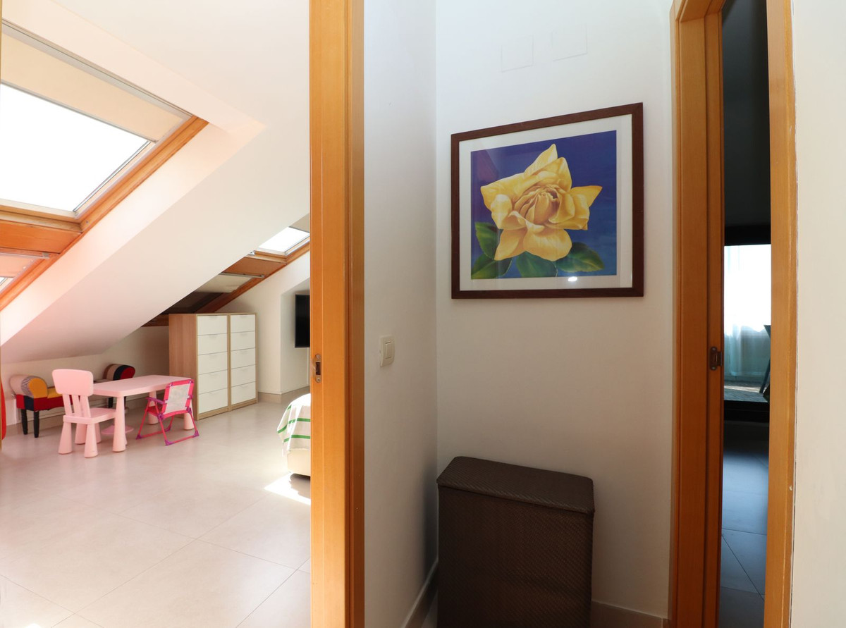 The home is on two floors where the entrance floor has an inviting hall with bathroom, a kitchen that has practical storage with an open plan to the living room. From the living room you reach the terrace with sun all day. On the upper level, you will find another bathroom with shower, the two bedrooms, one of which has sloping ceilings with large skylights and built-in wardrobes. The second bedroom leads out onto another terrace which is partially glazed and has space for large outdoor furniture and a lounge area.