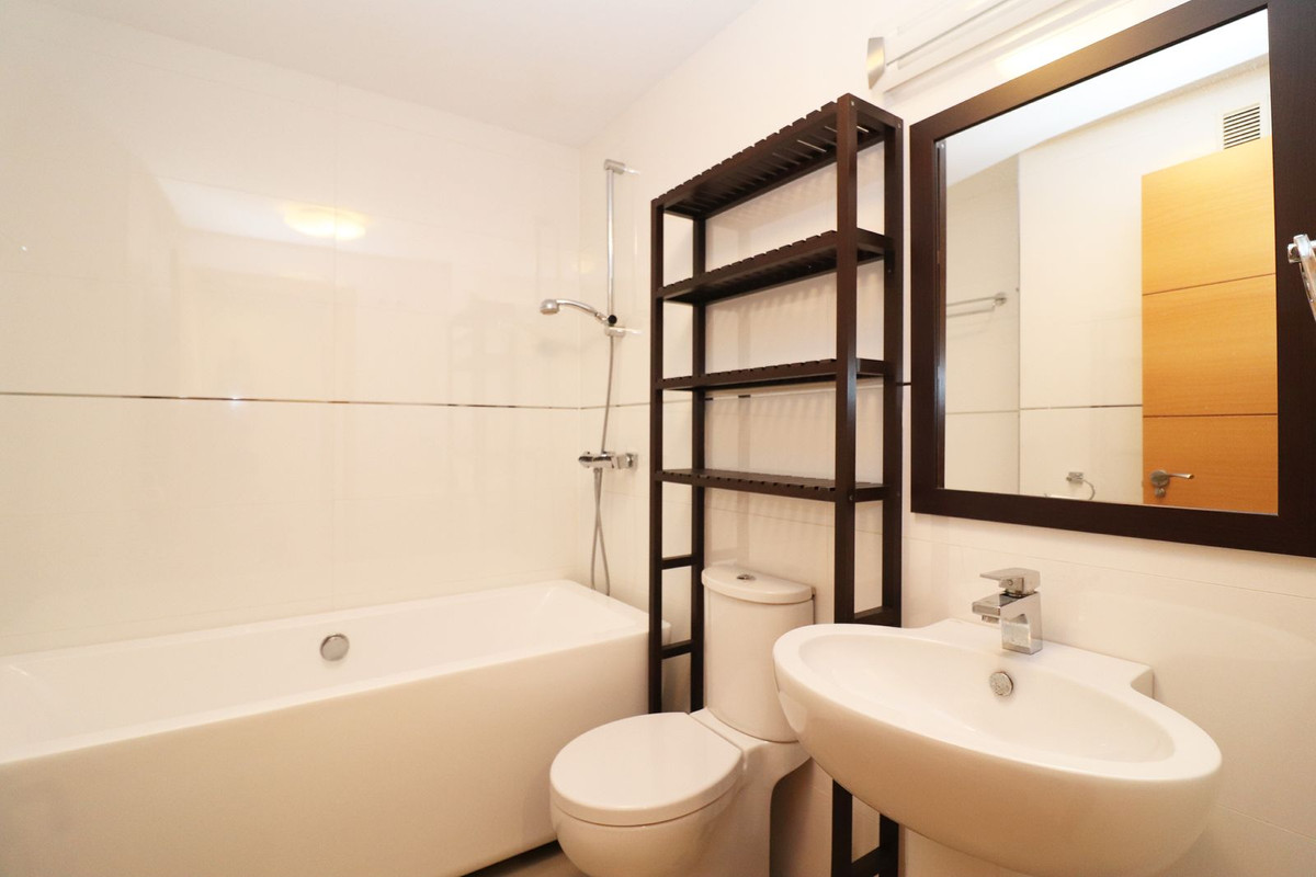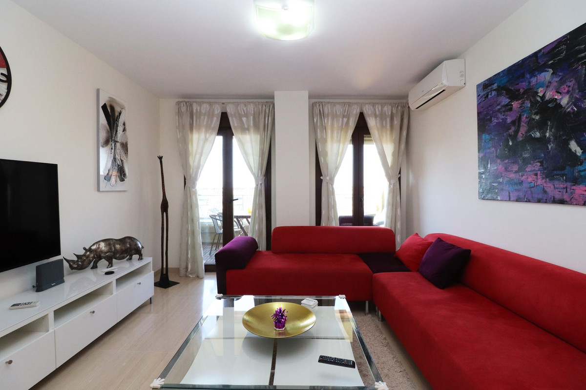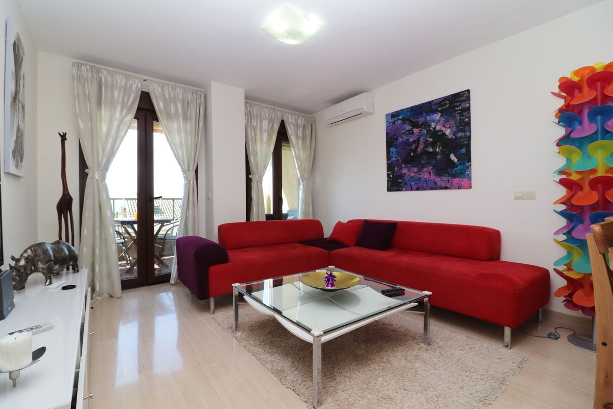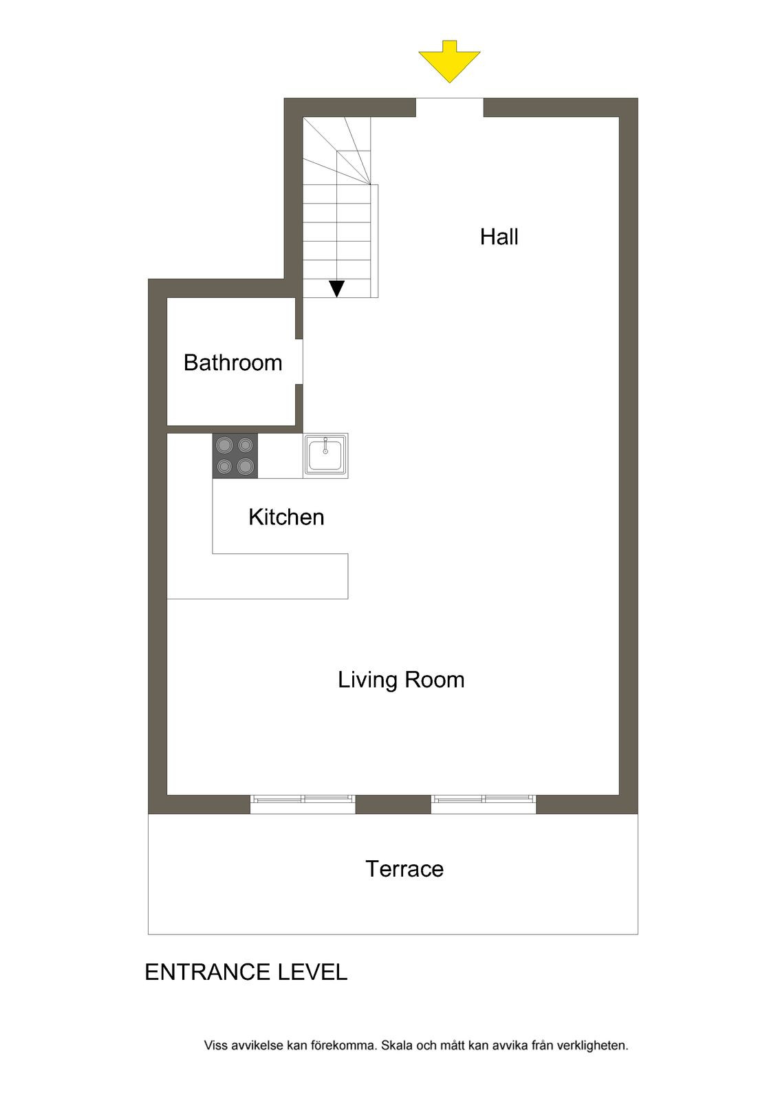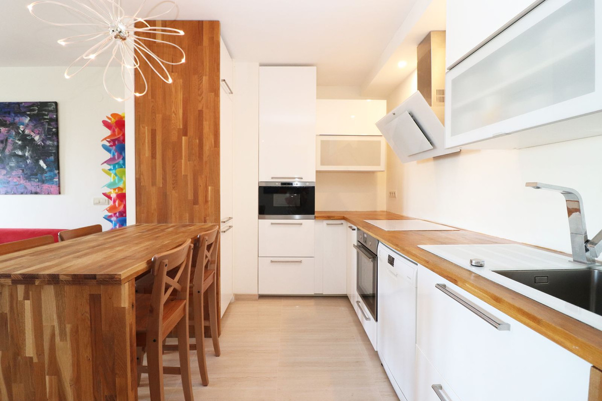 The home is on two floors where the entrance floor has an inviting hall with bathroom, a kitchen that has practical storage with an open plan to the living room. From the living room you reach the terrace with sun all day. On the upper level, you will find another bathroom with shower, the two bedrooms, one of which has sloping ceilings with large skylights and built-in wardrobes. The second bedroom leads out onto another terrace which is partially glazed and has space for large outdoor furniture and a lounge area.