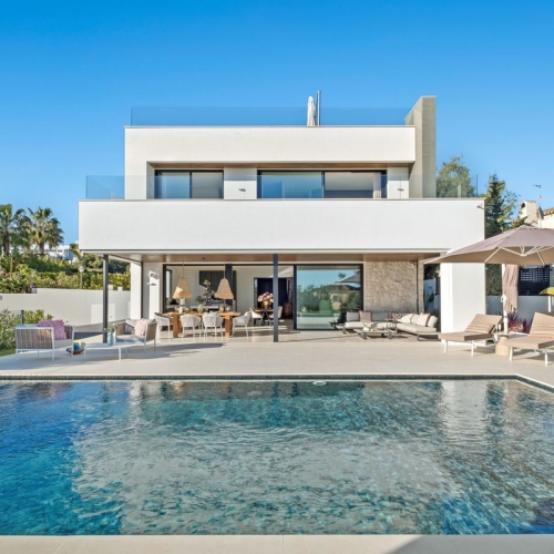 The house is a three-storey modern style luxury villa with a 3x10m outdoor heated pool on the patio.