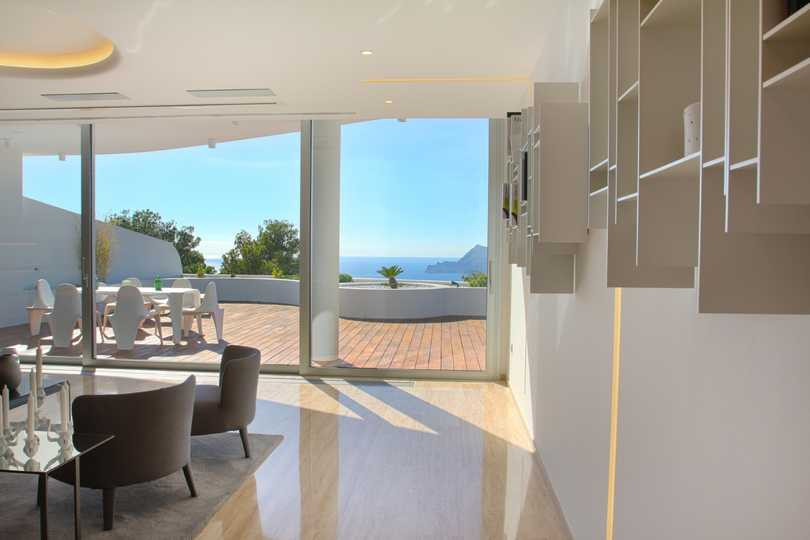 High-end kitchen and entertainment: The kitchen, with Miele appliances and a spectacular central island, reflects the class of the entire home. The living/dining room, over 63m², transforms into a cinema room and opens onto a 53m² terrace with jacuzzi and sea views.