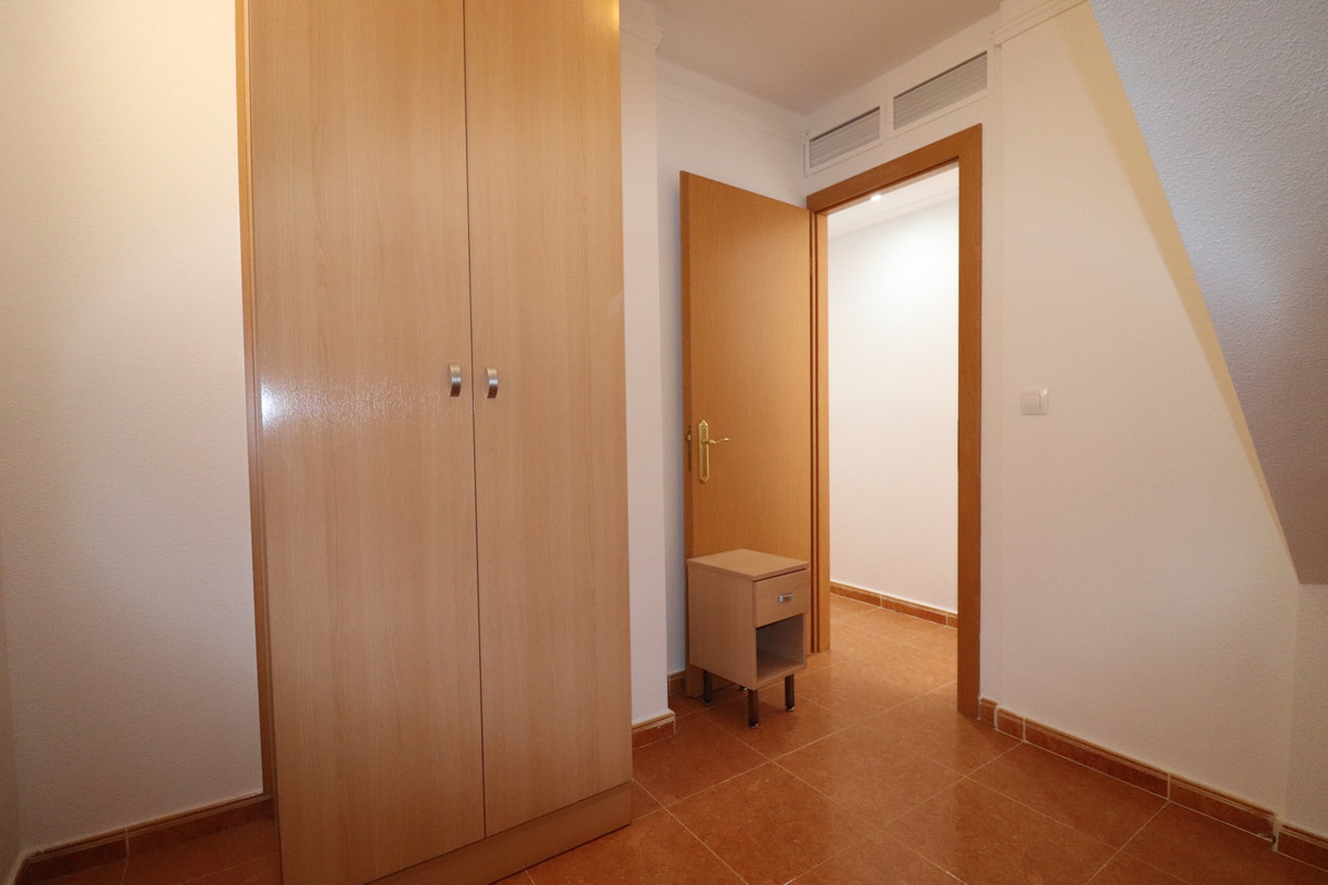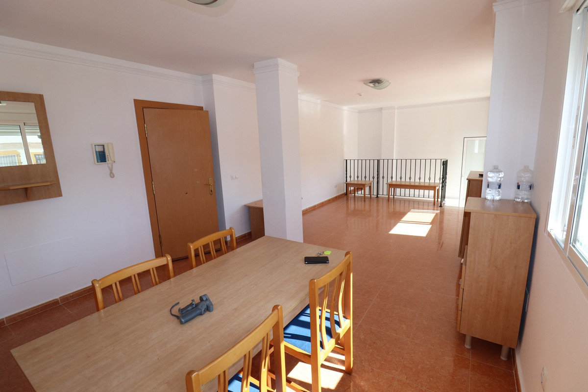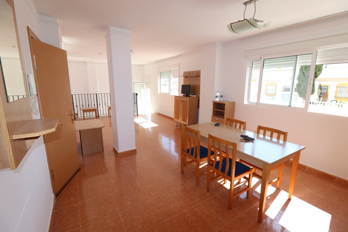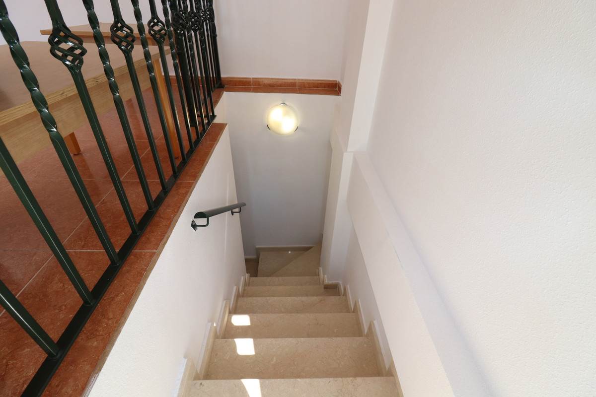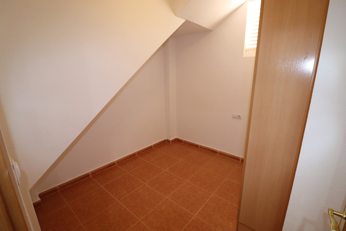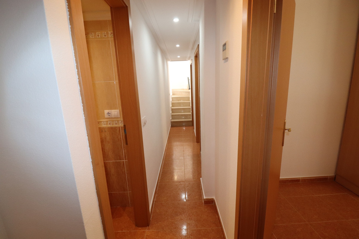 We present here, a beautiful 4 bedroom 3 Bathroom apartment Duplex on the ground floor of the Community Urbanization of Colina Real in Guardamar.  Entering from the front gates into the well kept communal areas, this is a ground floor apartment, the communal areas and hallways are an impressive entrance leading to the front door.  On this entry floor you walk into the large and very bright south facing open Livingroom / Dining area, and off here the kitchen, Utility and a bathroom are located also.