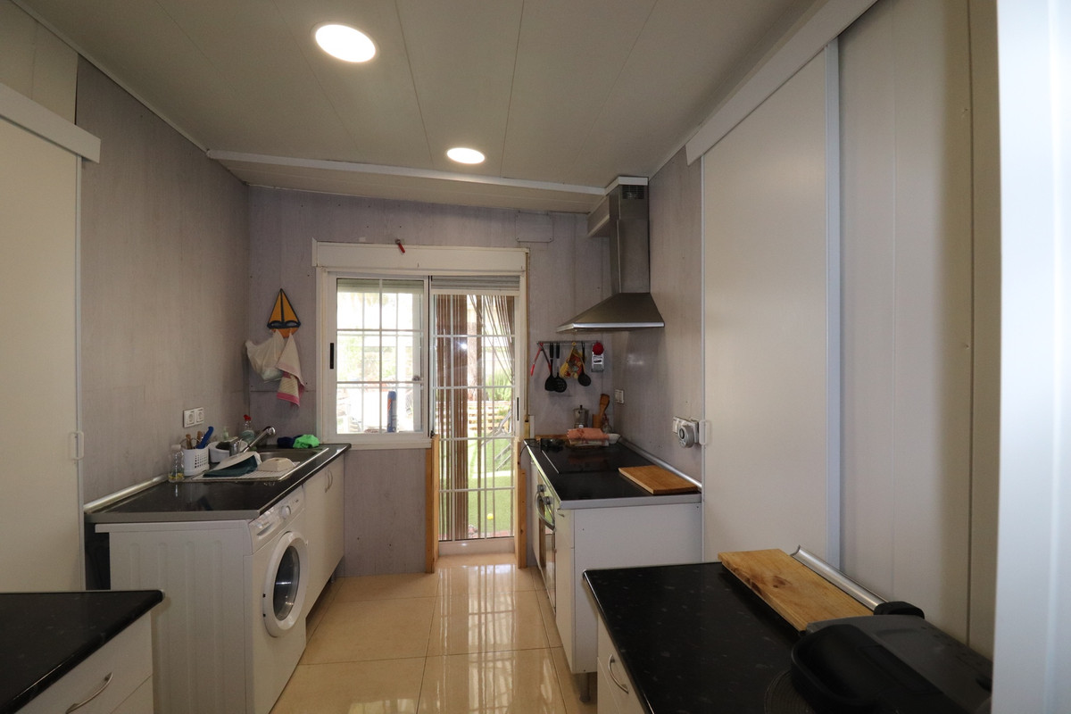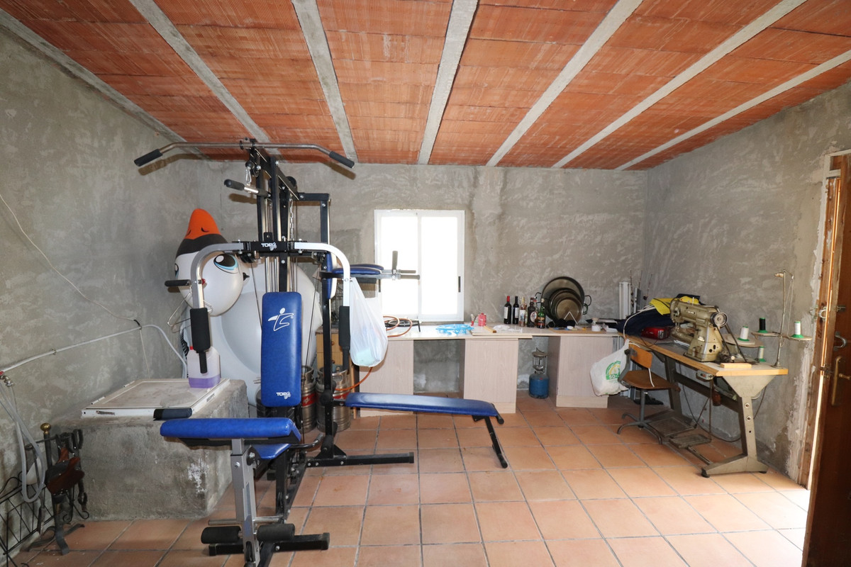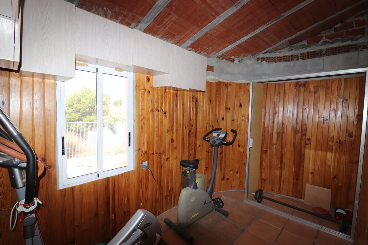 The main house has a cosy living room, a kitchen and 2 bedrooms and a bathroom. Behind the kitchen there are 2 rooms, 1 could be another bedroom with an ensuite bathroom and it has a back door. These 2 area's could be used as a guesthouse with an outside kitchen and privat area. Both are being used as a gym and need to be finished as you can see on the photo's.