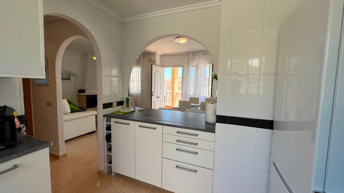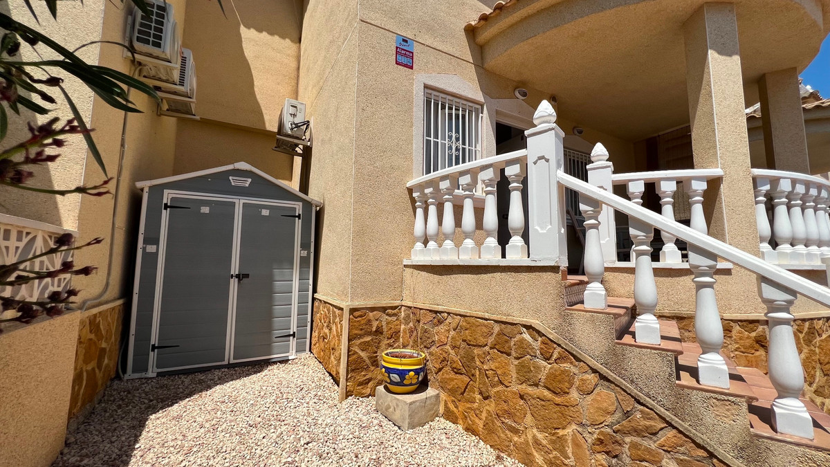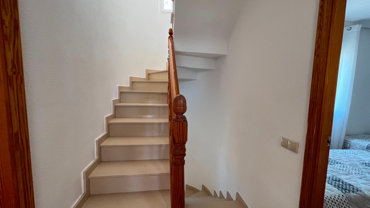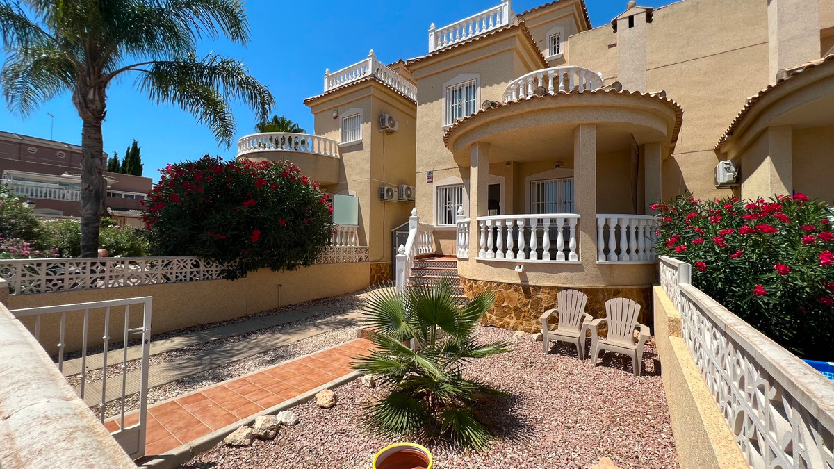 This is a charming townhouse in Cuidad Quesada. A nice and quiet urbanization with a communal swimming pool. There is room to park your car on the plot. Through the front garden you reach the terrace and the front door. The property is divided into 3 floors. On the ground floor you have a spacious living and dining room, equipped kitchen, bathroom, double bedroom and access to the backyard. On the first floor there is a spacious bathroom and two double bedrooms. Through the master bedroom you reach the balcony. On the 3rd floor is the solarium with beautiful views.