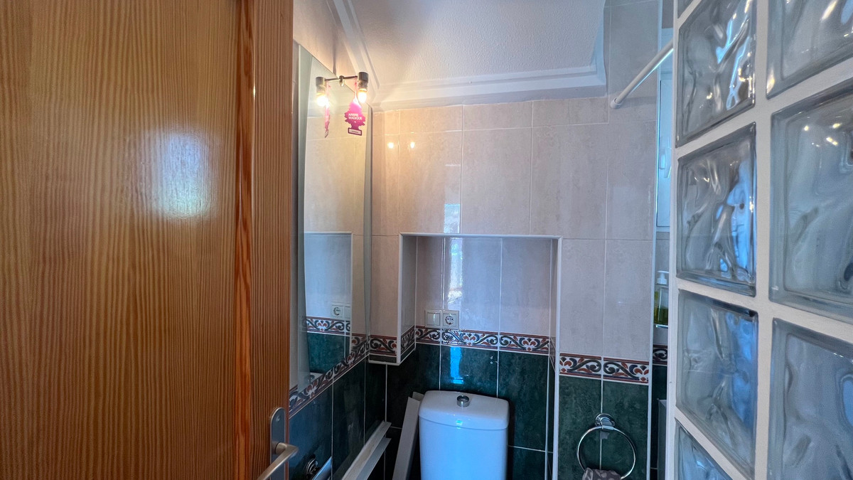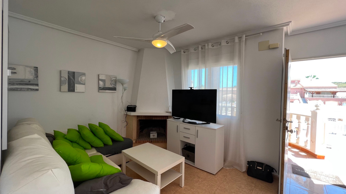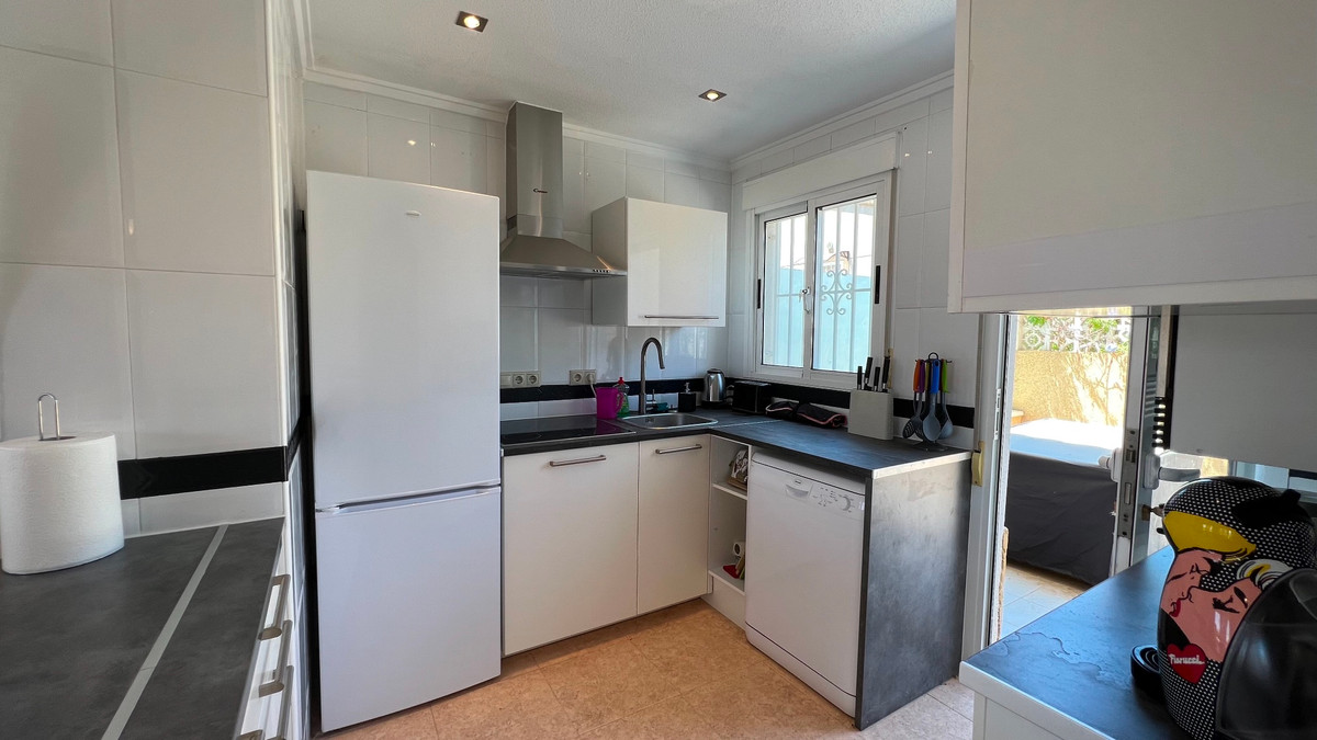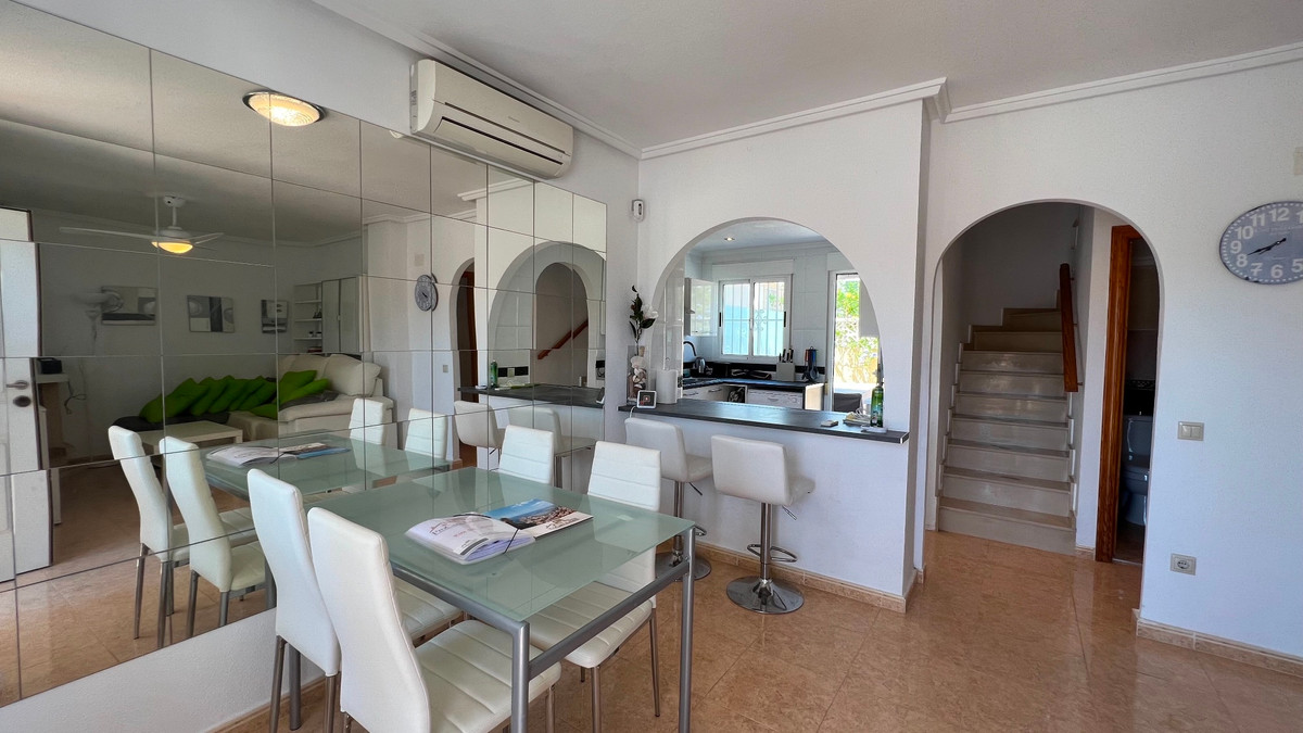 This is a charming townhouse in Cuidad Quesada. A nice and quiet urbanization with a communal swimming pool. There is room to park your car on the plot. Through the front garden you reach the terrace and the front door. The property is divided into 3 floors. On the ground floor you have a spacious living and dining room, equipped kitchen, bathroom, double bedroom and access to the backyard. On the first floor there is a spacious bathroom and two double bedrooms. Through the master bedroom you reach the balcony. On the 3rd floor is the solarium with beautiful views.