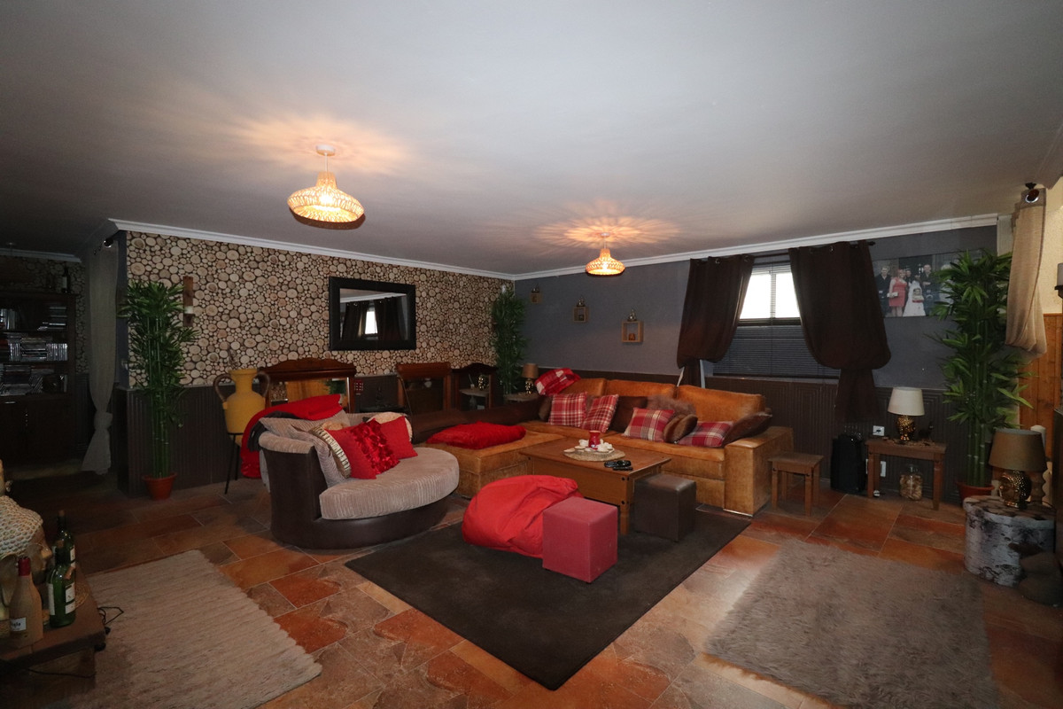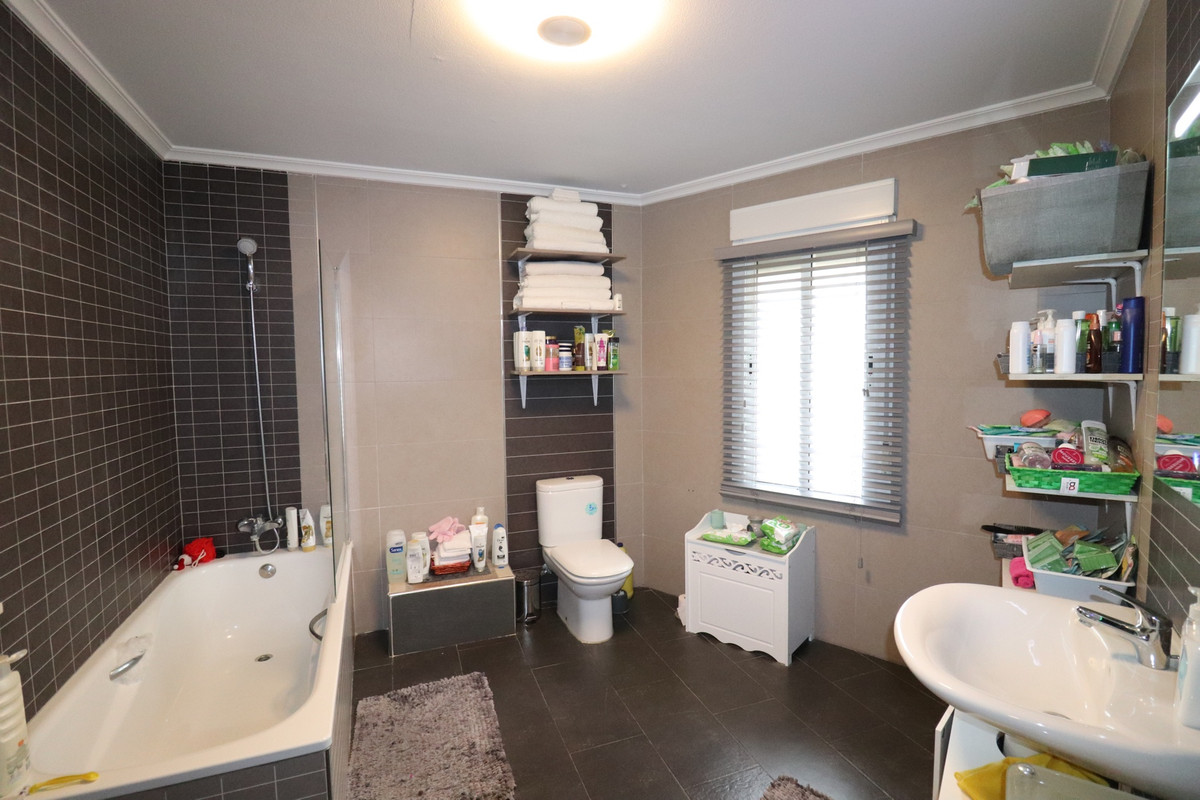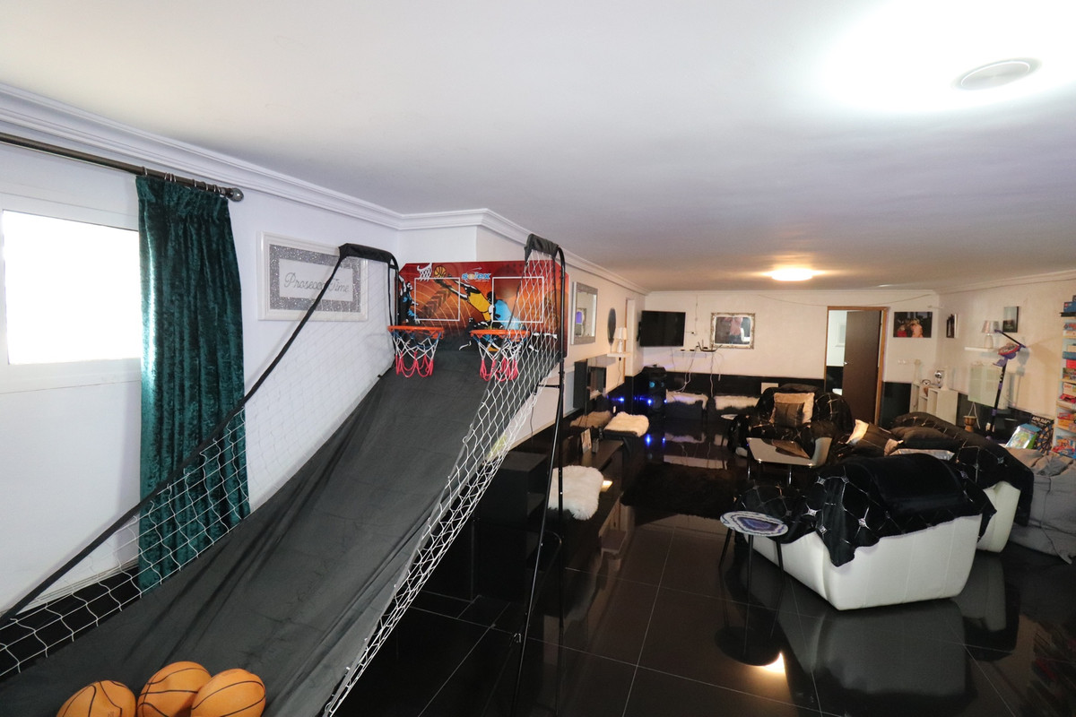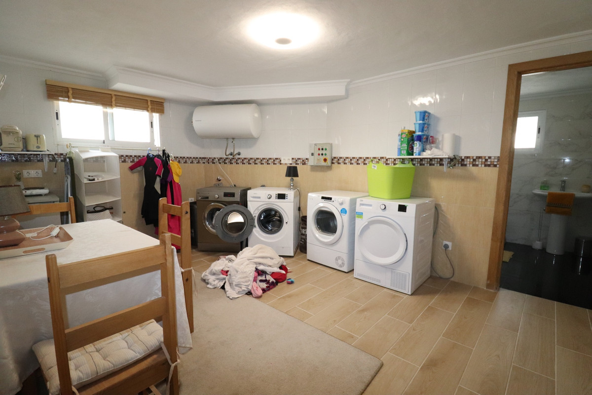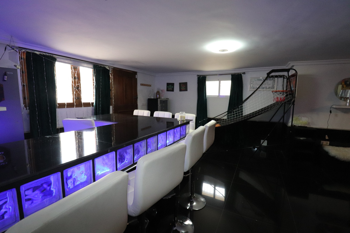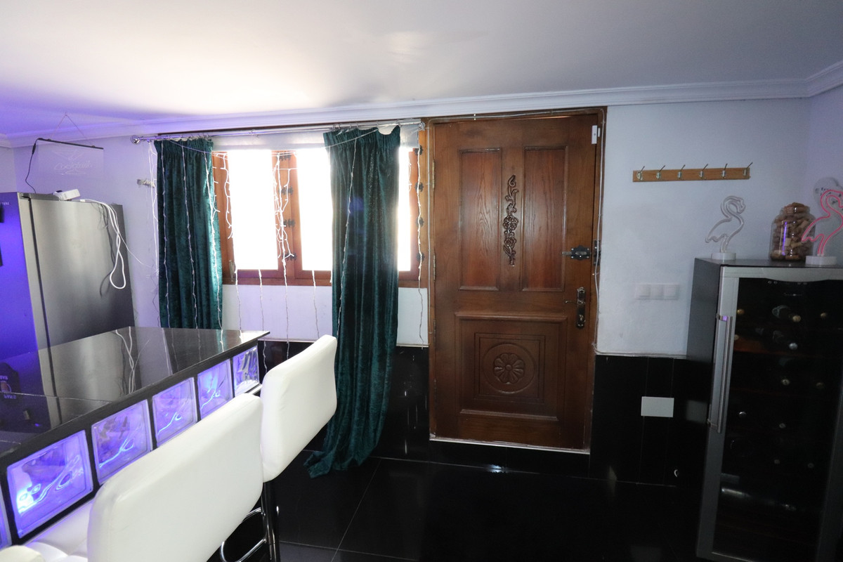 The ground floor has, just like above, 3 bedrooms and a 4th is being used as a walking closet/shoe area. A very spacious living room with direct acces to a kitchen that currently functions as a laundry room and a bathroom with a walk-in shower. Next to the living room is a separate functional room where a bar has been realized with a very spacious lounge area. This property is certainly suitable for a large family, 2 families or to be used as a commercial rental. There you can reach the lower floor.