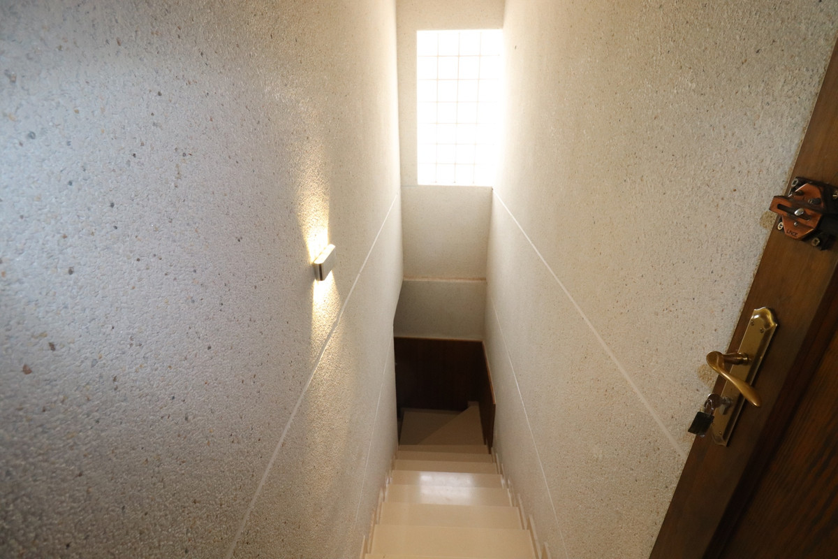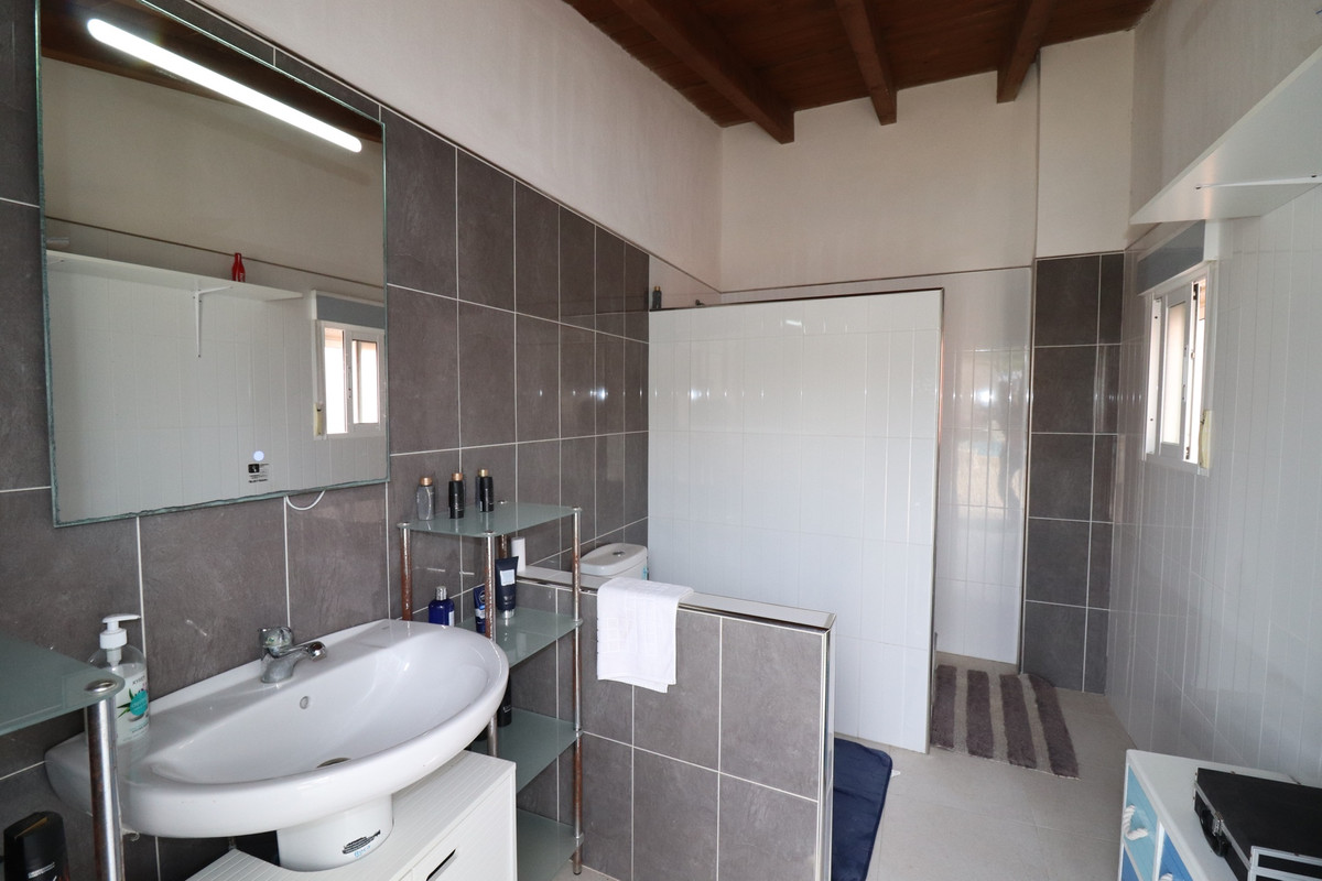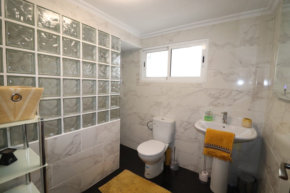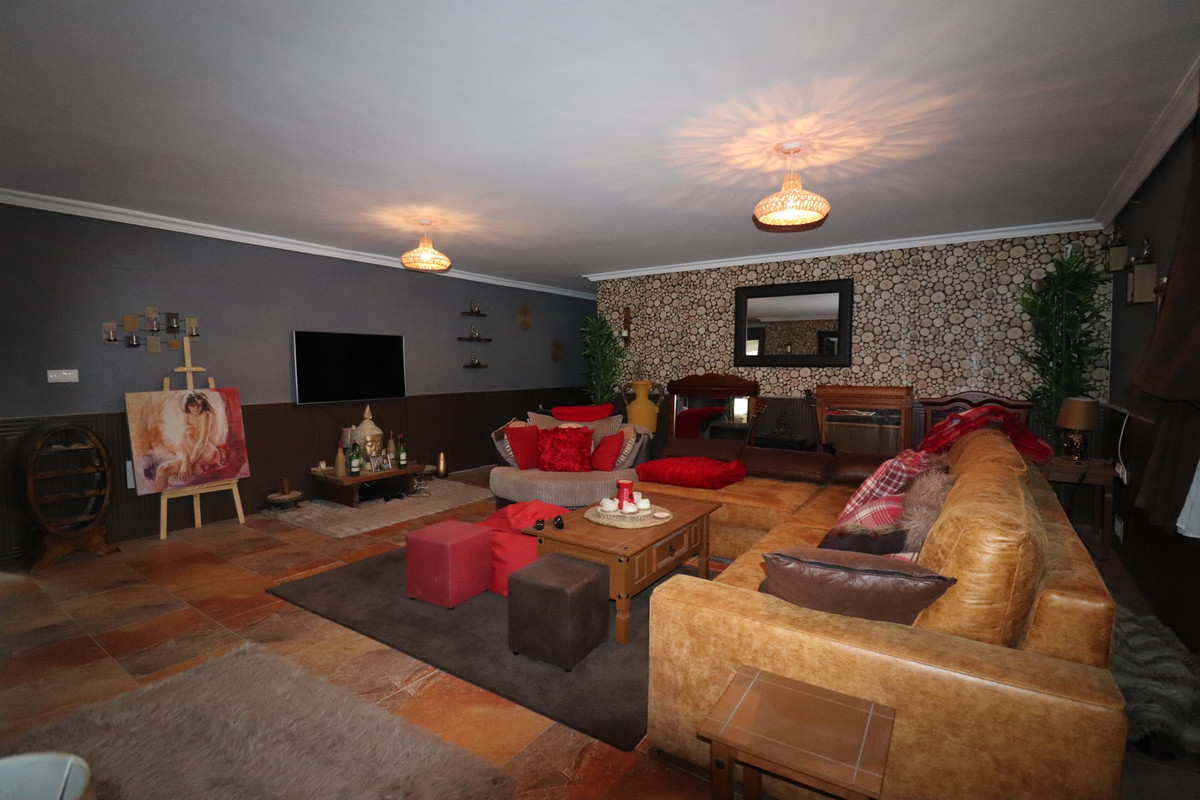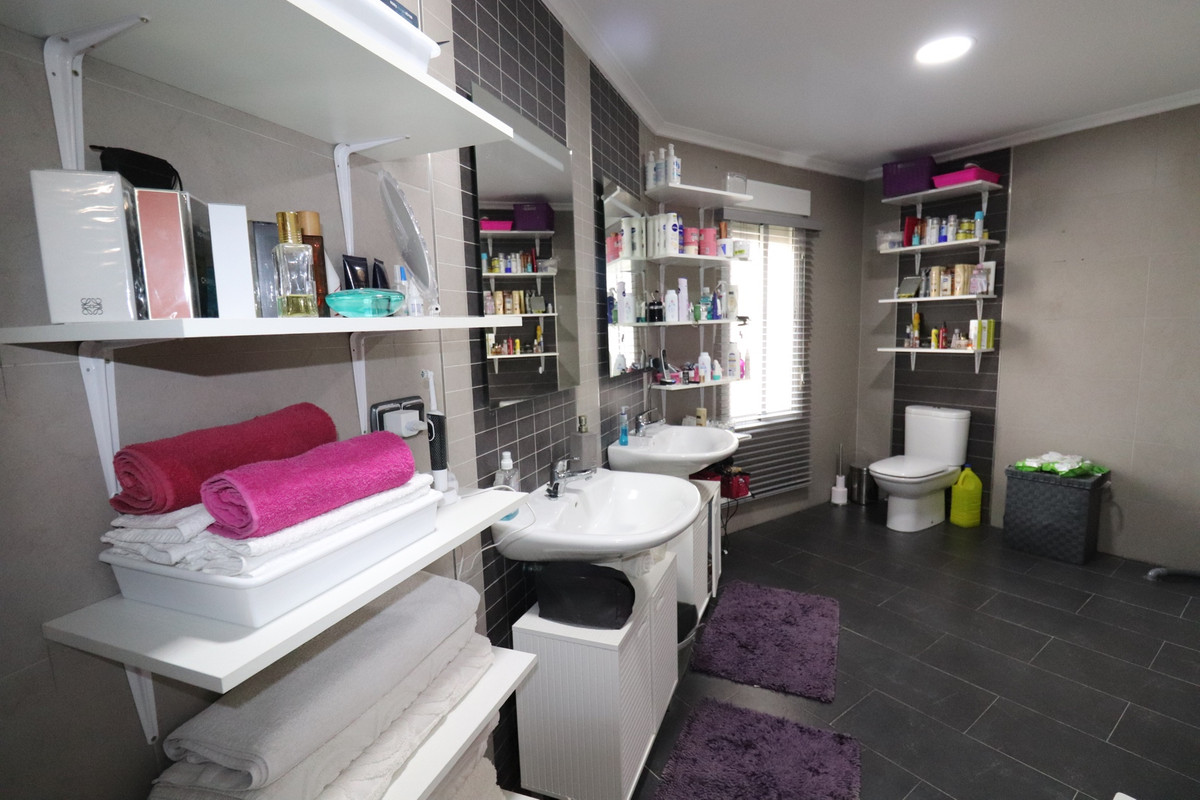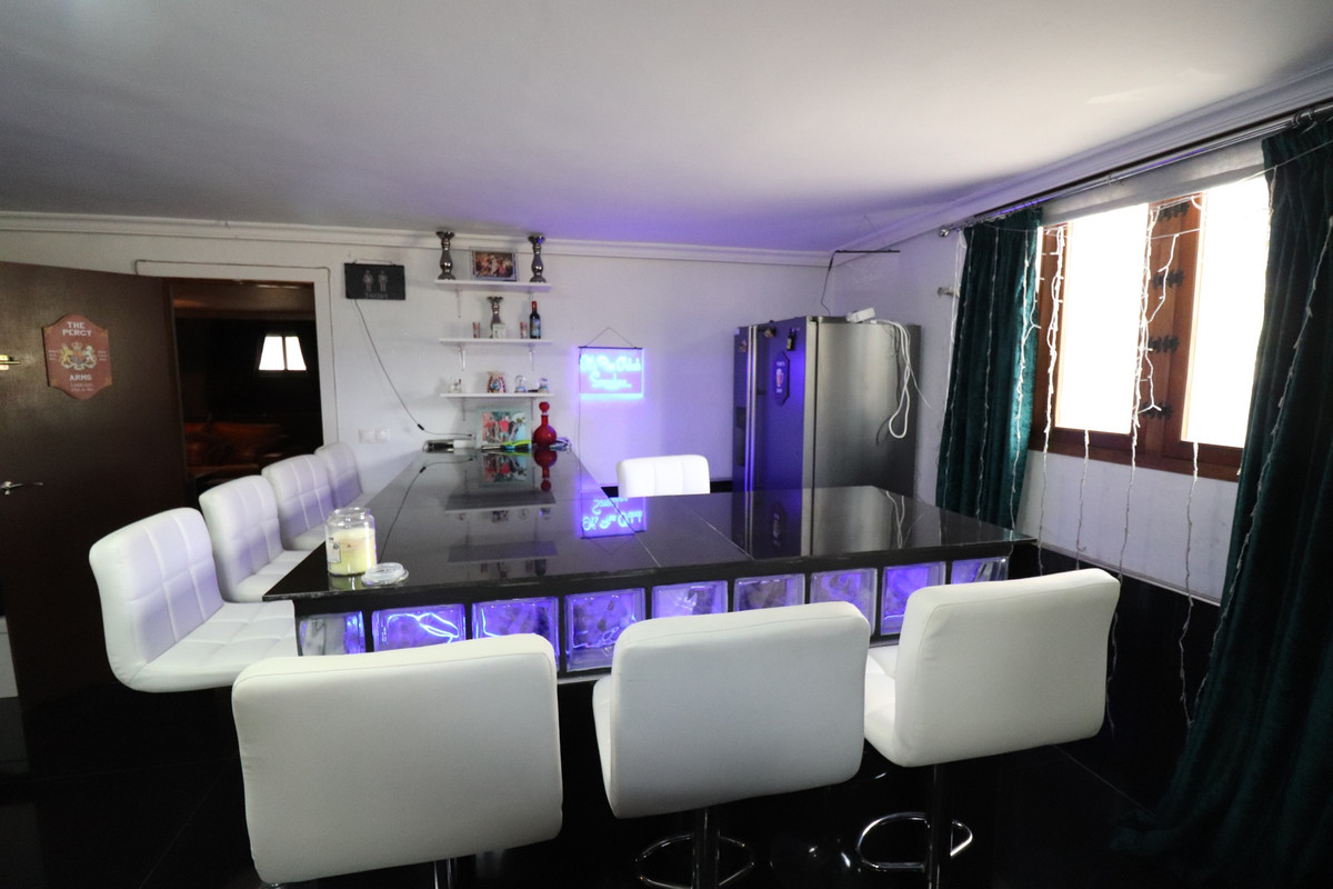 The ground floor has, just like above, 3 bedrooms and a 4th is being used as a walking closet/shoe area. A very spacious living room with direct acces to a kitchen that currently functions as a laundry room and a bathroom with a walk-in shower. Next to the living room is a separate functional room where a bar has been realized with a very spacious lounge area. This property is certainly suitable for a large family, 2 families or to be used as a commercial rental. There you can reach the lower floor.
