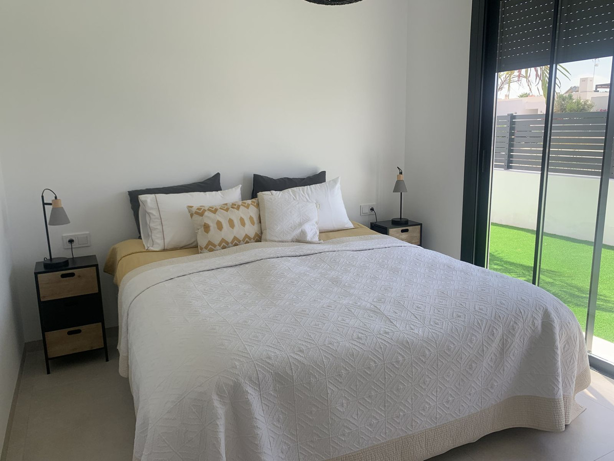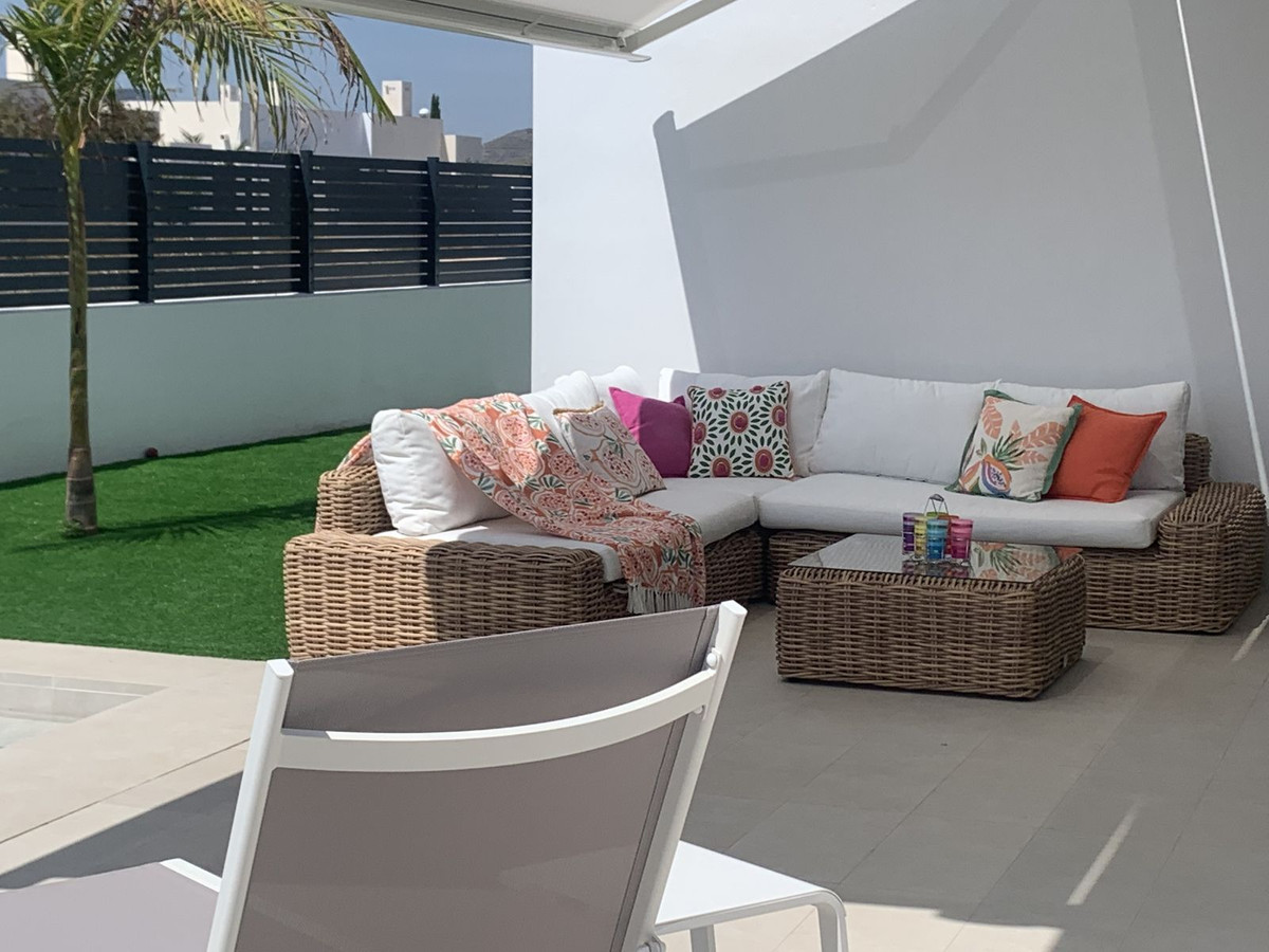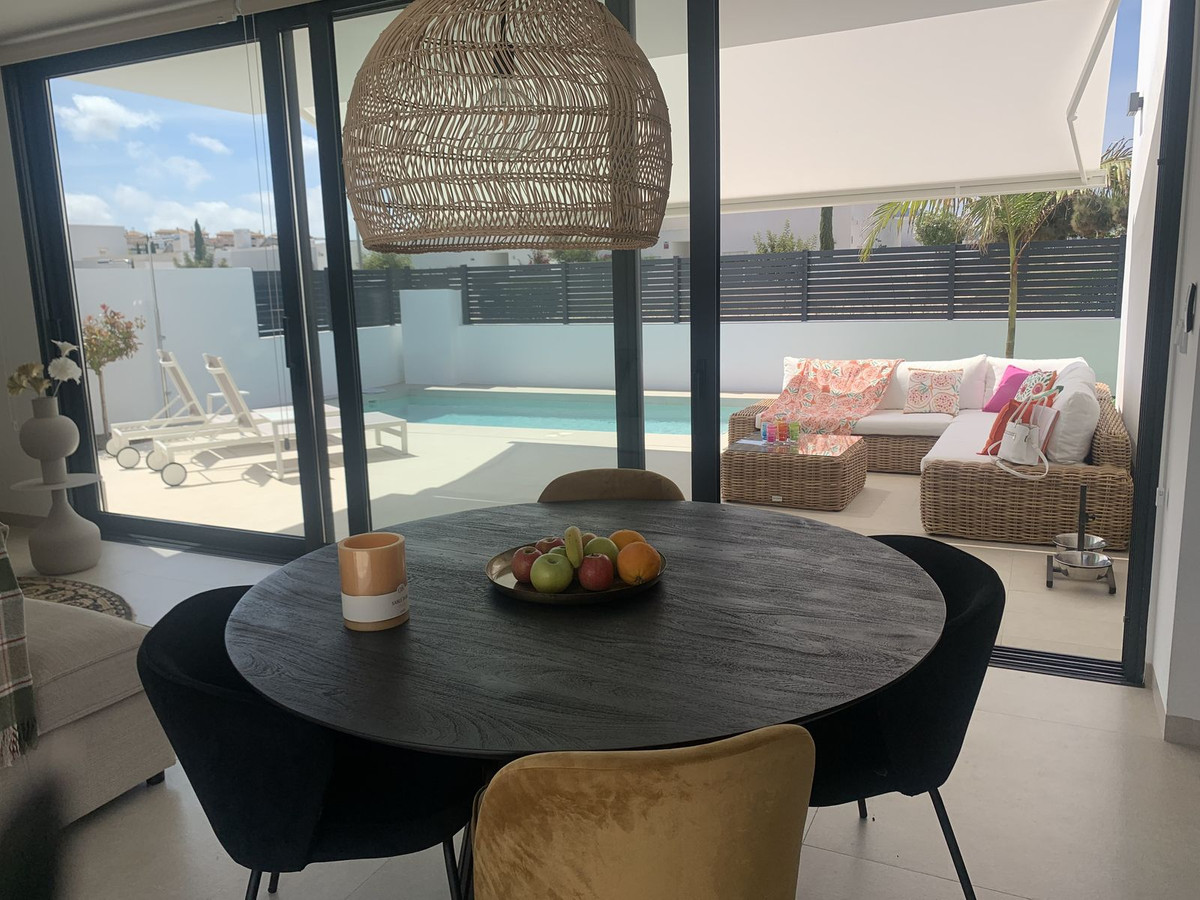 We are delighted to offer exclusively this stunning villa which is almost new and only 500 metres to the beach. The property is only 5 months old and sadly the owners are relocating due to unforeseen circumstances. The owners have added many extras from the original build. The property is L shaped, has 3 bedrooms and 2 bathrooms, a beautiful open plan living area, a huge solarium and a large front south facing terrace where you find the pool and a rear north facing terrace for a cooler dining area for those hot summer nights.