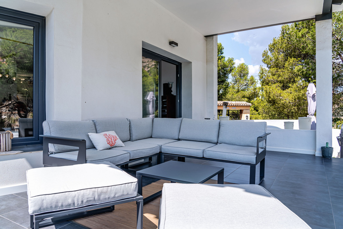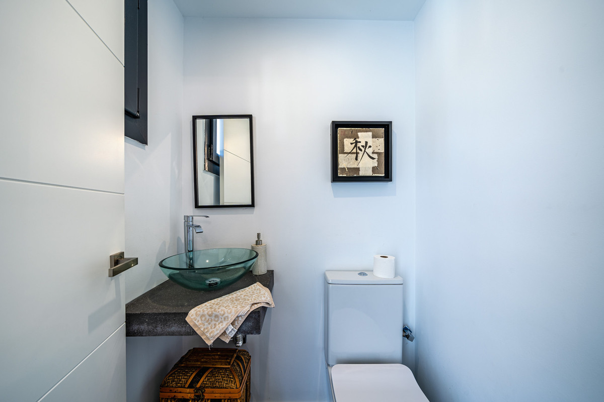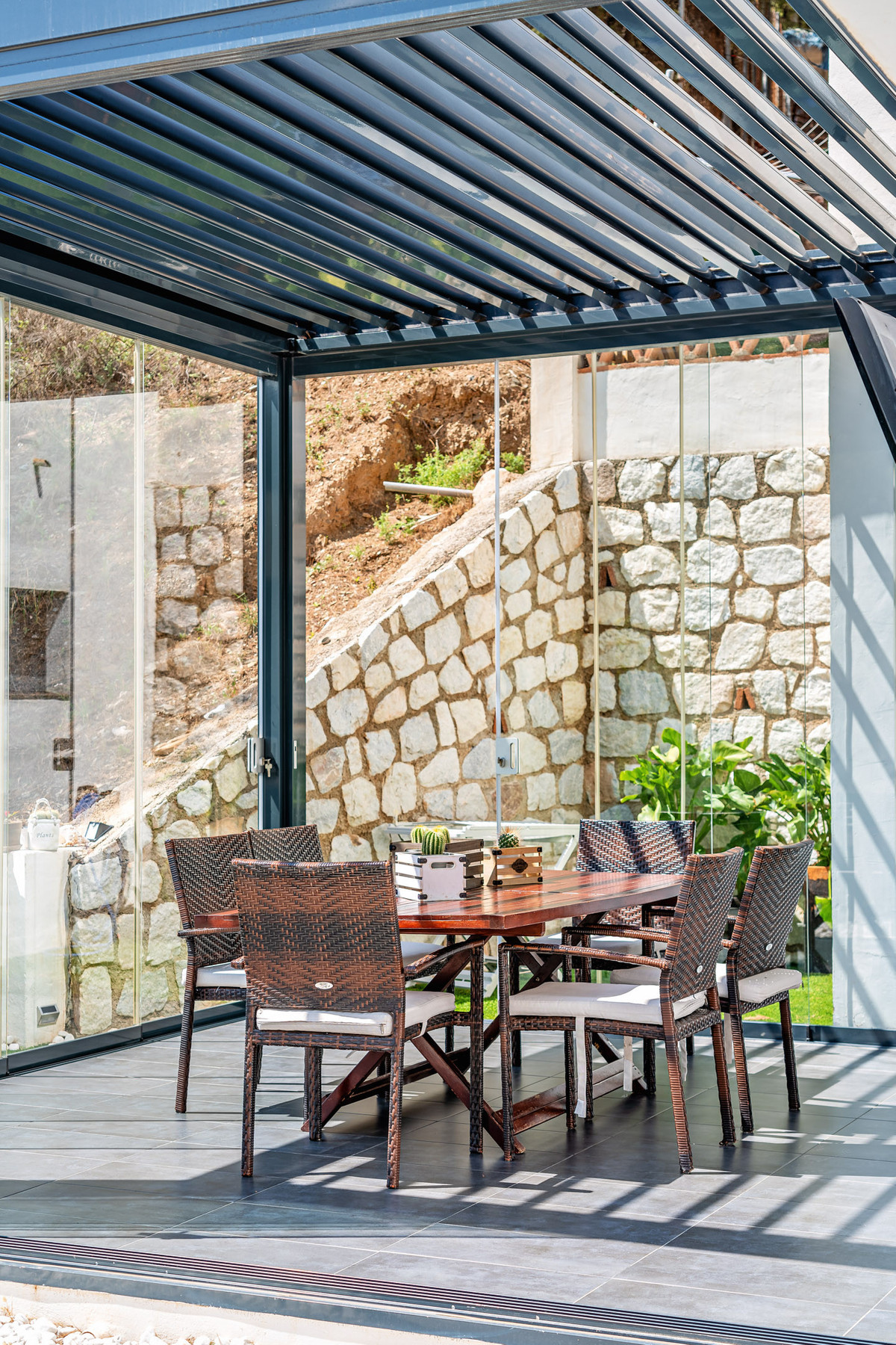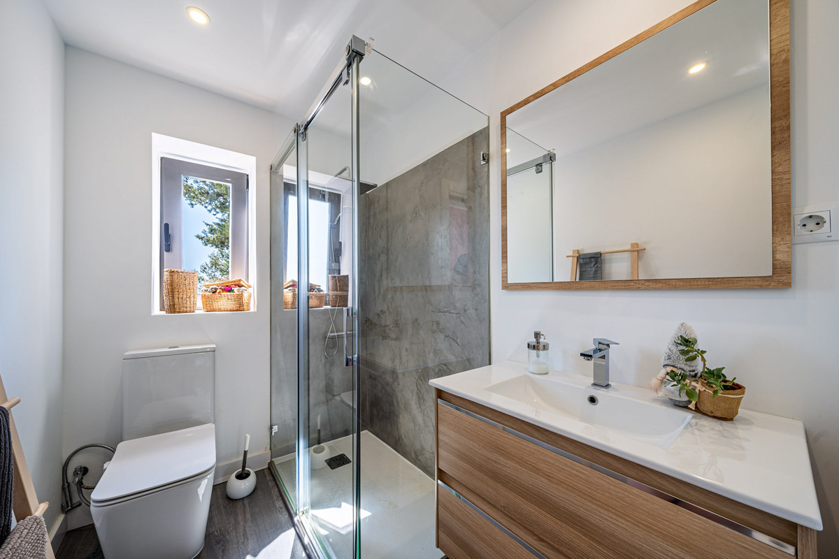 Upon entering the villa, you are welcomed by an inviting entrance hall that leads you into the spacious living and dining areas. Adjacent to the dining area is a fully-equipped kitchen with an adjoining pantry. Additionally, a guest toilet is conveniently located on this level. From the ground floor, you can access two delightful porches equipped with bioclimatic pergolas, allowing you to enjoy the outdoors in both comfort and style.