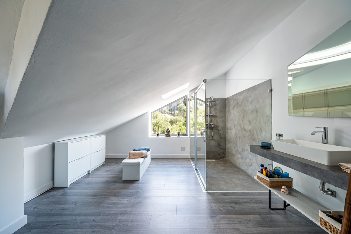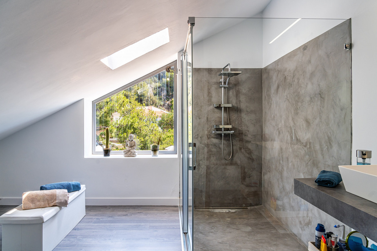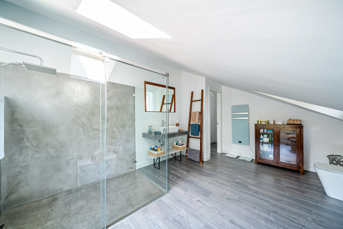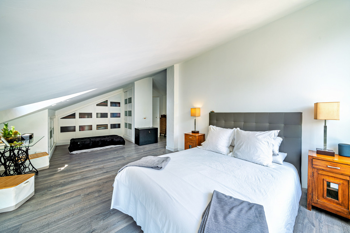 Descending a few steps from the porch, you will discover the private swimming pool enveloped by a beautifully landscaped 300 m2 garden with palm trees and a designated barbecue area. Going up to the first floor, you will find 3 bedrooms, of which 2 are en-suite and one incorporates a walk-in closet. Two of the bedrooms have access to the private terraces with garden areas. The beautifully designed attic floor features a large en-suite bedroom equipped with fitted wardrobes. The basement houses a garage for 4 cars, a storage and a multipurpose room with a toilet.