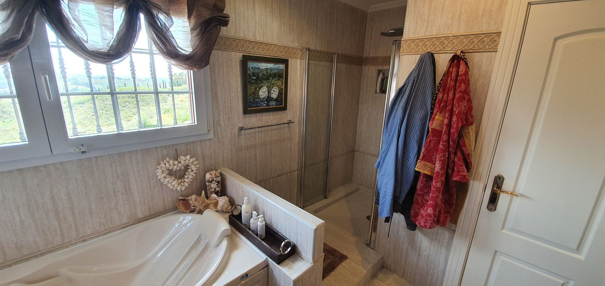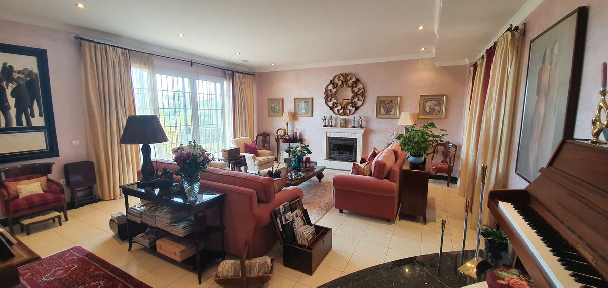 Andalusian style, immaculate property in great condition. 5 bedrooms, 4 bathrooms, 1 toilet, sauna, private infinity pool overlooking the sea. Very quiet and very private area to enjoy the tranquility and atmosphere of the area. The property consists of 623 m2 built on a 10,000m2 plot. 360º view of golf, mountains, sea and more.