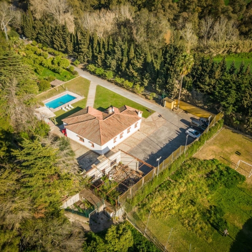 The particularity of this recreational farm is the construction that is on it of 1,070 m2 which makes it very exclusive property for being located in such a spectacular area, just 10 minutes drives from the white village called Jimena de la Frontera, a very close to Sotogrande, Marbella and Airport of Gibraltar. The property consists of different buildings with the main one of an Andalusian style cortijo, next to guest house bungalow, all of them with private kitchens and bathrooms, plus a machine tools' room and apart of this area we can find a huge tool shed, which can be used like a horse stables, or whatever you like, so close to a secondary house that could be used for the house keeper. All of this construction makes a total of 9 bedrooms, 5 bathrooms, several living rooms, all of them with fireplaces, terraces with different orientations.