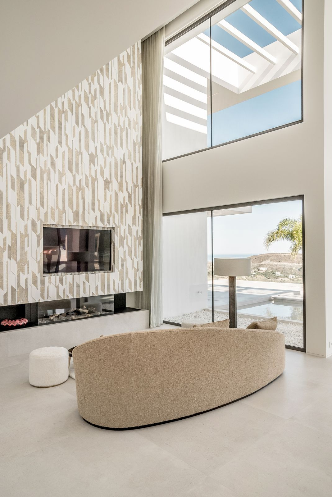 As you step into the living room, you are immediately struck by the grandeur of the space. The soaring ceilings, reaching an impressive height of 8-10 meters, create a sense of openness and airiness. Natural light floods the room from the huge windows that stretch from floor to ceiling, showcasing breathtaking panoramic views of the sea and the surrounding landscape. The living room seamlessly integrates with the terrace space, blurring the boundaries between indoor and outdoor living.