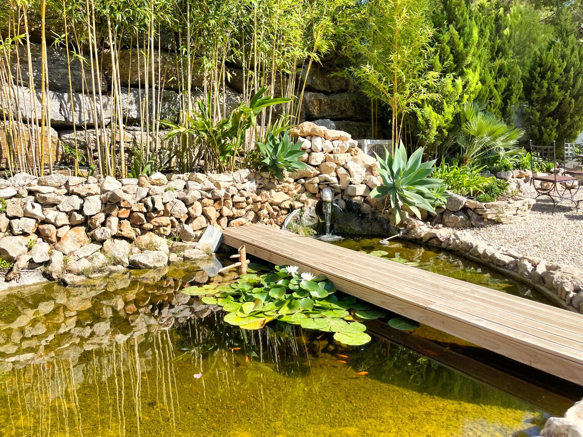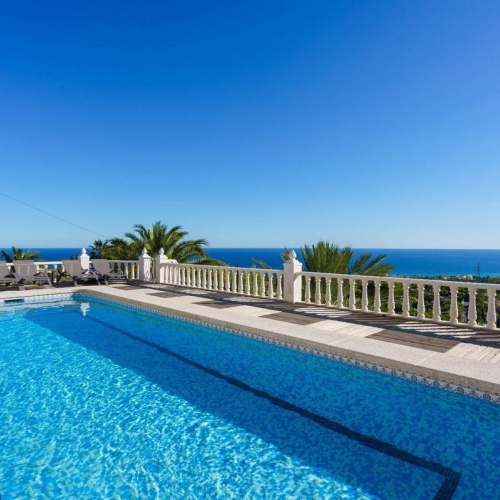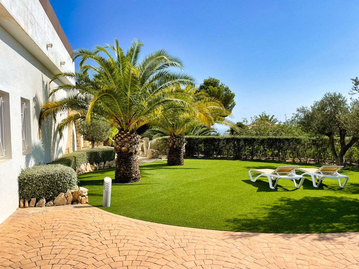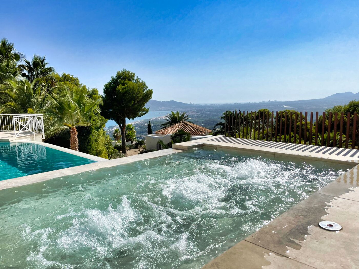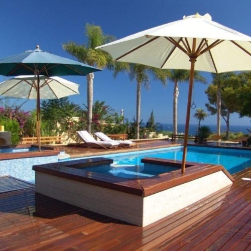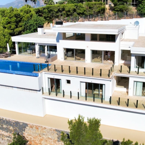 This luxury villa has been built on a large plot offering privacy, sea views and a good sun orientation. The impressive front door and the high beamed ceilings add a classy touch to the villa. On the main floor there is a large living/dining room, a glazed terrace, kitchen, three bedrooms, three bathrooms and a guest toilet. Downstairs you find another lage living/dining room, four bedrooms three bathrooms, a kitchen and laundry room. On the lower floor is the large covered terrace and the amazing infinity swimming pool with jacuzzi as well as a summer kitchen. For guests you find a separate house with one bedroom, a bathroom and a kitchenette. The villa has a large garage, marble floors with under floor heating and air-conditioning in all bedrooms as well as a small gym.