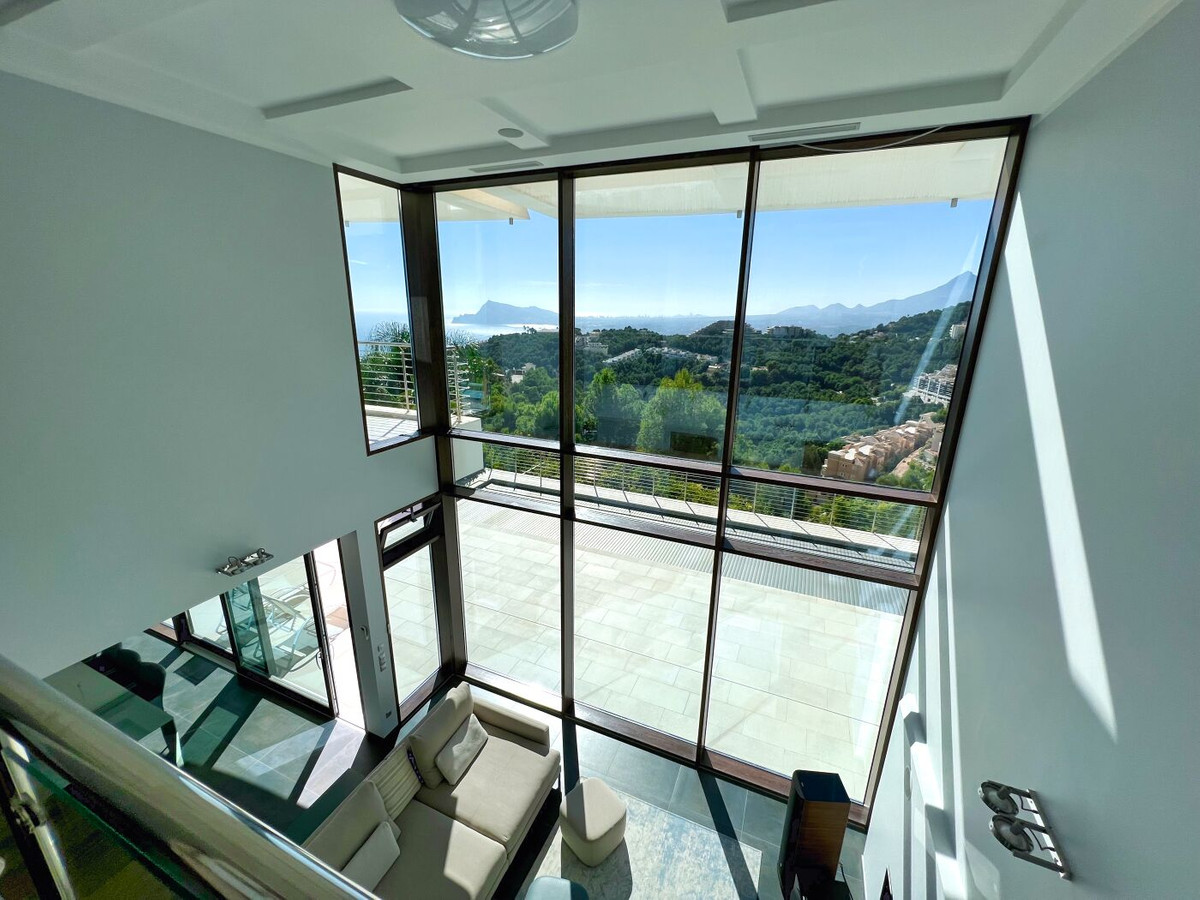 This modern premium class villa with stunning panoramic sea views over the Bay of Altea up to Benidorm is located in the elite gated community of Altea Hills with 24/7 security, next to luxury amenities such as a tennis club, golf course, yacht marine, and 5-star spa complex. The villa is located in the quietest area of Altea Hills, where you can't hear the AP-7. When you first look at the villa from the street, you see the captain's cabin, and the elongated green-and-blue, tinted windows, and you realize it looks like a sailboat! The 24 m long and 7 m high main facade is completely made of aluminum and wood with very good thermal and technical properties! The aluminum on the outside protects the wood from the sun and the inside is made of Canadian oak with special decorative treatment! The villa includes designer´s furniture: Villeroy & Boch, Duravit, Rolf Benz., is sold completely furnished, and is ready to move in! The house has a total of 323 m2 built on a 988 m2 plot and is distributed over four floors connected via an internal staircase and a lift for six people.
