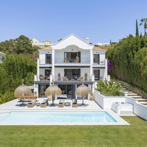 Brand new! A dream of an ultra modern and sustainable villa with panoramic views in the fastest growing area of La Alqueria with several new accesses, sharing in its community of 13 villas, more than 5.000 m2 of Mediterranean gardens. With its private infinity swimming pools suspended in the air, outdoor jacuzzi for 6 people, spacious lounges, al fresco terraces, en-suite bedrooms with walnut wardrobes and bathrooms of the latest design, this is the boutique villa for lovers of tranquillity and the visual beauty that the complex offers with its day and night lights and its open views of the sea. At the same time it is only 10 minutes away from Puerto Banus and its enormous movement and only 5 minutes away from supermarkets and services.