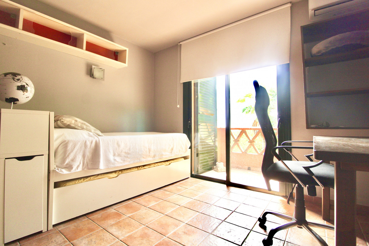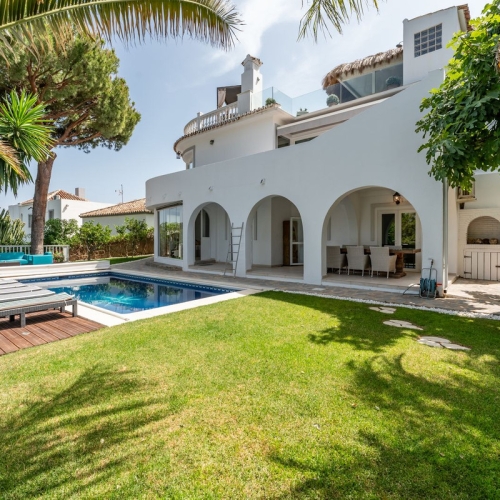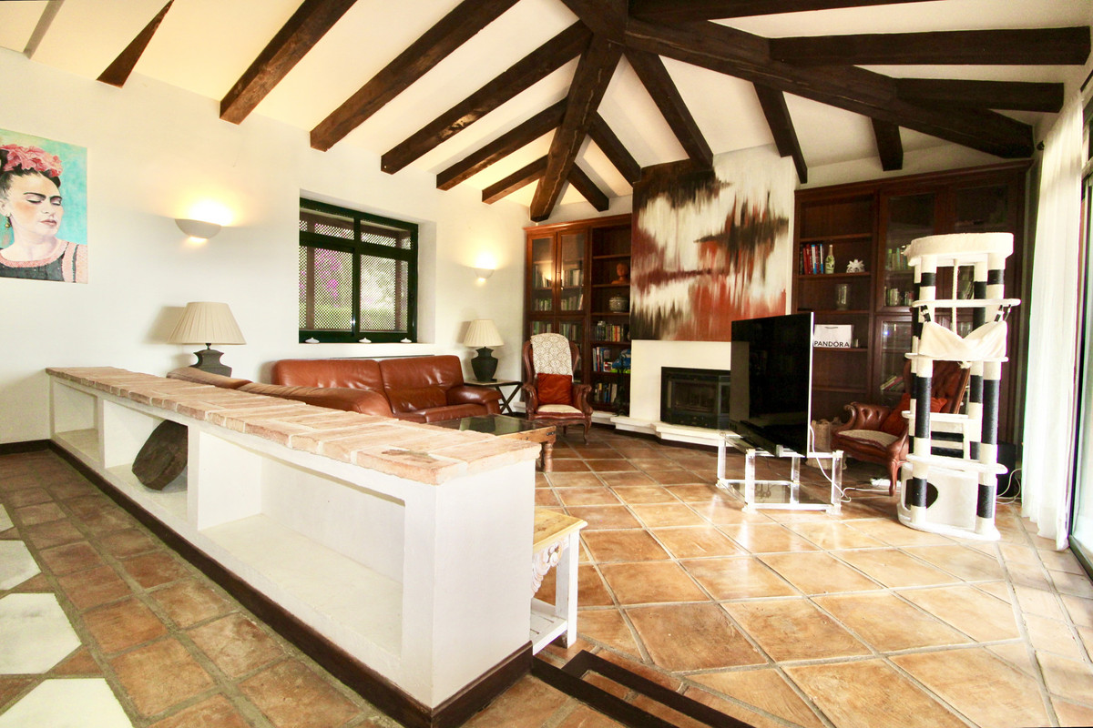 Large terrace with dining area and seating area in front of the pool. All surrounded by a large green area with magnificent trees.