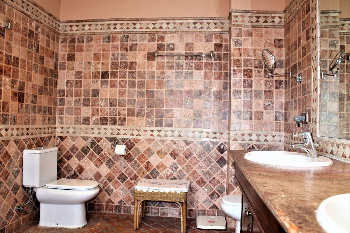 From the living room, you reach the bedrooms, and to the left of the hall, from the entrance, is a spacious corridor decorated with elegant lamps, leading to three large bedrooms with en-suite bathrooms. There is also a fourth, beautifully decorated guest bathroom.