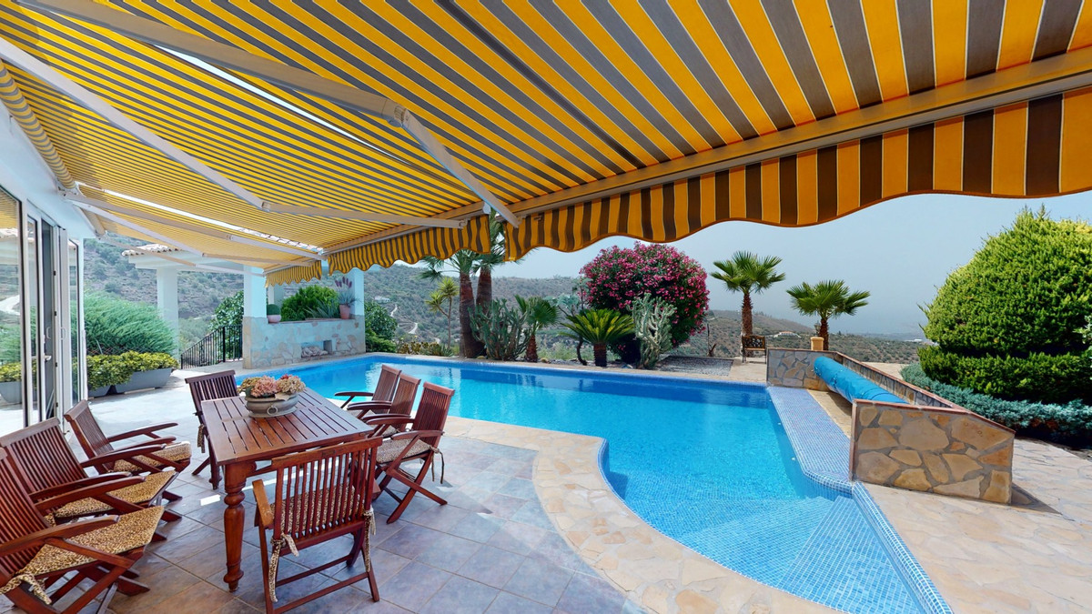 If it ́s your dream to live in a fantastic, high quality built villa with a pool and breathtaking sea views, then you have found the right property. This 280 m2 luxury villa offers everything you could possibly want. In the centre of the modern villa mixed with Andalusian style is a charming patio, which gives the house a special accent and provides beautiful lighting and atmosphere. It links the entire lower area of the property. From the entrance area, one side leads to a room used as an office, as well as a bedroom with an on-suite bathroom and the spacious living room with a fireplace and sea views. This in turn is adjacent to the dining area and the kitchen, from which you enter the hallway that is connected to the entrance area. This hallway also leads to the dressing room with an on-suite bathroom, where there is a sauna. Stairs lead from the entrance to the second floor. Here you will find the large master bedroom with an on-suite bathroom and a winter garden. External stairs lead to the outdoor area, which gives this room a separate entrance. The wonderful outdoor area offers a double garage, as well as a laundry room, which is also used for storage. Right next to the inviting pool is a gym with bathroom, as well as a glass fronted annex that serves as a lounge area with an outdoor kitchen. The perfect place for celebrations and dinners with family and friends. On the 19,500 m2 property there is also a paddock, with shelter and its own driveway, for keeping horses. It ́s located below the house. The driveway also leads to a small riding arena with three horse stalls, a tack room and a shower for the horses. You have free design possibilities of the spacious property. Whether it is to plant a fruit and vegetable garden, expand the area of horse keeping, possibly convert the riding arena to a tennis court, volleyball or small soccer field, even something completely new. The choice is entirely up to you. We are pleased to be able to present this dream property to you soon, either personally or via virtual viewing. Because this world is unique - just like our Axarquía. In Andalusia. On the Costa del Sol. Here, on the sunny side of life...
