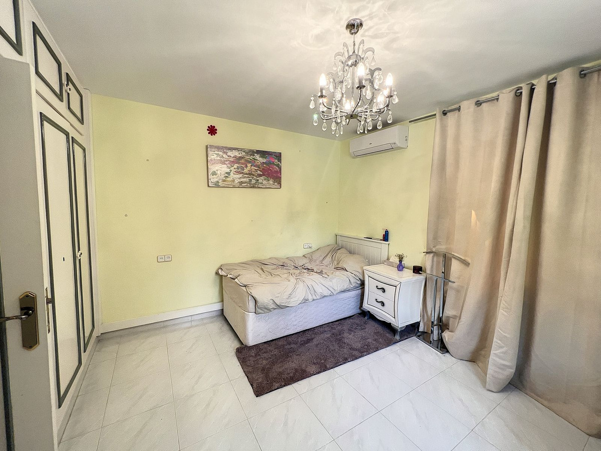 Moving downstairs, you'll discover the vast master bedroom, featuring an oversized en suite bathroom and a walk-in closet for your convenience. Two more well-appointed bedrooms, each with fitted wardrobes, and another full bathroom await. The property is equipped with air conditioning for both heating and cooling.